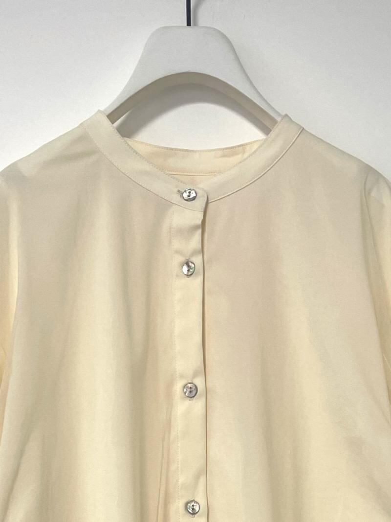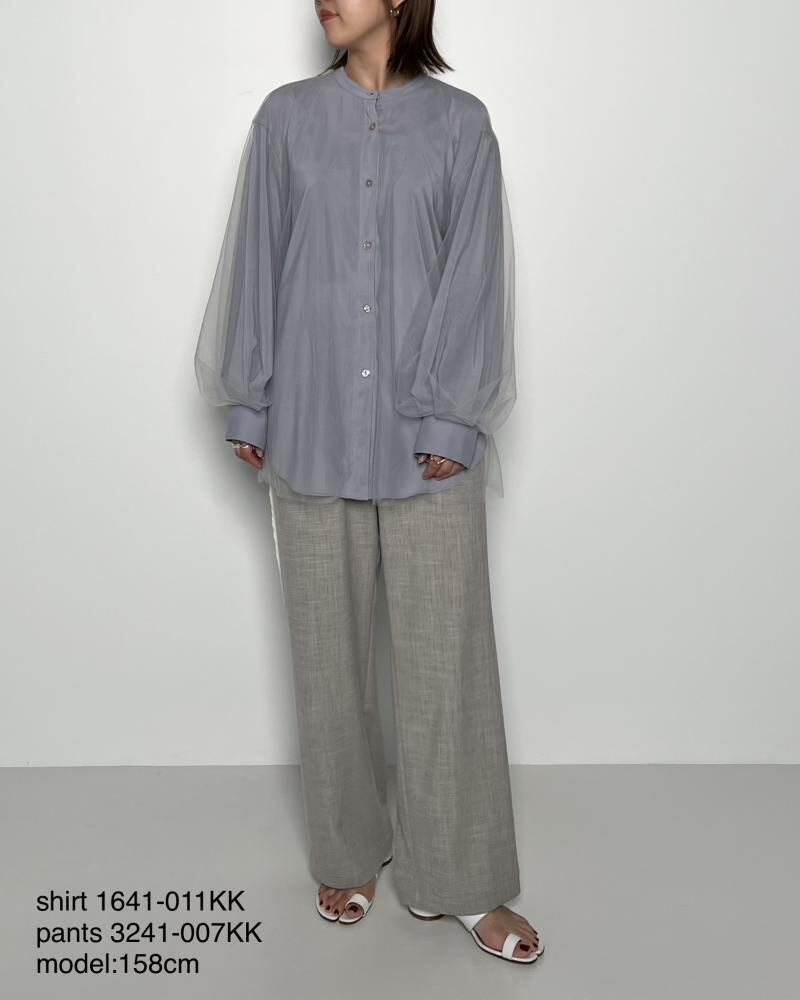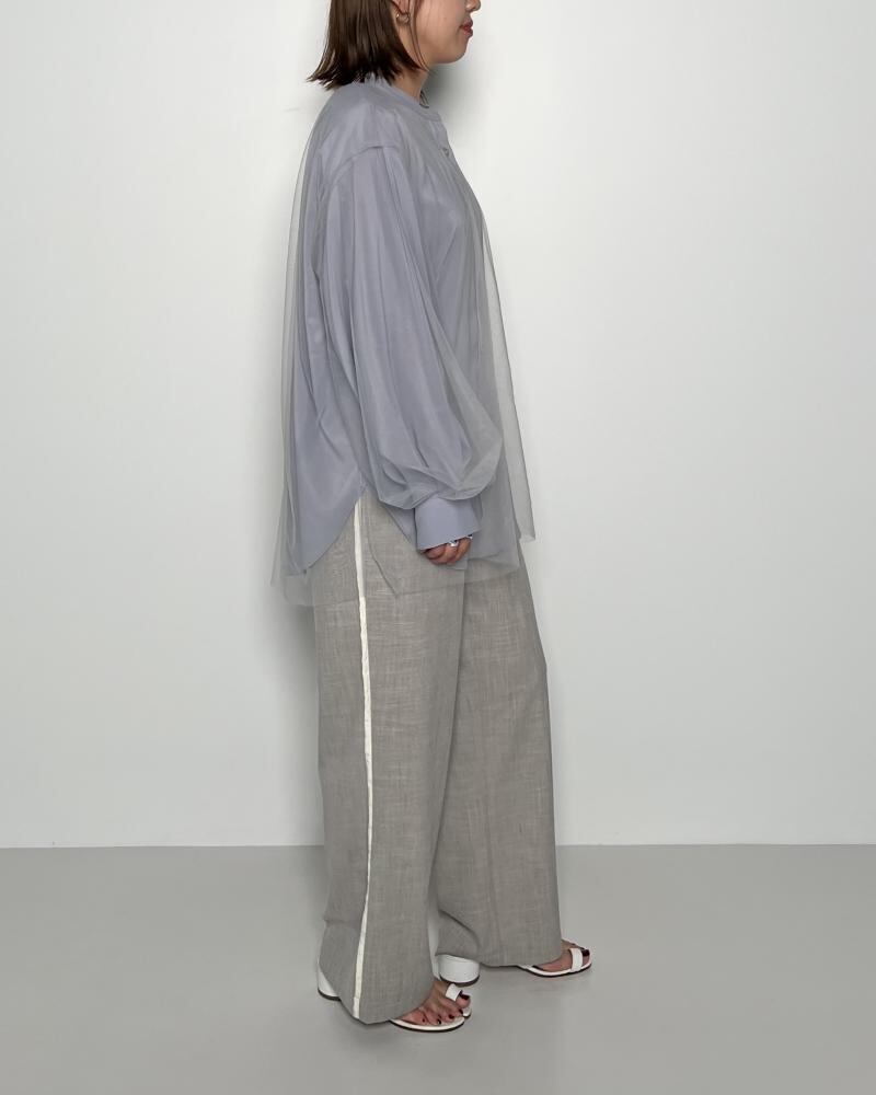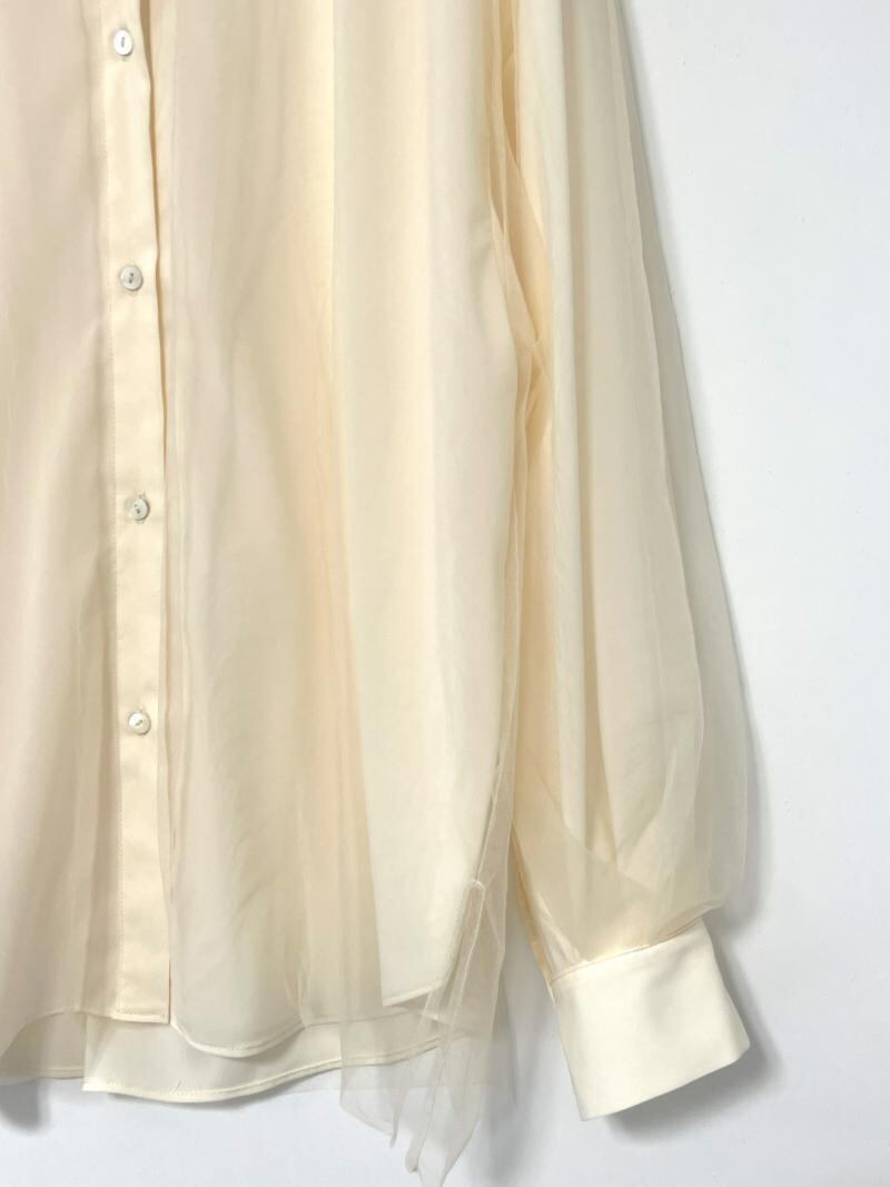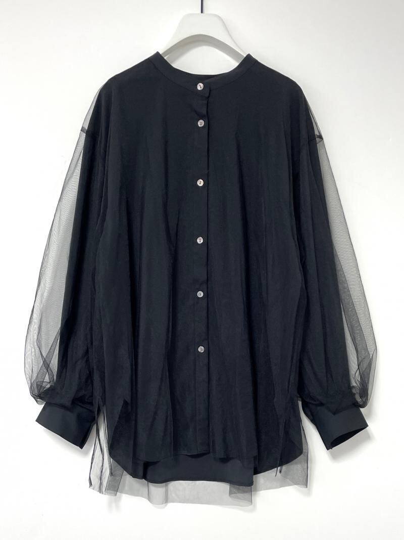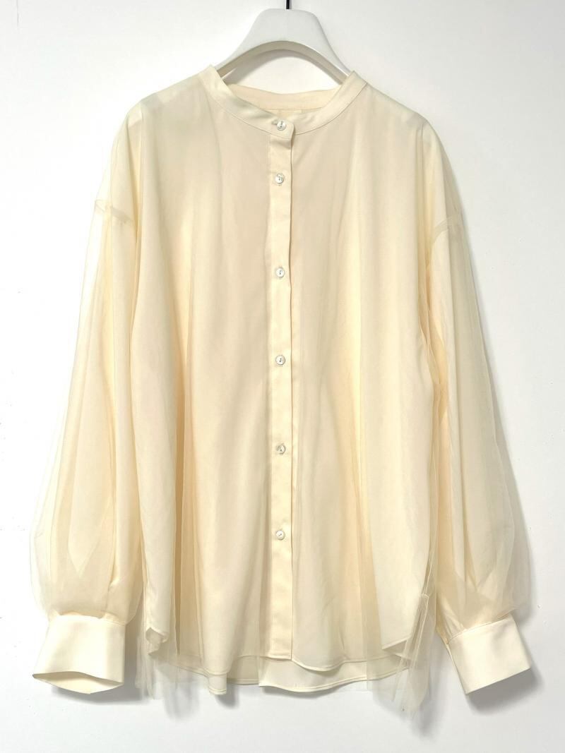 トレンドのチュールを着やすいバンドカラーのシャツに落とし込みました。