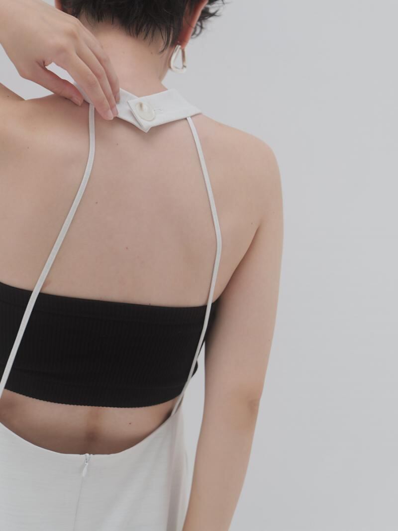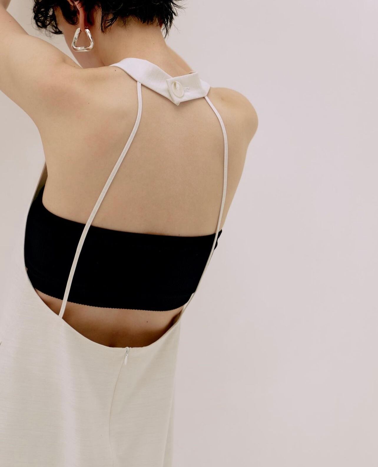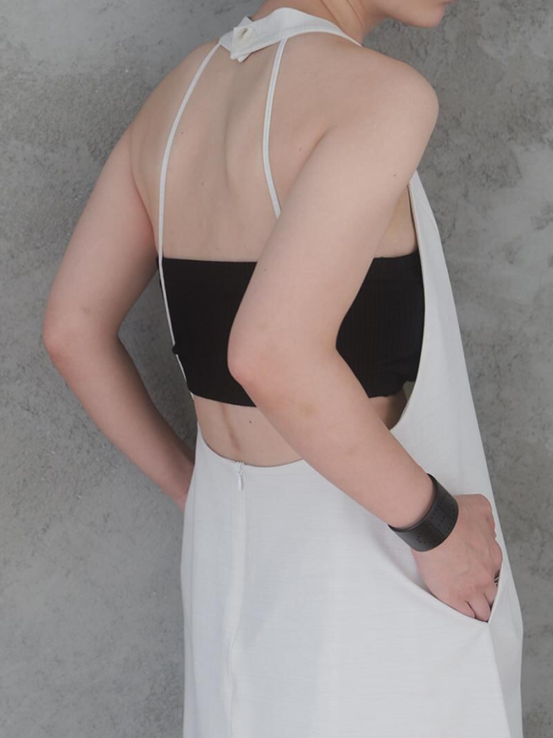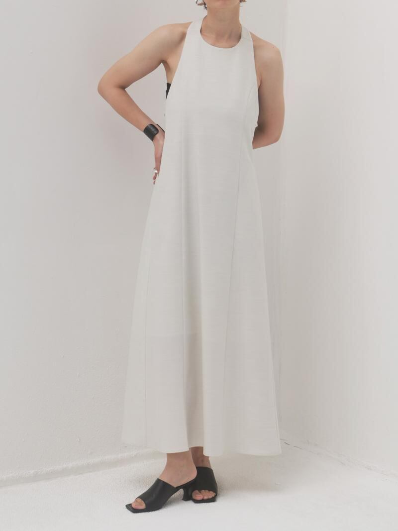ホルターネックを採用したワンピースは今年らしいトレンド感をプラスできるアイテムです。 一見ドレッシーになりやすいアイテムですが、中にニットやTシャツをレイヤードすることでデイリーに、キャミワンピースの延長としての着こなしがおすすめです。