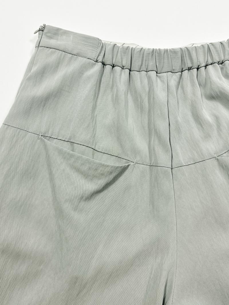 脇のファスナーあきや、後の切り込みポケットなど、デザインはあえてミニマルに仕上げて布の動きを最大限に活かしました。