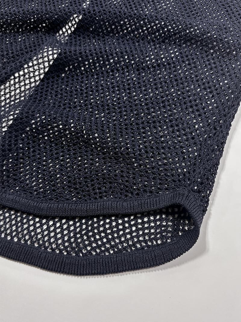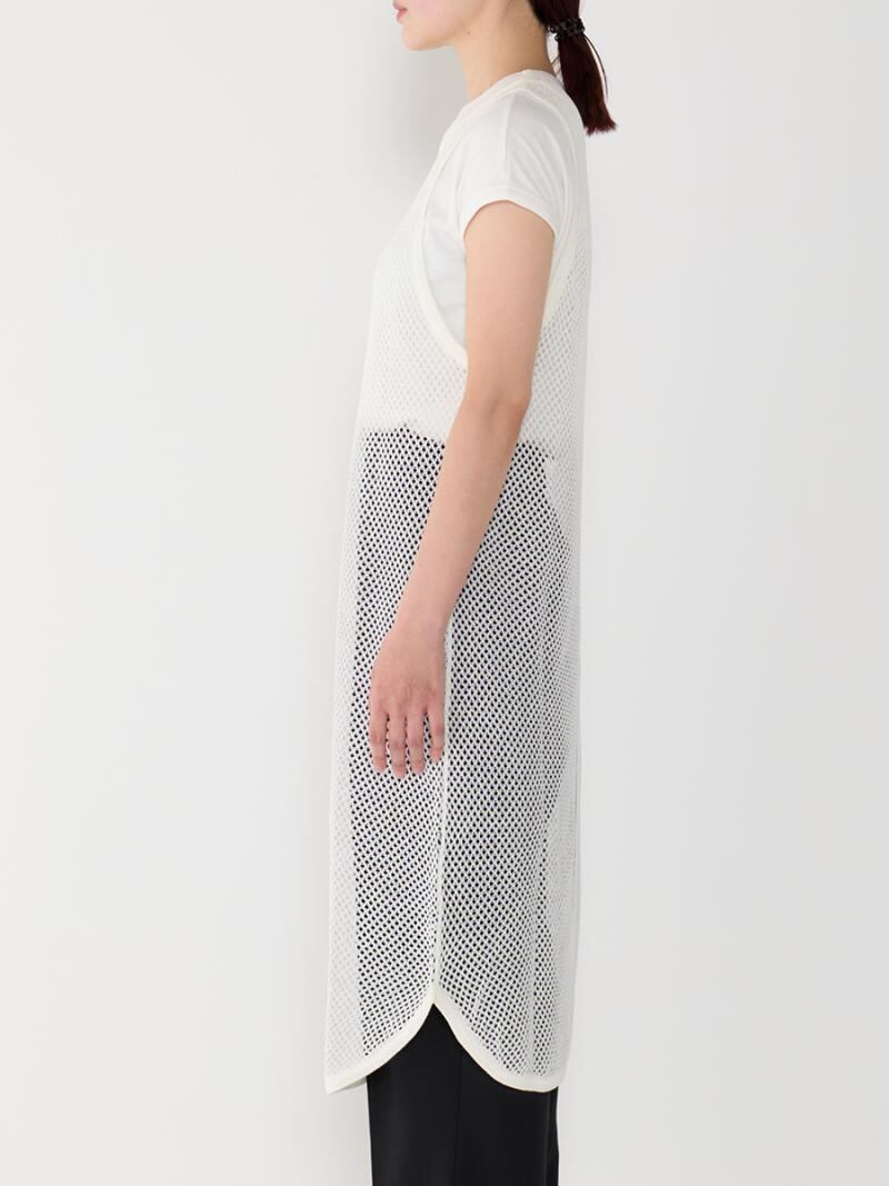 体から浮くので 透けていてもいやらしさを感じない、スポーティーでヘルシーなアイテムに仕上げています。タンクトップの形はアームホールのくりを深くとるアメスリデザインを採用、背中に入れた編地変化で作るラインと裾のスリットあきもスポーティーな印象をプラスするデザインポイントです。 ロングベストとしての着こなしがおすすめです。