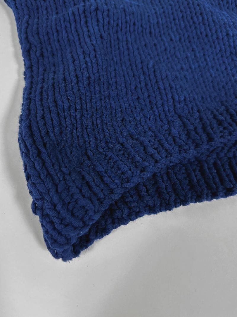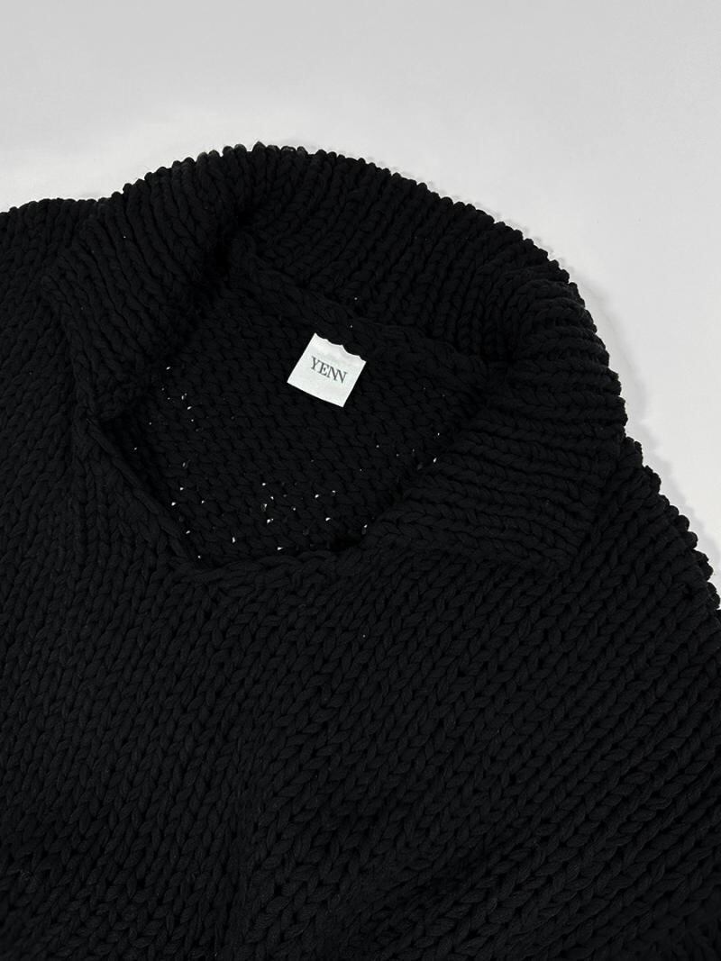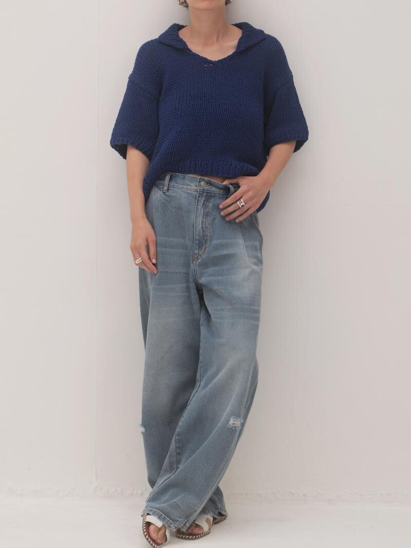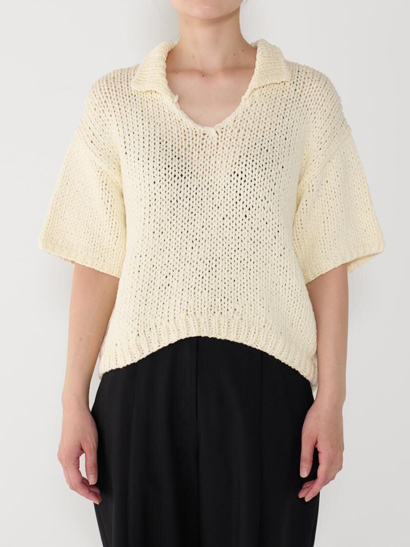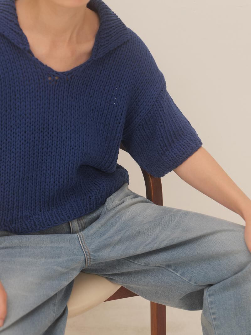 見た目は太くなり、中心が空洞になっているため、見た目よりも軽い仕上がりになるのが特徴です。 1目が大きいざっくり感とハンドニットならでわのクラフト感がポイントで、シンプルなプルオーバーでもしっかりとした存在感があります。 見た目ほど重くなく、綿100%の素材なので、カットソーに偏りがちな春夏のスタイリングのアクセントにおすすめの1枚です。