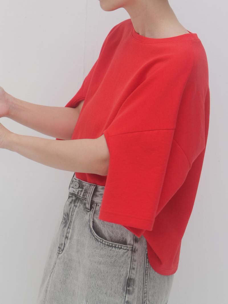 染色をしたあとの生地をタンブラー機で乾燥して仕上げることでふっくらしたボリューム感を出すタンブラー加工を施した生地を使用、空気を含むふくらみと自然なシボ感が特徴の素材です。