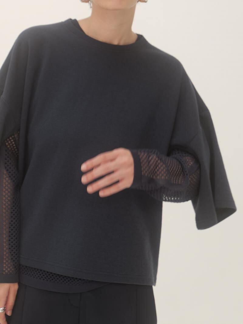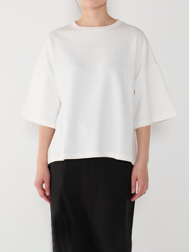 巾が大きめのボクシーシルエットのTシャツで、脇位置に大きなホールが開いているデザインになっています。通常のTシャツとして着ていただいたり、ホールから腕を出してポンチョのように着ることもできる2WAY仕様になっています。 夏の暑い時期でもホールが開いていることで涼しく着用いただける、デザイン・機能を兼ね備えた1枚です。 ダブル編みでしっかりしているので白でも透け感がほぼ無いのも大人にはうれしいポイントです。