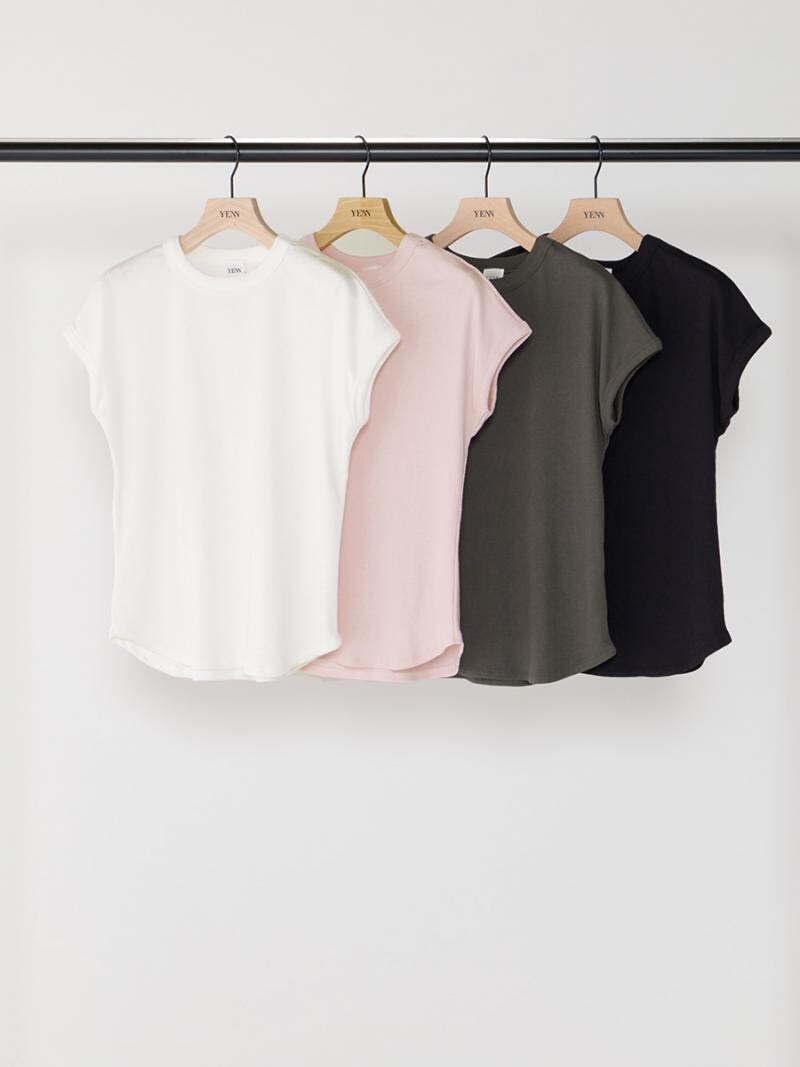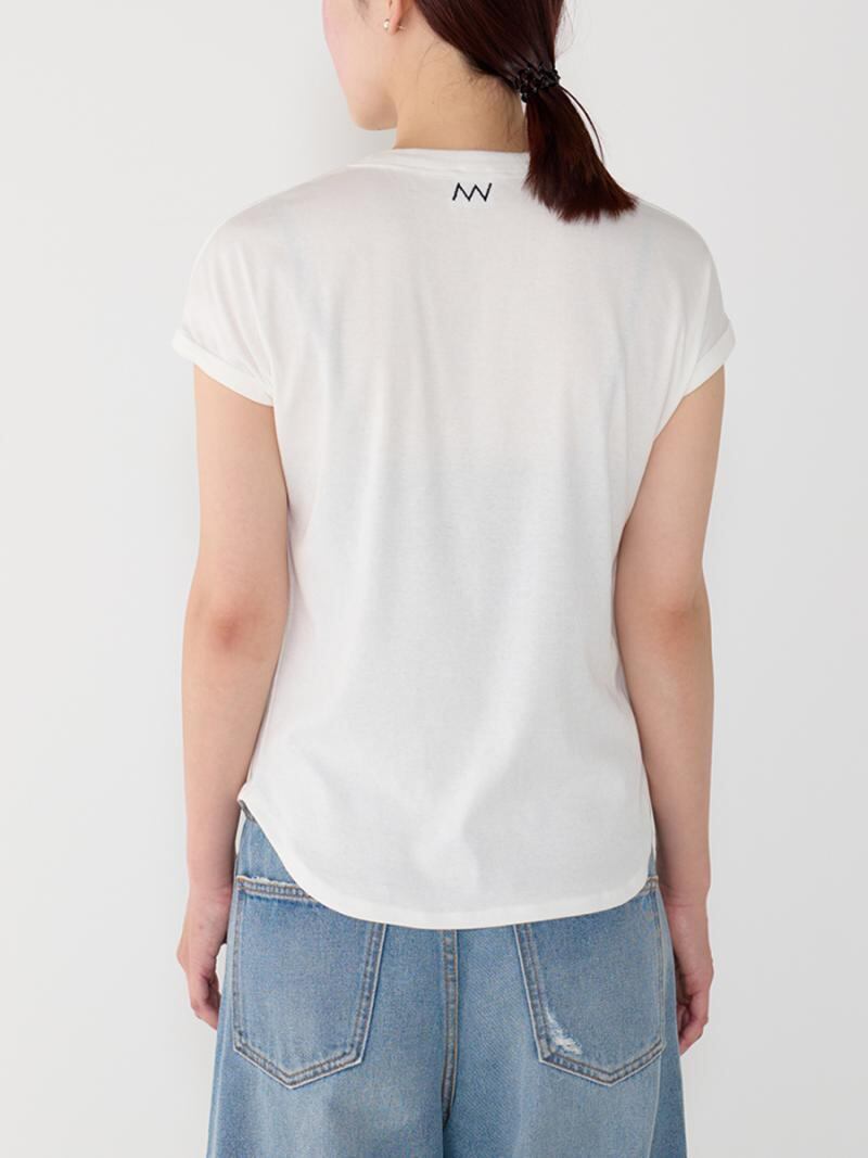 通常の糸と比較して格段に毛羽が少なく、シルクのような光沢や滑らかさがでるというのが特徴のコンパクトヤーンを使用したリブ生地を採用、上品な滑らかさのあるコットンリブは肌さわりも良くおすすめです。 タンクトップを1枚で着るのに抵抗がある大人のための、肩周りを包んで隠してくれる、すっきりとしたシルエットのTシャツです。 程よく体に沿うようにデザインされているので、レイヤードのインナーにも最適です。 後衿ぐりに施したワンポイント刺繍もほどよいアクセントに。 2色を重ねて着用するのもおすすめの着こなしです。