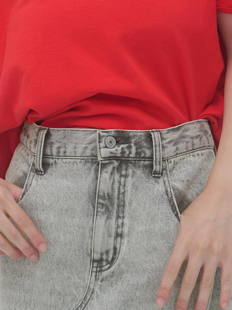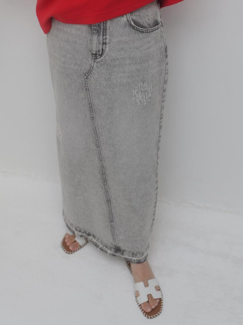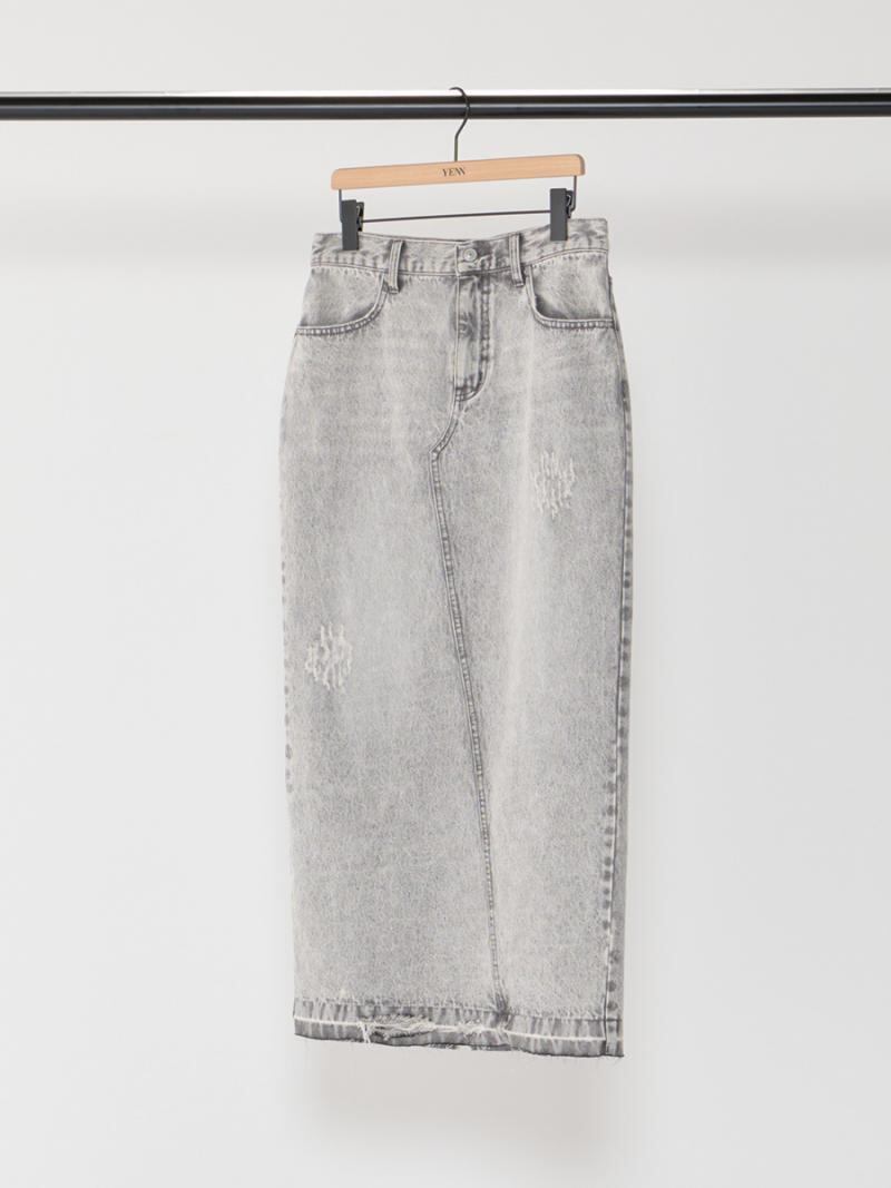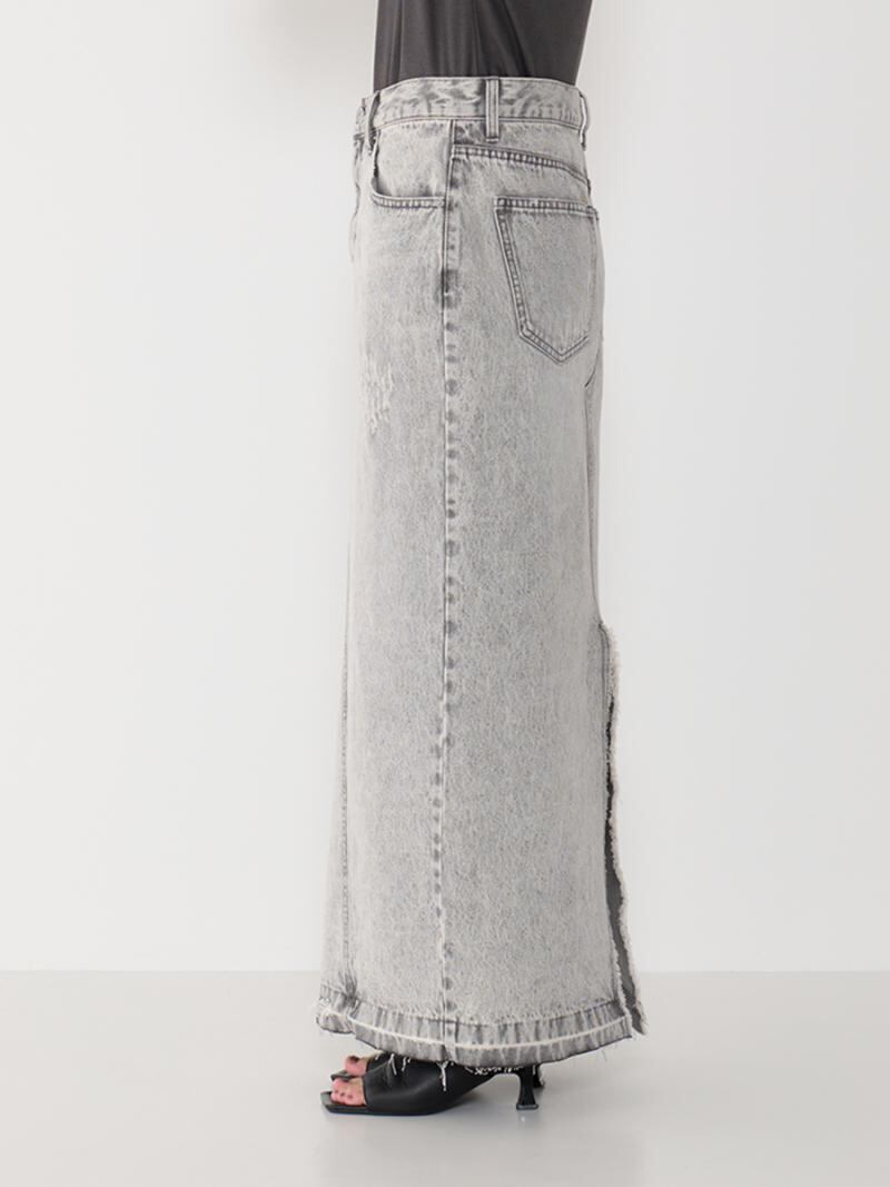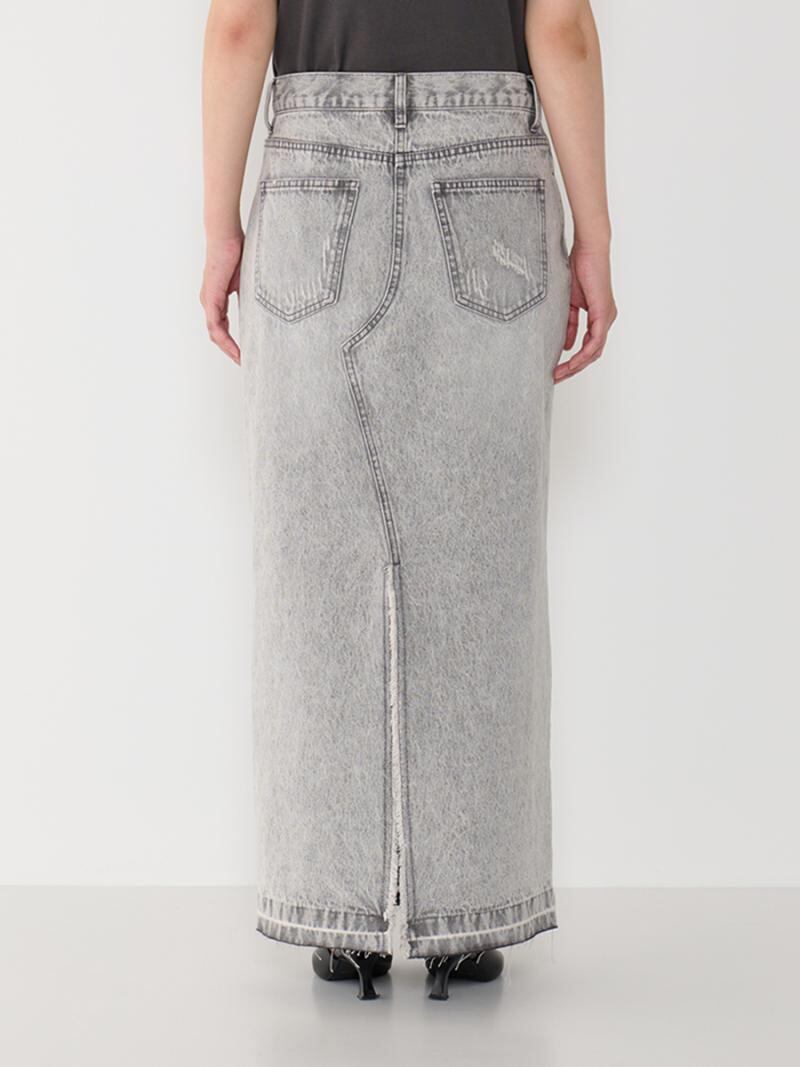 ケミカル加工を施したライトグレーカラーのマキシスカートは