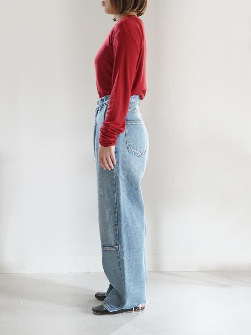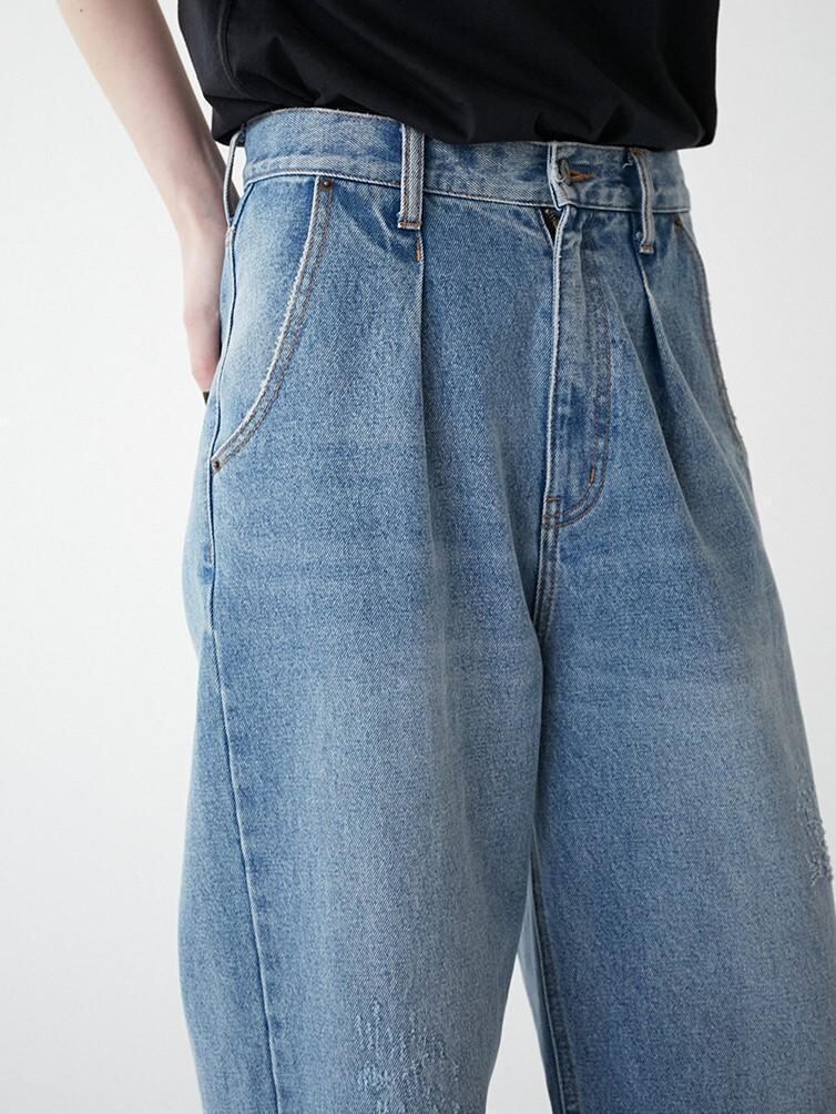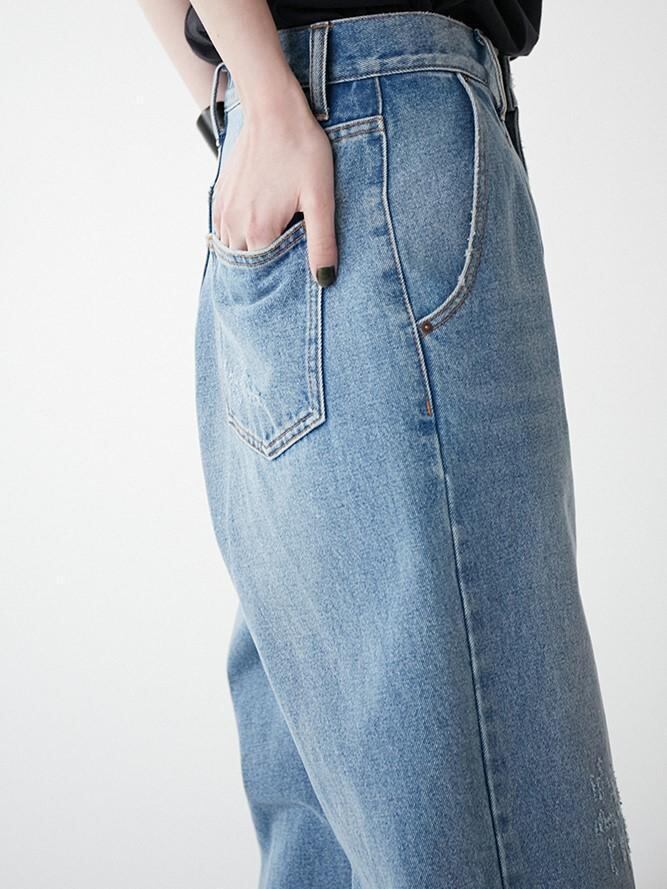 膝下にいれた切り替えデザインや、ところどことに施したさりげないダメージ加工など、こだわりのつまった1枚です。