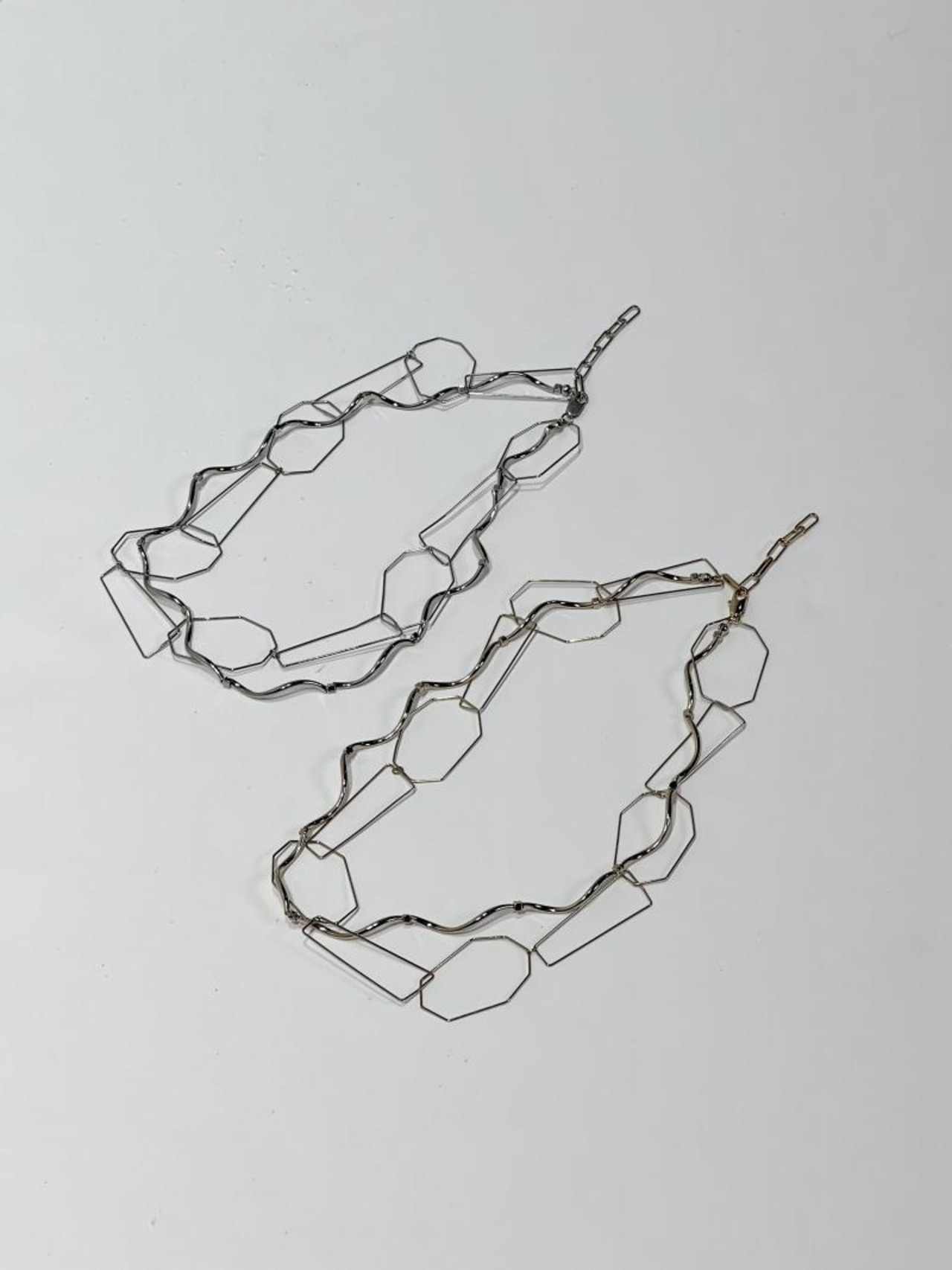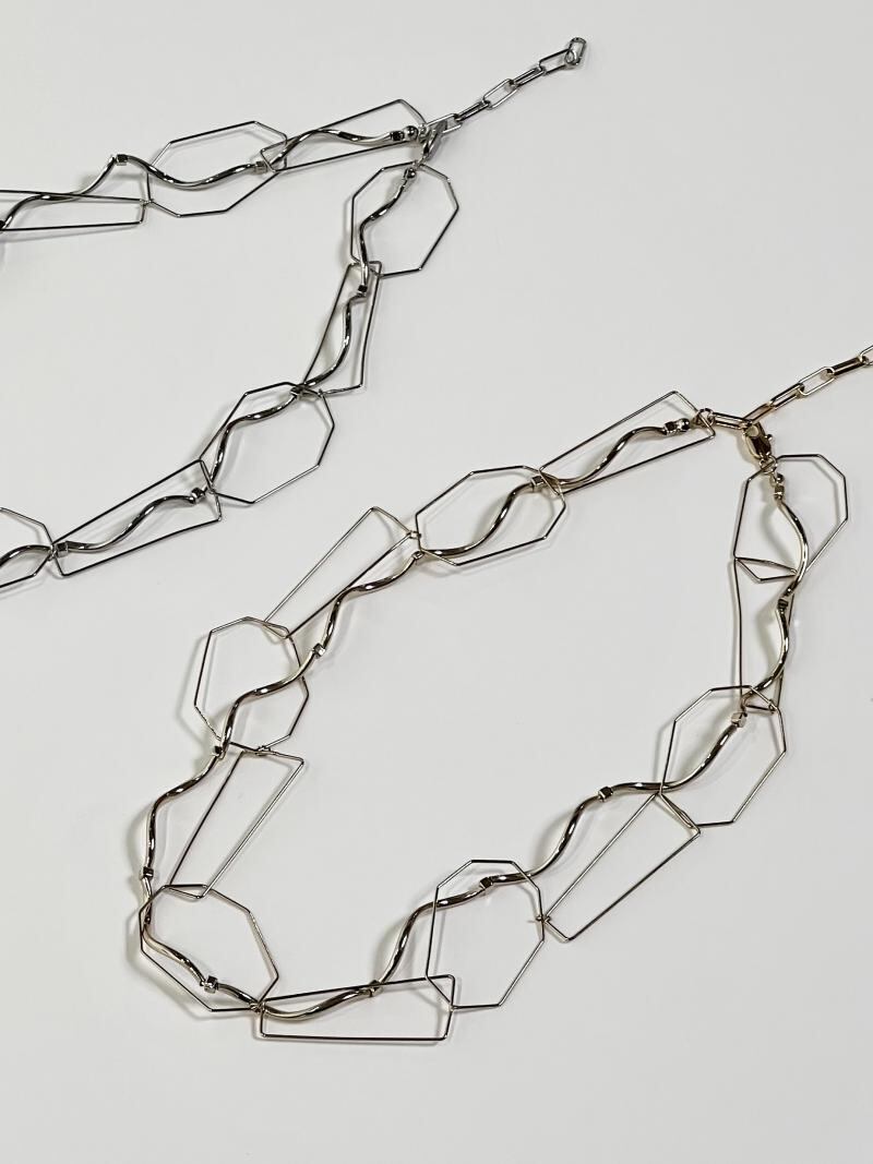 華奢なニュアンスネックレスが2連になっており、首元を華やかに見せてくれるアイテムです。程よいボリューム感を首元にもたせ、目線を上にスタイリングもバランス良く仕上げてくれます。コーディネートのアクセントにも。1連にしてご使用頂く事も可能です。