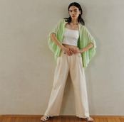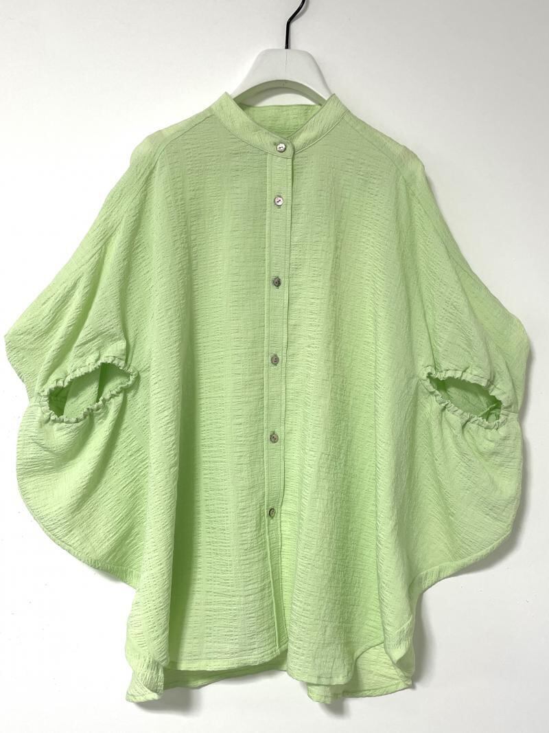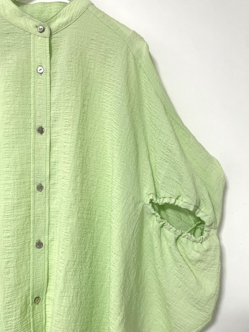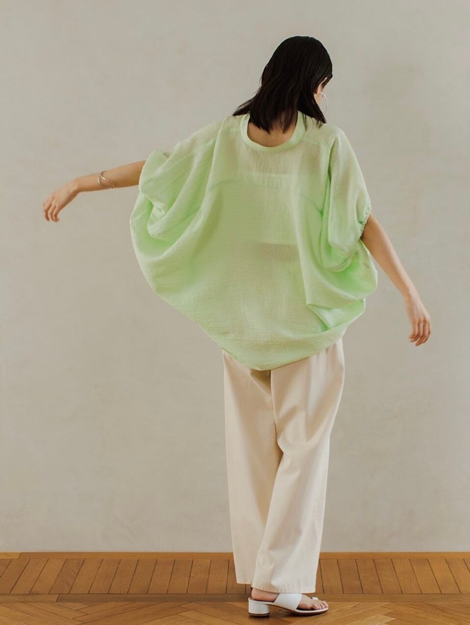 ワイドなサイズのドルマンパターンにし、袖口ゴム仕様にすることで、着用すると丸みのあるシルエットに仕上げています。袖口には複雑なタックを施し、袖口に程よい膨らみが出る様にしているのがポイントです。気になる二の腕部分を上手に隠してくれるのもうれしいポイントです。