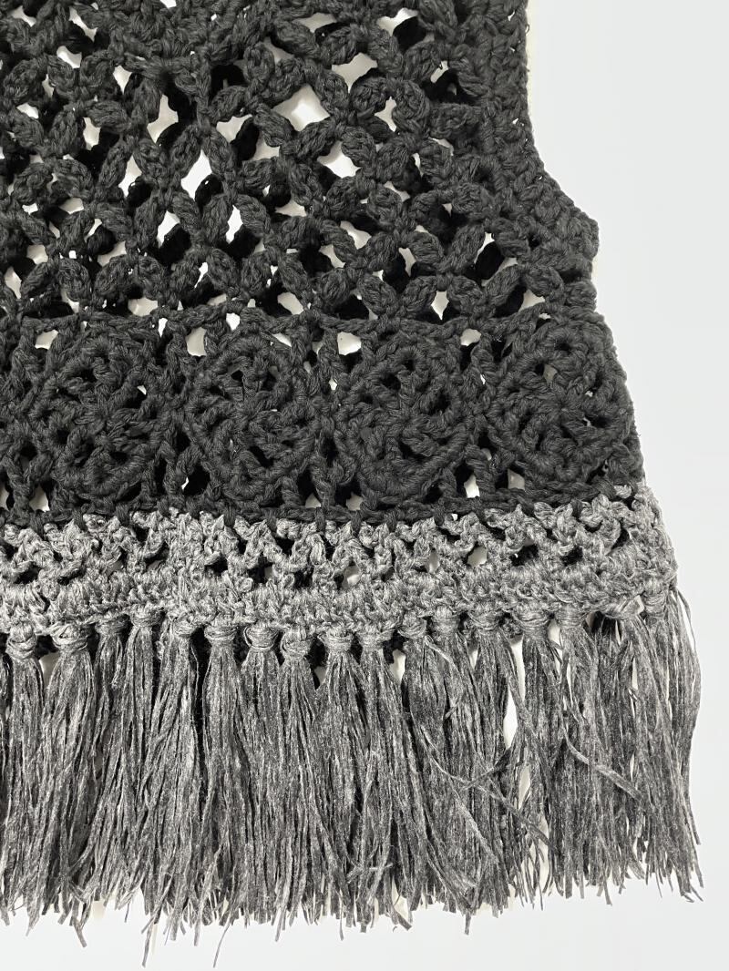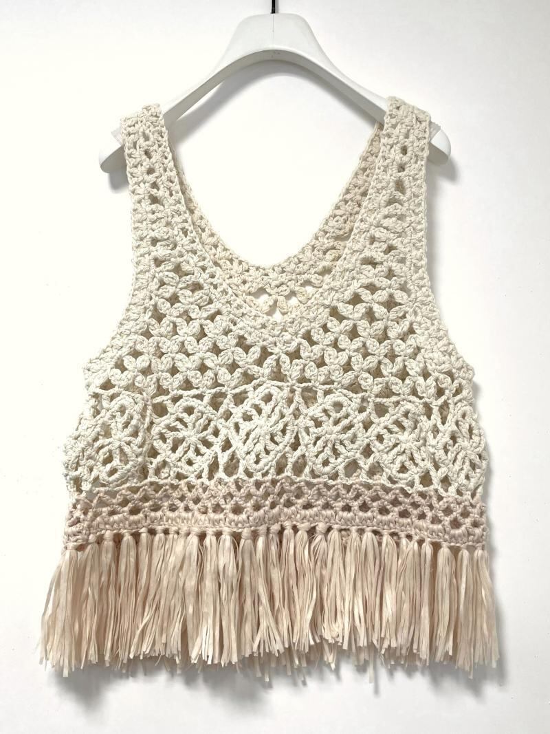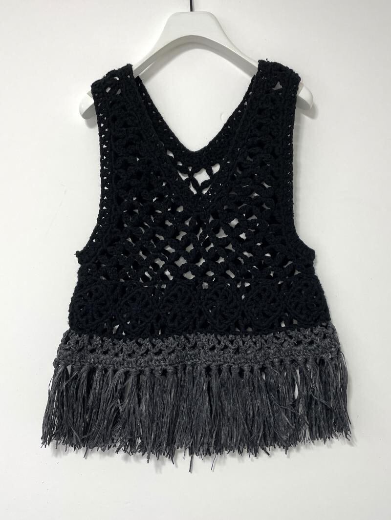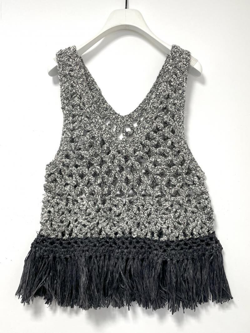 ナチュラルでエスニックなムード漂う1点1点丁寧に手作業で編み上げたクロシェ編み(かぎ針編み)のベスト。身頃には表情のある質感のスラブ綿糸を使い、裾に柔らかい和紙のようなテープヤーンでフリンジを作った変化のあるデザインです。前後両面 着用可能で衿の深さを気分によって変化出来る仕様で、シンプルなTシャツやシャツワンピースの上にレイヤードし、スタイルのアクセントに活躍します。