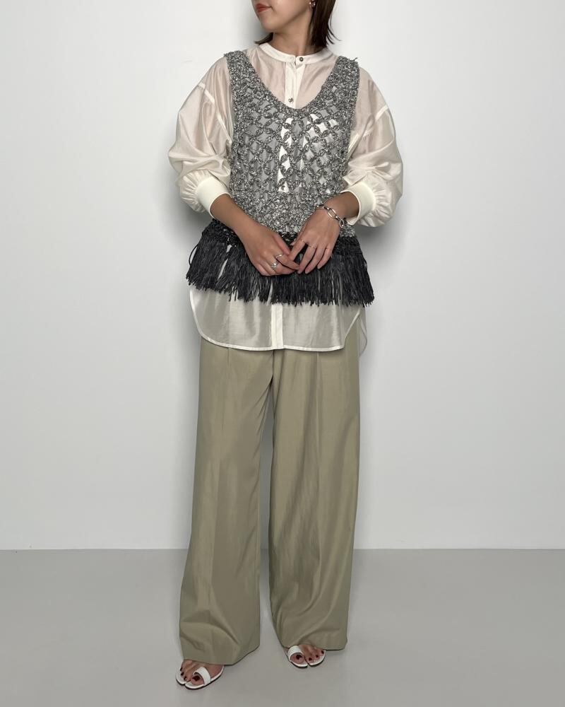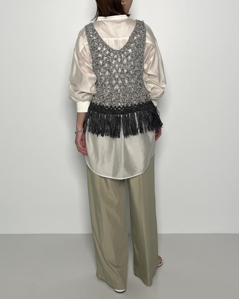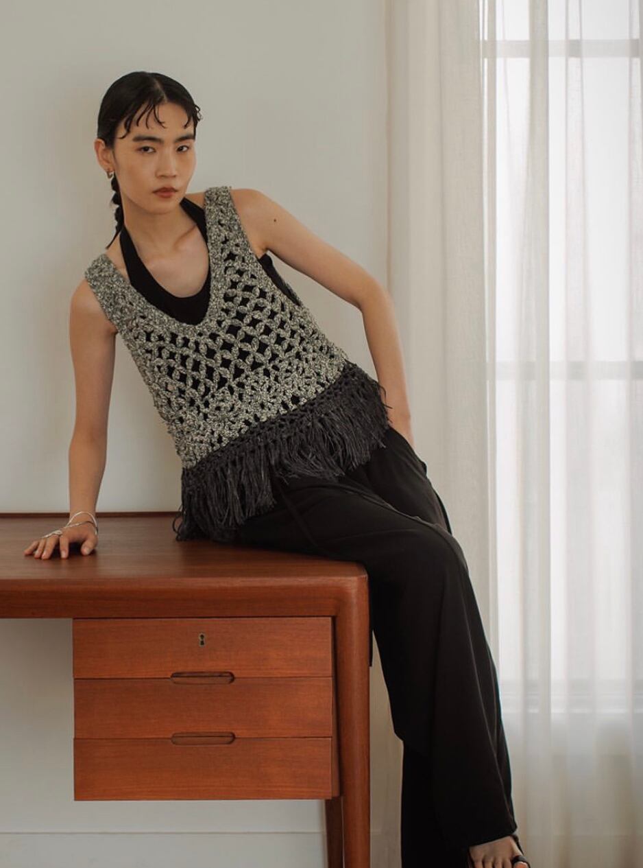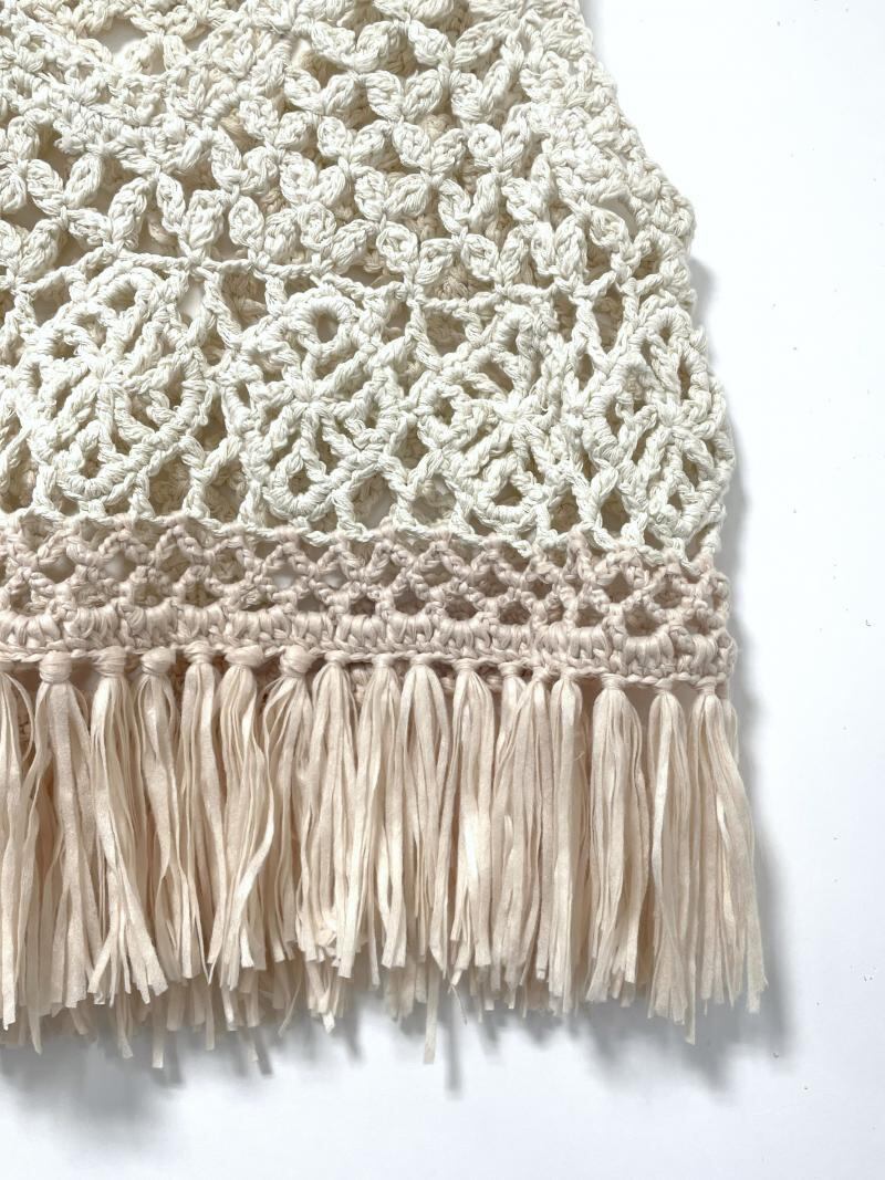 ナチュラルでエスニックなムード漂う1点1点丁寧に手作業で編み上げたクロシェ編み(かぎ針編み)のベスト。身頃には表情のある質感のスラブ綿糸を使い、裾に柔らかい和紙のようなテープヤーンでフリンジを作った変化のあるデザインです。前後両面 着用可能で衿の深さを気分によって変化出来る仕様で、シンプルなTシャツやシャツワンピースの上にレイヤードし、スタイルのアクセントに活躍します。