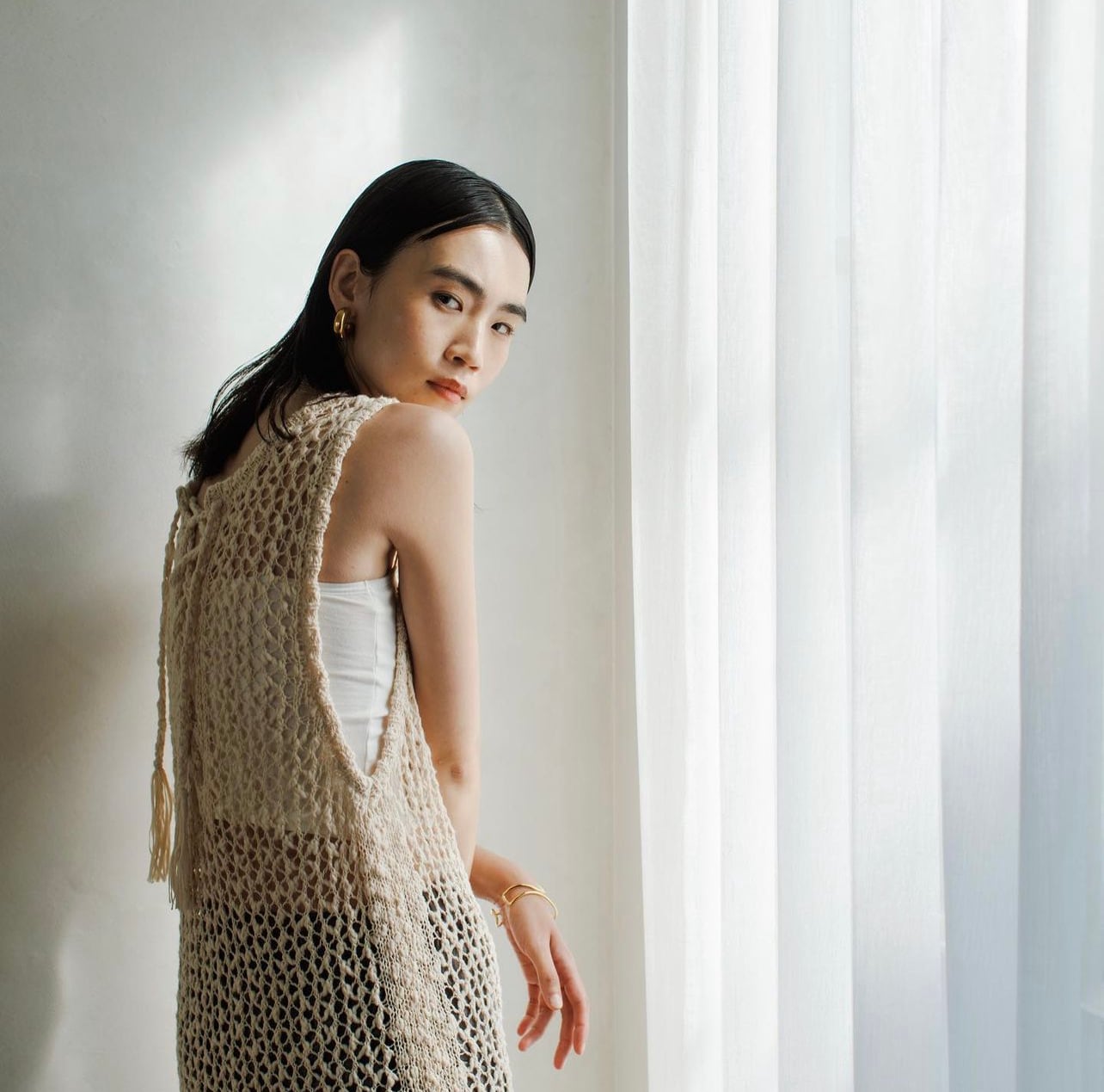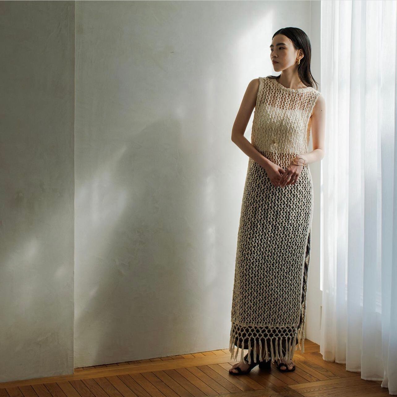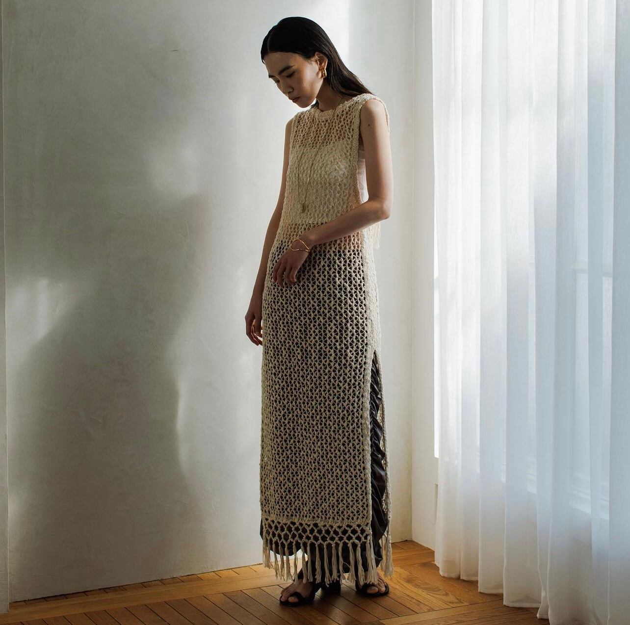 表情のあるスラブ綿糸を使用し、メッシュ編みでソフトで軽やかに編み上げたニットワンピースです。裾に柔らかい和紙のようなテープヤーンで裾部分のフリンジディティールを作り、変化のある新鮮なデザインです。シンプルなTシャツやタンクトップの上にレイヤードし、スタイルのアクセントとして活躍し、デニムやロングスカートなどのボトムとも相性が良く、トレンド感やシーズンイメージをプラスしてくれるアイテムです。両面着用可能でレースアップのフロントのデザインはBACKにデザインを持ってくる着用もおすすめです。