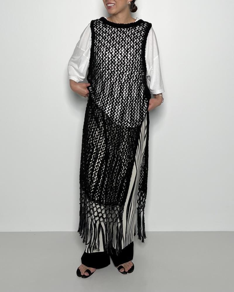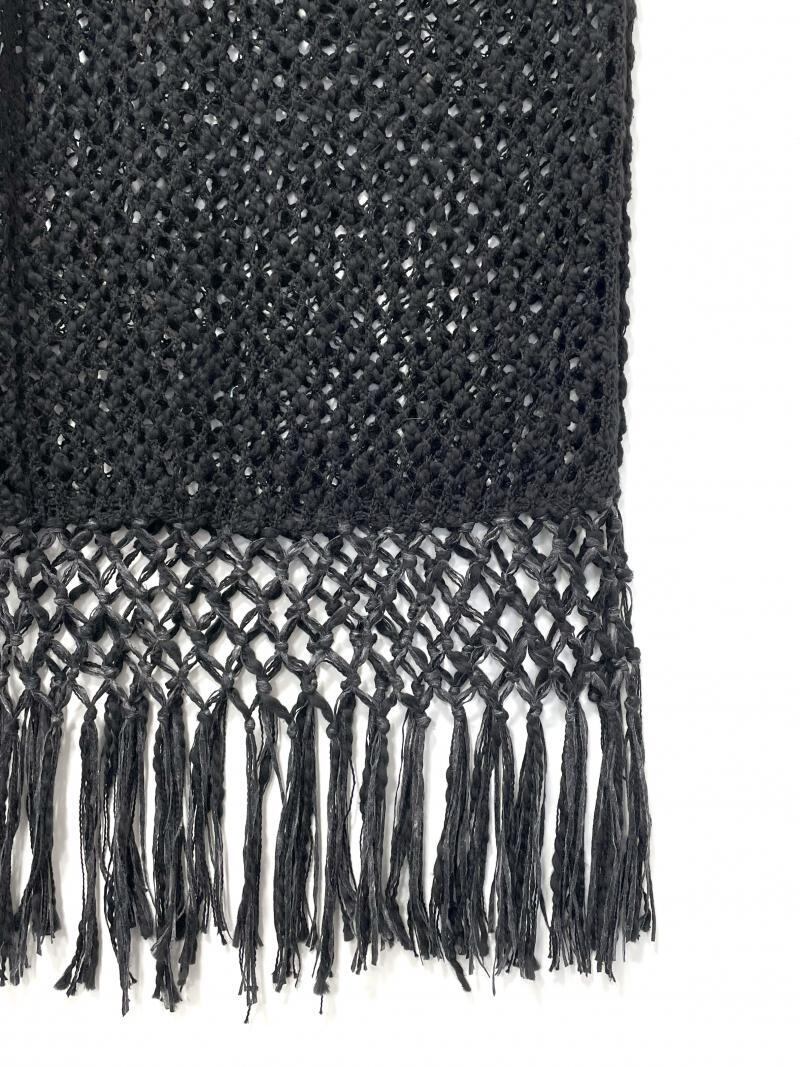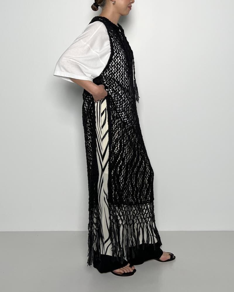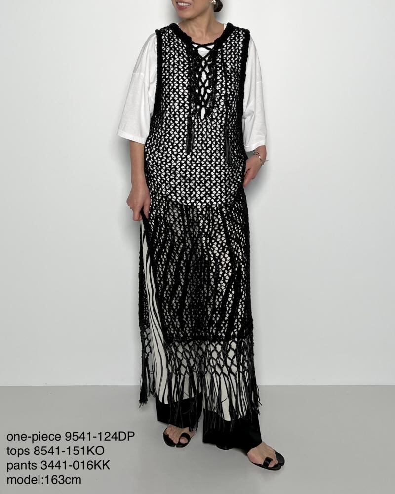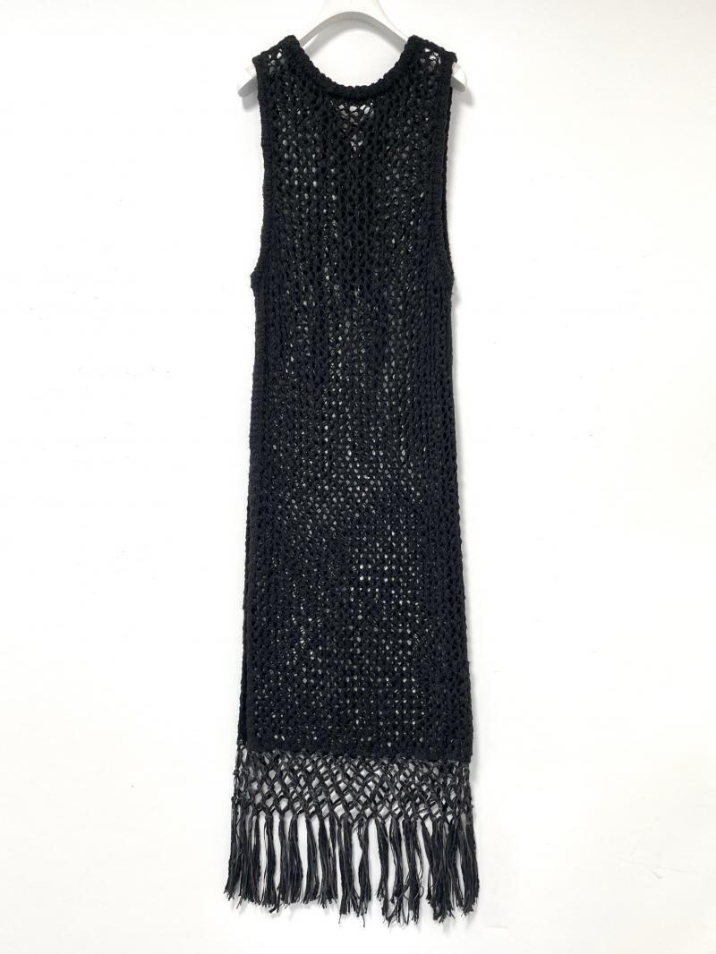 表情のあるスラブ綿糸を使用し、メッシュ編みでソフトで軽やかに編み上げたニットワンピースです。裾に柔らかい和紙のようなテープヤーンで裾部分のフリンジディティールを作り、変化のある新鮮なデザインです。シンプルなTシャツやタンクトップの上にレイヤードし、スタイルのアクセントとして活躍し、デニムやロングスカートなどのボトムとも相性が良く、トレンド感やシーズンイメージをプラスしてくれるアイテムです。両面着用可能でレースアップのフロントのデザインはBACKにデザインを持ってくる着用もおすすめです。