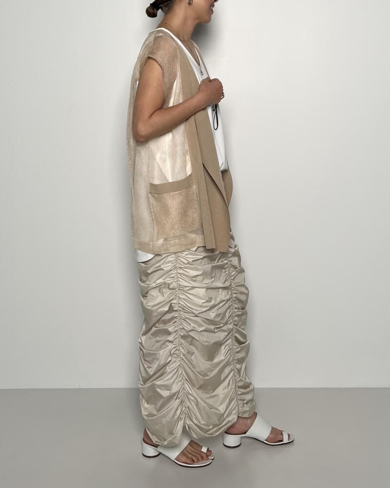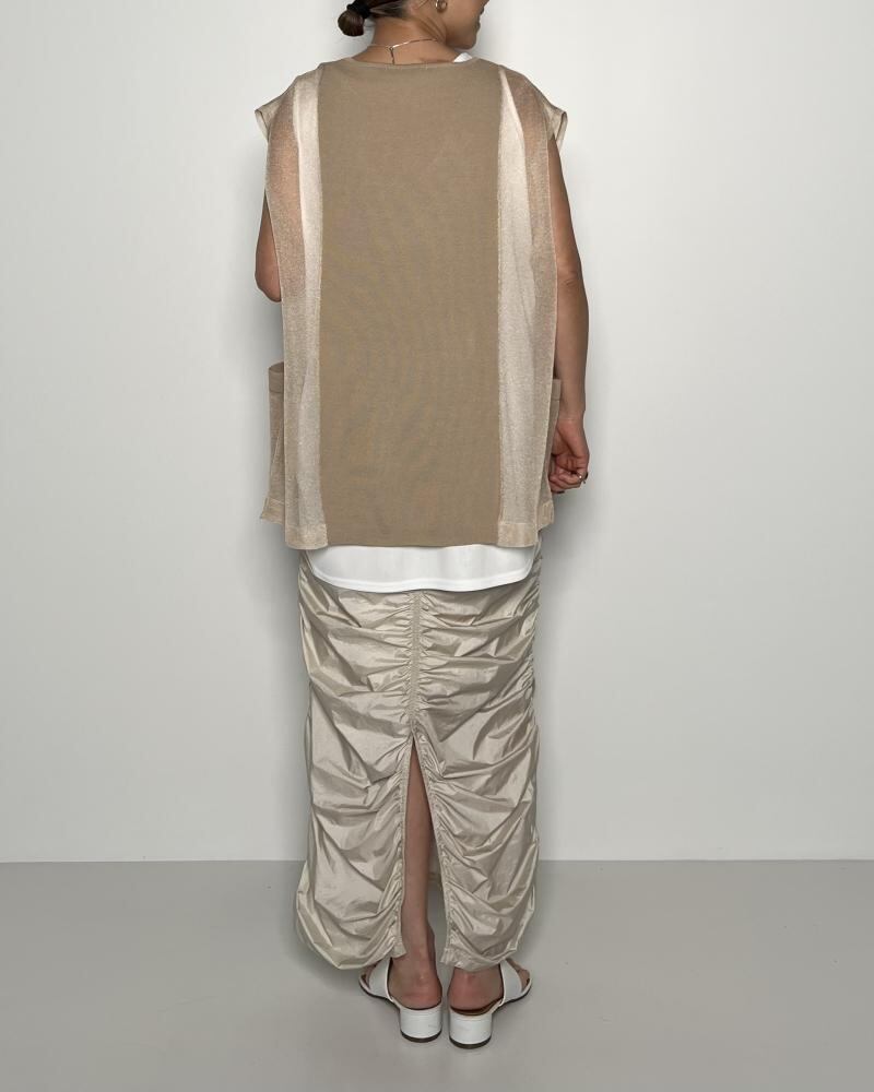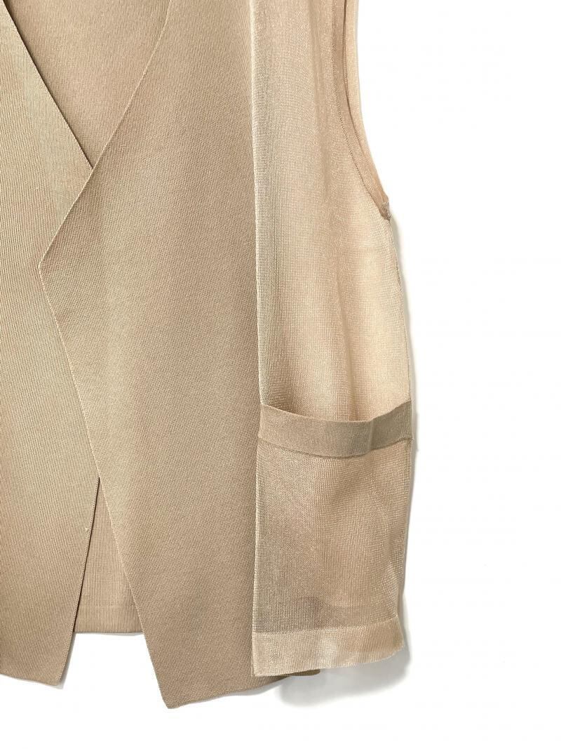程よいハリ感のあるシースルー素材とレーヨンブレンドの美しく滑らかでフラットな素材の組み合わせが新鮮な印象のニットジレ。シンプルで涼しげな印象で軽やかに羽織れるデザインです。ラフにロンTや半袖Tシャツに合わせてモード感のあるカジュアルコーディネートがおすすめ。