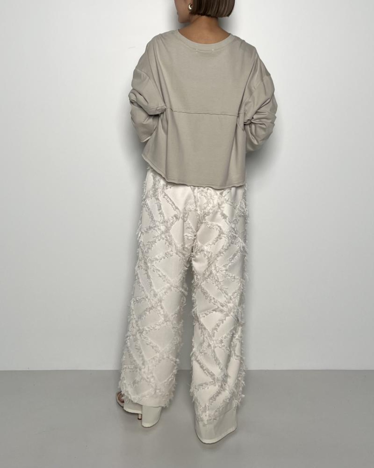 ワイドな身幅と広めの袖でルーズな印象に。ショート丈なのでもたつかず、ボトムを選ばない1枚に仕上げています。