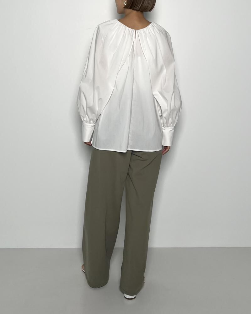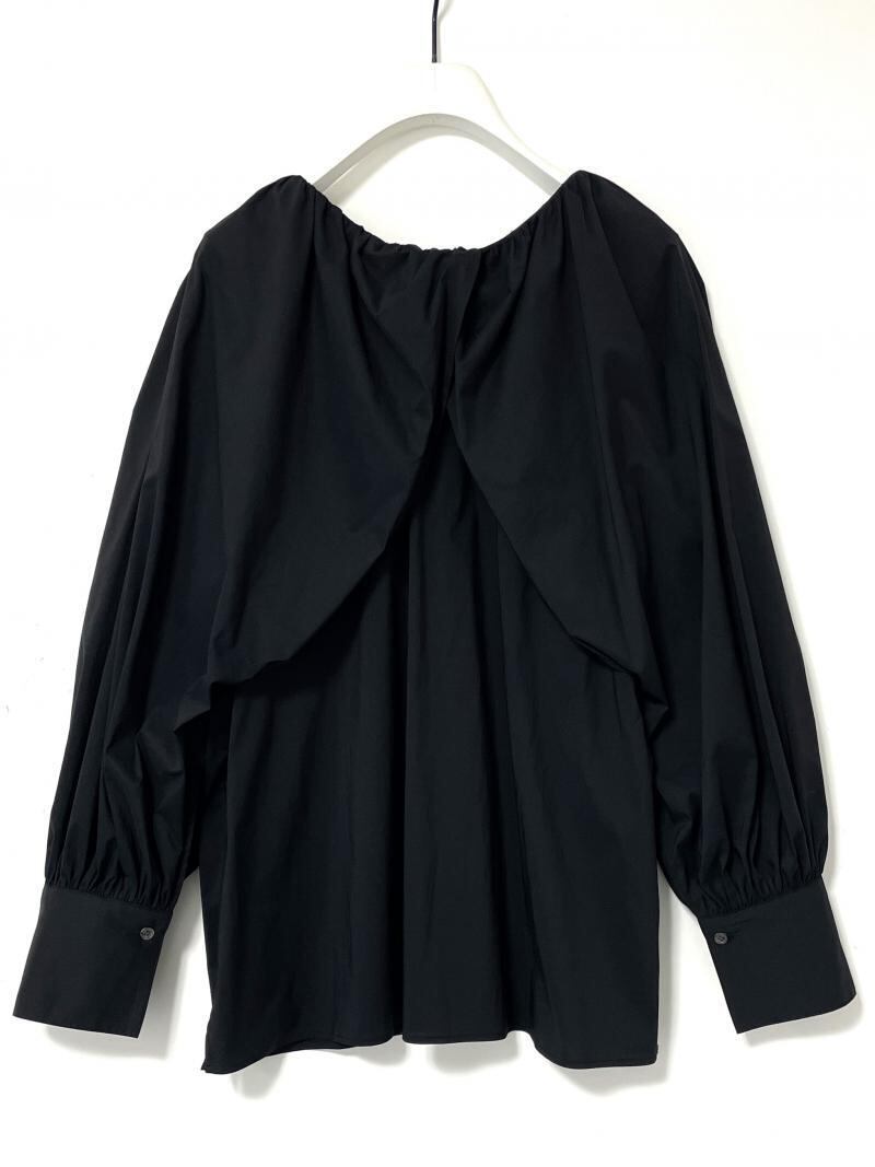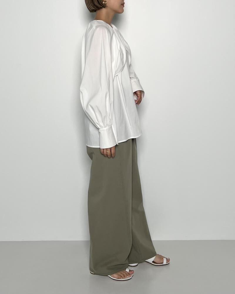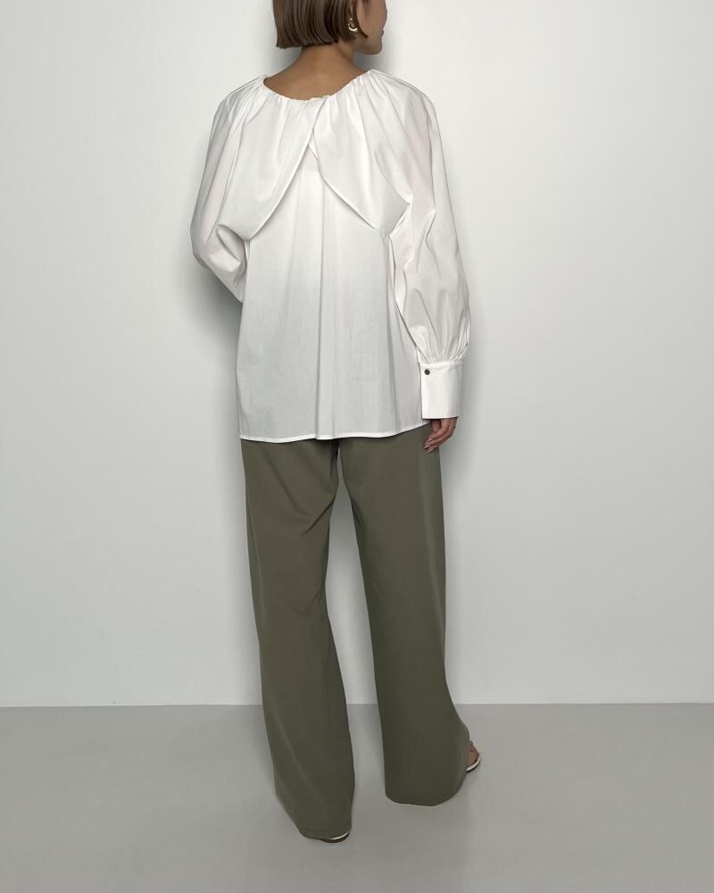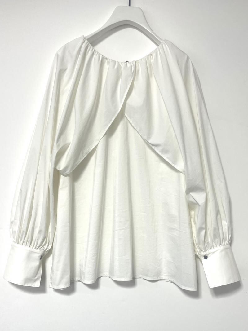 ケープの様なデザインの袖口にはたっぷりとギャザーを。衿ぐりには繊細なギャザーを寄せる事で、上品な印象のボリュームスリーブブラウスに仕上げています。