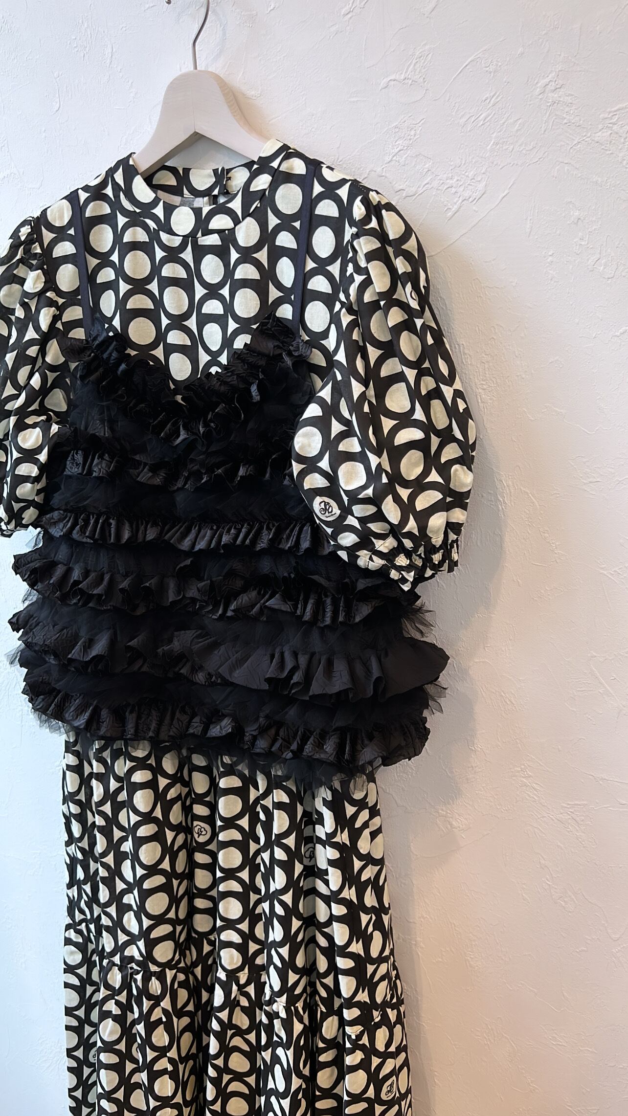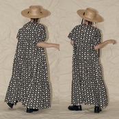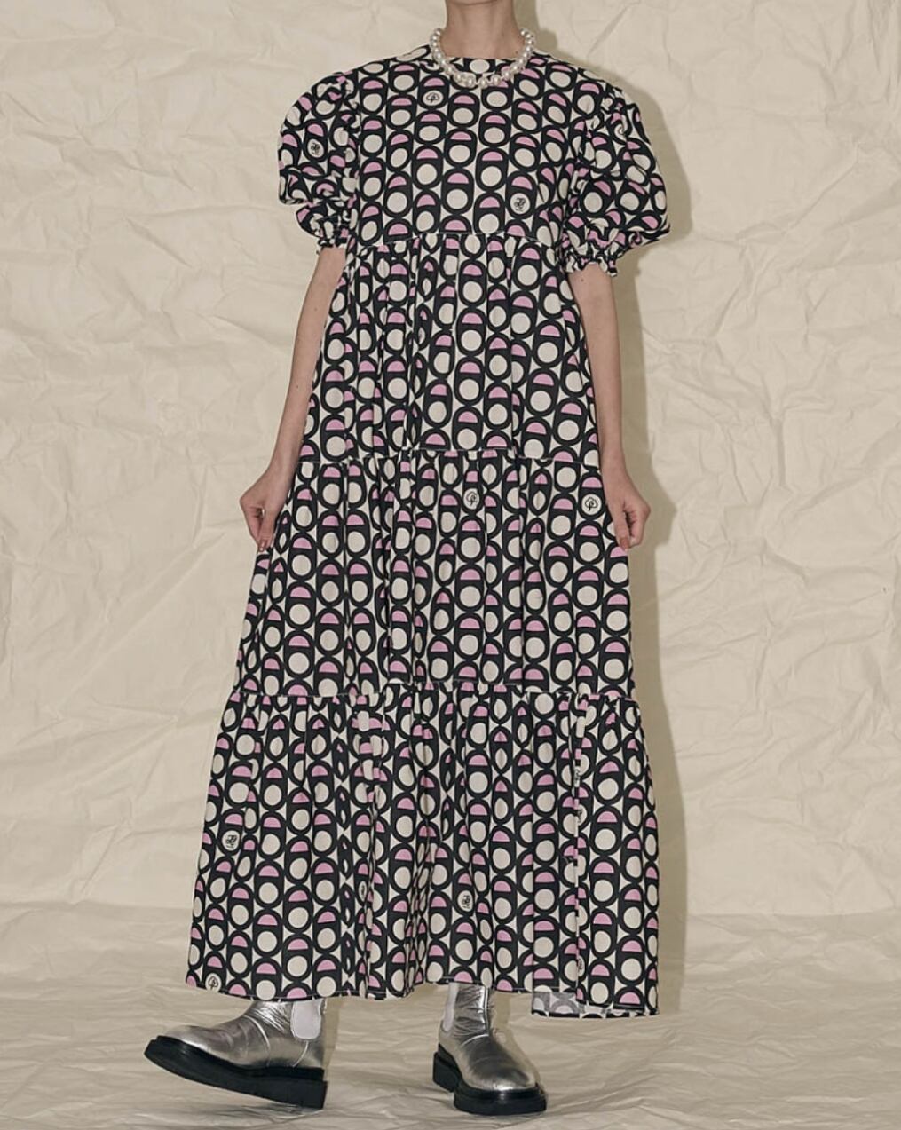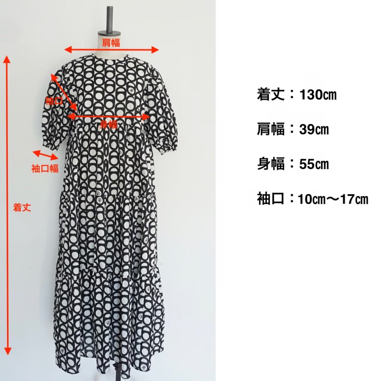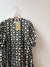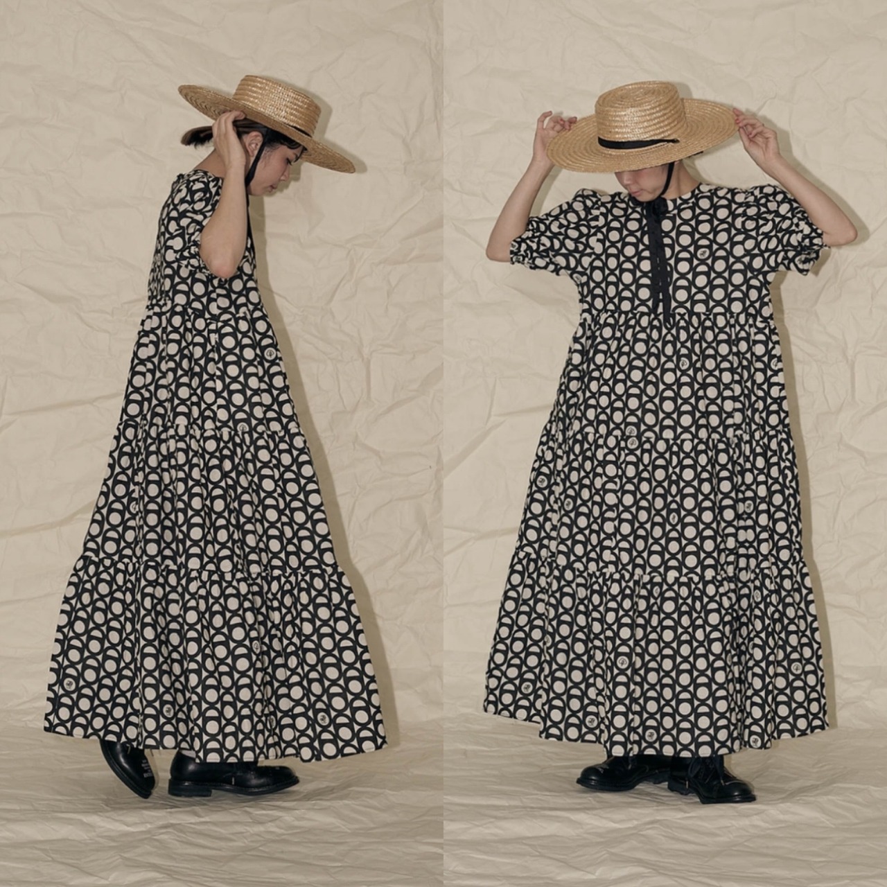 昨年非常に好評だったプリントの柄を少し小さめに変更し、昨年と同じ形のドレスを作りました。こんなことは滅多にありませんが、ラミー(リネン)にプリントしたものが大変好評で、オファーが多かったためリピートしています。夏に開催したPOP UP SHOPでも、一番人気ですぐに完売してしまいました。リネンのざらっとした風合いでとても涼しく、多少厚みがあるので、ギャザーが膨らんでいてとても素敵なシルエットでした。身頃が大きめで、肩もゆったり、柔らかなゴムのパフスリーブで真夏に本当に着やすいドレスです。身長、体型は選びません。私もノーマークで購入していませんでしたが、スタッフが何人も着ているのを見て、どんどん欲しくなりました。真夏にウエストを締めつけないので、風が入ってとても気持ちが良いそうです。昨年のパフスリーブの部分は改良して少しゆとりを持たせ更に着やすいパターンにしました。コットンのティアードドレスは昨年から流行っていますが、私の作るティアードドレスはプリントで、他のブランドにはあまりないものにしました。見た目の甘い雰囲気がお好きでいらっしゃる方は、着心地もよく、後悔させないドレスになると思います。