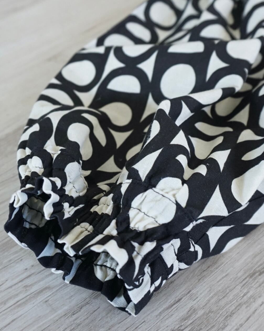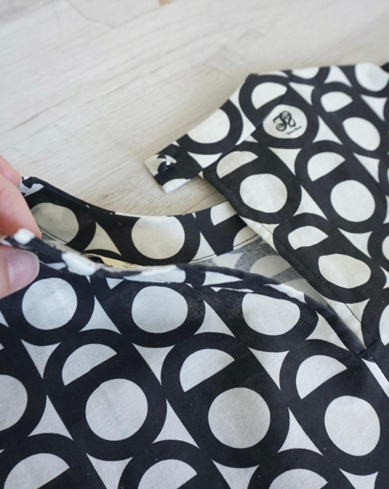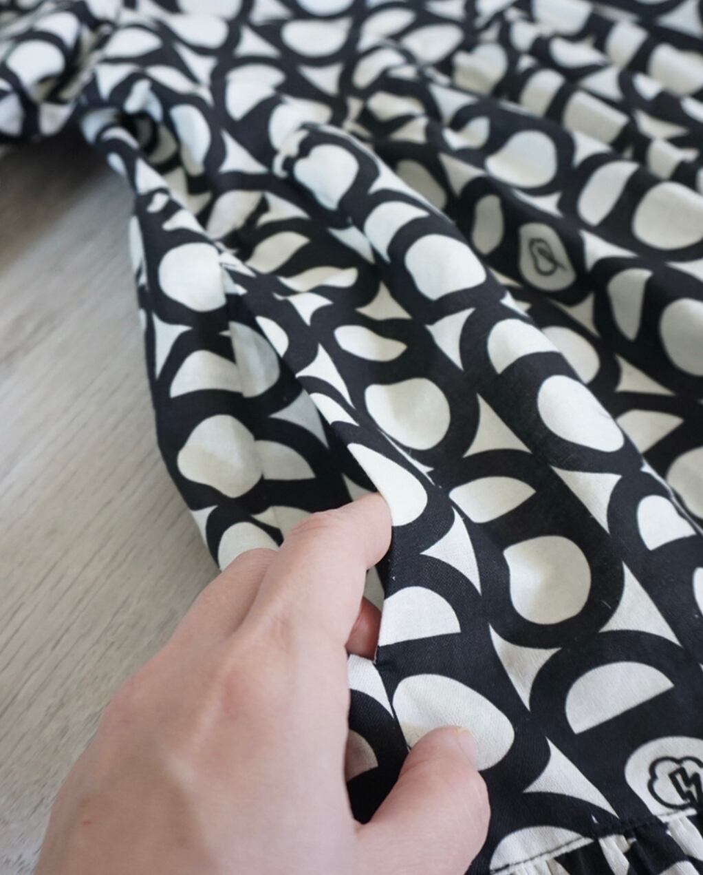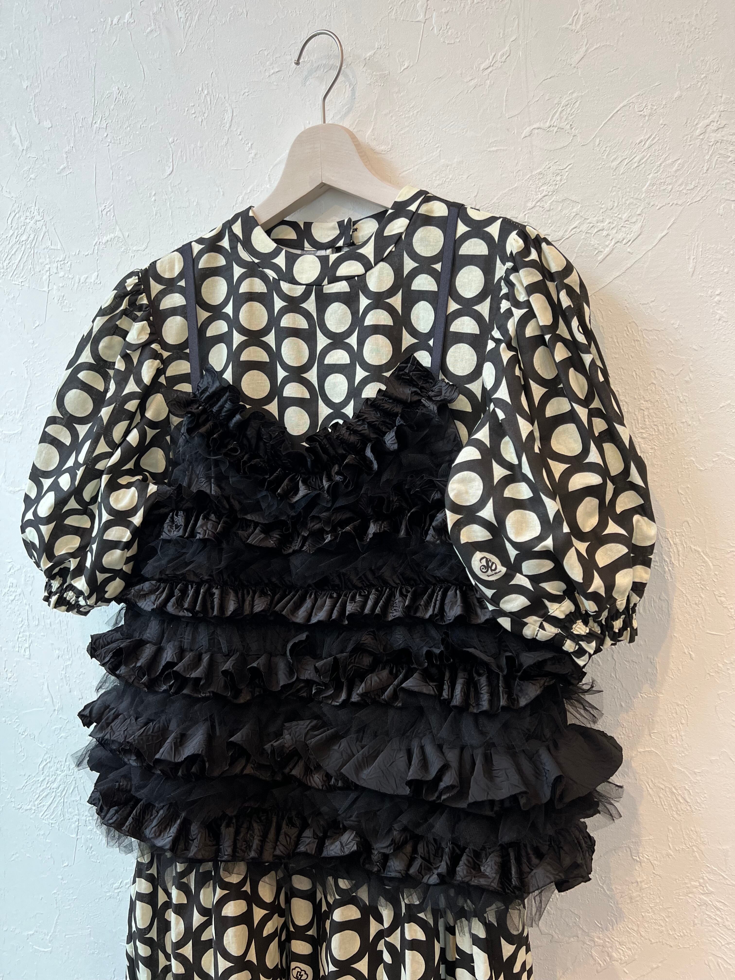 昨年非常に好評だったプリントの柄を少し小さめに変更し、昨年と同じ形のドレスを作りました。こんなことは滅多にありませんが、ラミー(リネン)にプリントしたものが大変好評で、オファーが多かったためリピートしています。夏に開催したPOP UP SHOPでも、一番人気ですぐに完売してしまいました。リネンのざらっとした風合いでとても涼しく、多少厚みがあるので、ギャザーが膨らんでいてとても素敵なシルエットでした。身頃が大きめで、肩もゆったり、柔らかなゴムのパフスリーブで真夏に本当に着やすいドレスです。身長、体型は選びません。私もノーマークで購入していませんでしたが、スタッフが何人も着ているのを見て、どんどん欲しくなりました。真夏にウエストを締めつけないので、風が入ってとても気持ちが良いそうです。昨年のパフスリーブの部分は改良して少しゆとりを持たせ更に着やすいパターンにしました。コットンのティアードドレスは昨年から流行っていますが、私の作るティアードドレスはプリントで、他のブランドにはあまりないものにしました。見た目の甘い雰囲気がお好きでいらっしゃる方は、着心地もよく、後悔させないドレスになると思います。