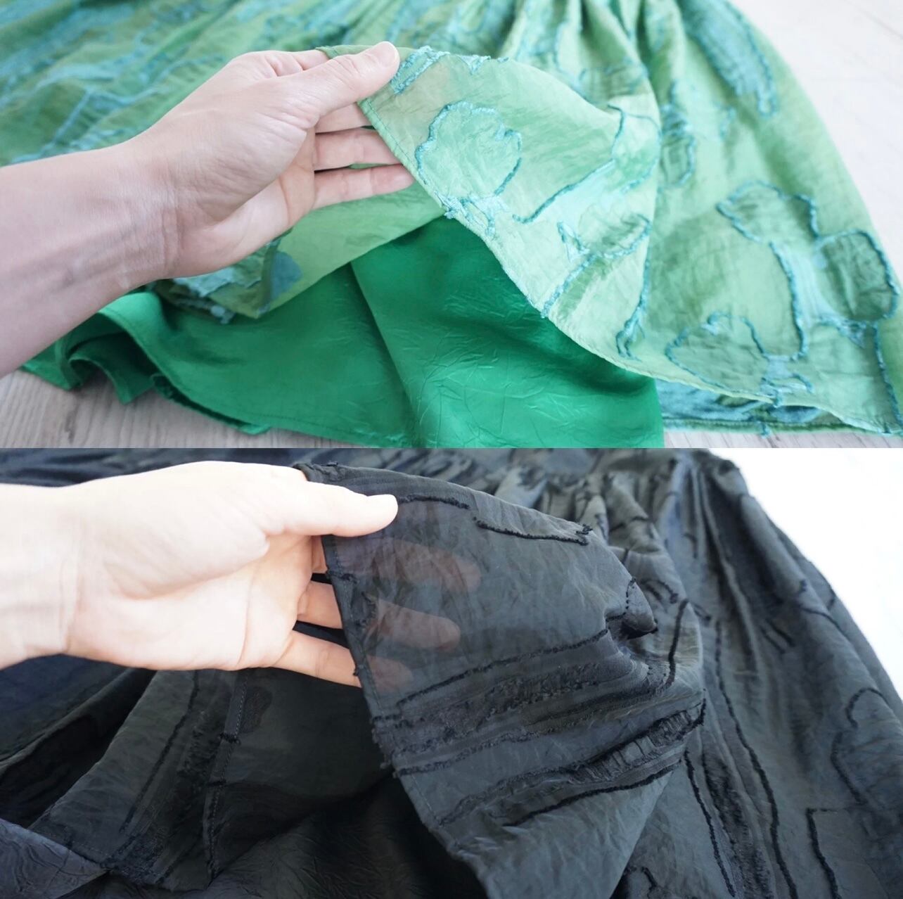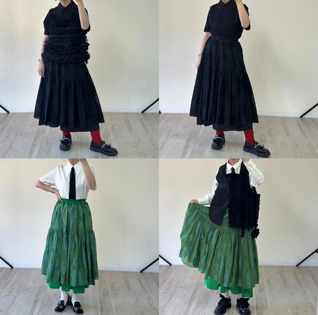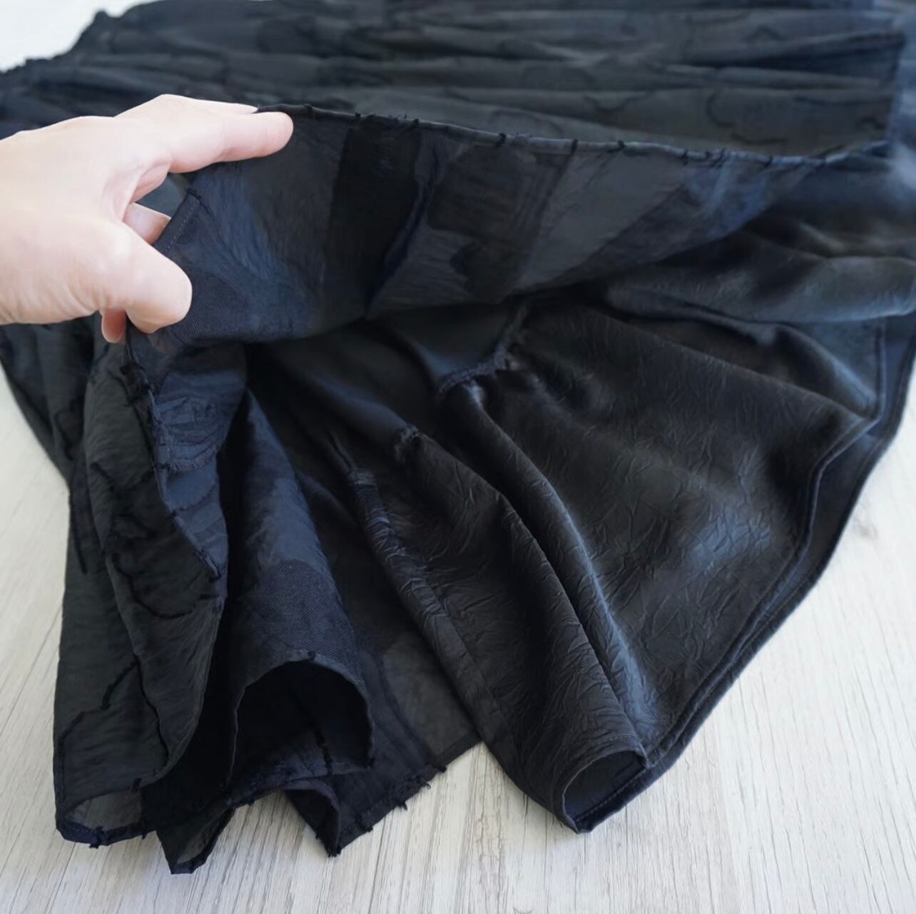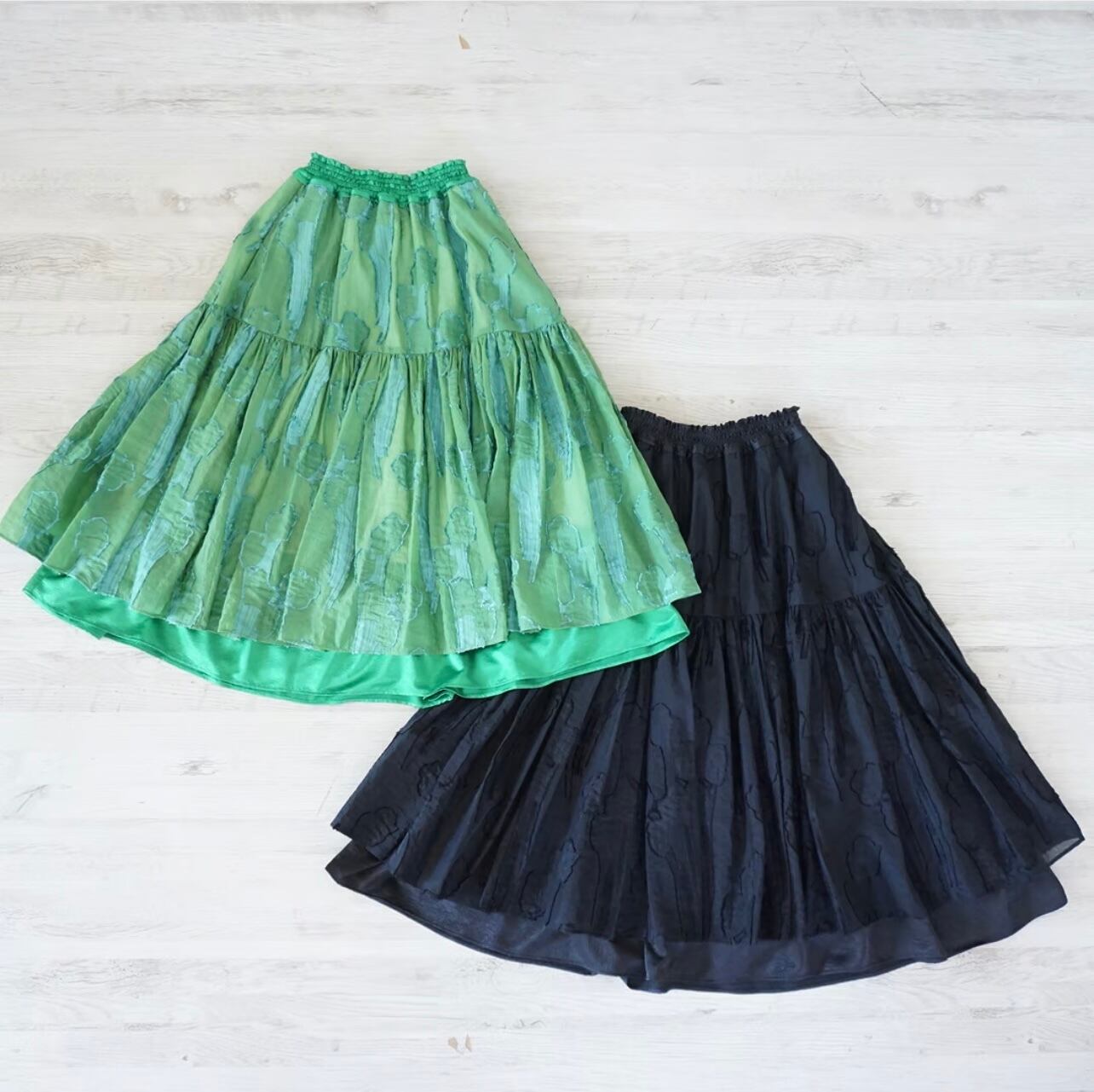 シアー感のある、美しい織りでリーフ柄になっているテキスタイルをピックアップしました。アンダースカートに光沢感のある素材を重ね、一枚で迫力のある広がりが特徴です。ウエスト部分はゴムでシャーリングをつけていてを見せて履くことも可能。ウエストは少なめのギャザーでスッキリとさせ、ヒップ下から一気にたっぷりとしたギャザーを寄せました。歩く度に、広がり、繊細な織りの凹凸ある素材の美しさが生きた一枚です。ブラックのスカートはあるととても便利で何にでも合わせることができ重宝するのではないかなと思います。私は最近はマキシタイプのスカートよりは足首が見えて靴を見せて履くのを好みます。革靴にソックスを見せて、大人かわいいスタイルができると思いました。ブラックは写真ではあまり映えていませんが、あると便利なスカートだと思いました。テキスタイル自体のお値段がするため、少し値段は張りますが、一目でラグジュアリーな雰囲気が感じ取れる素材なので、気分が上がるスカートになるのではないかな?と思っています。