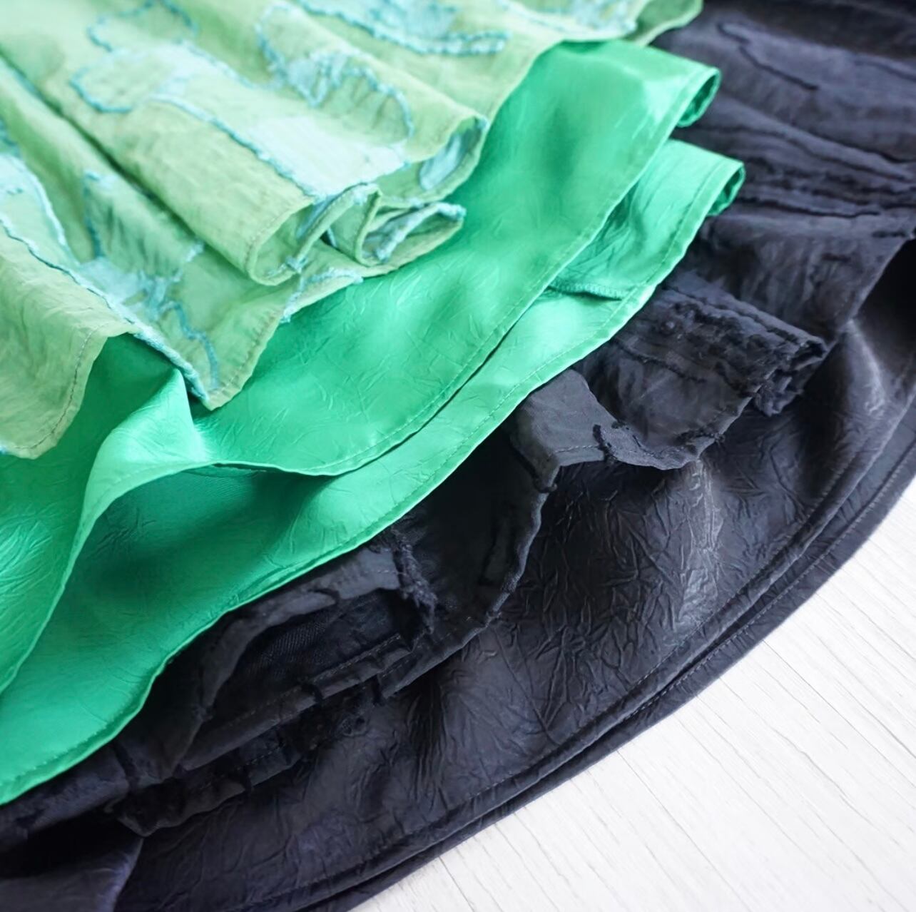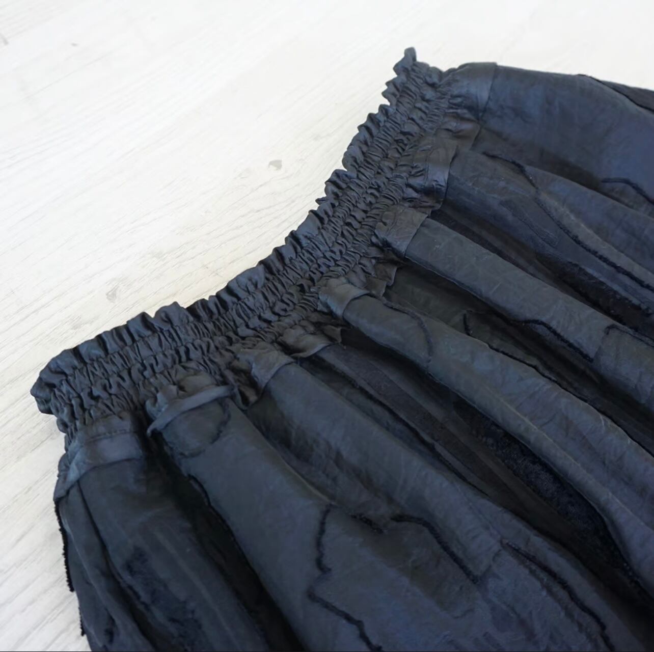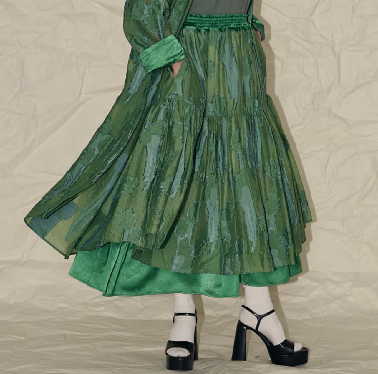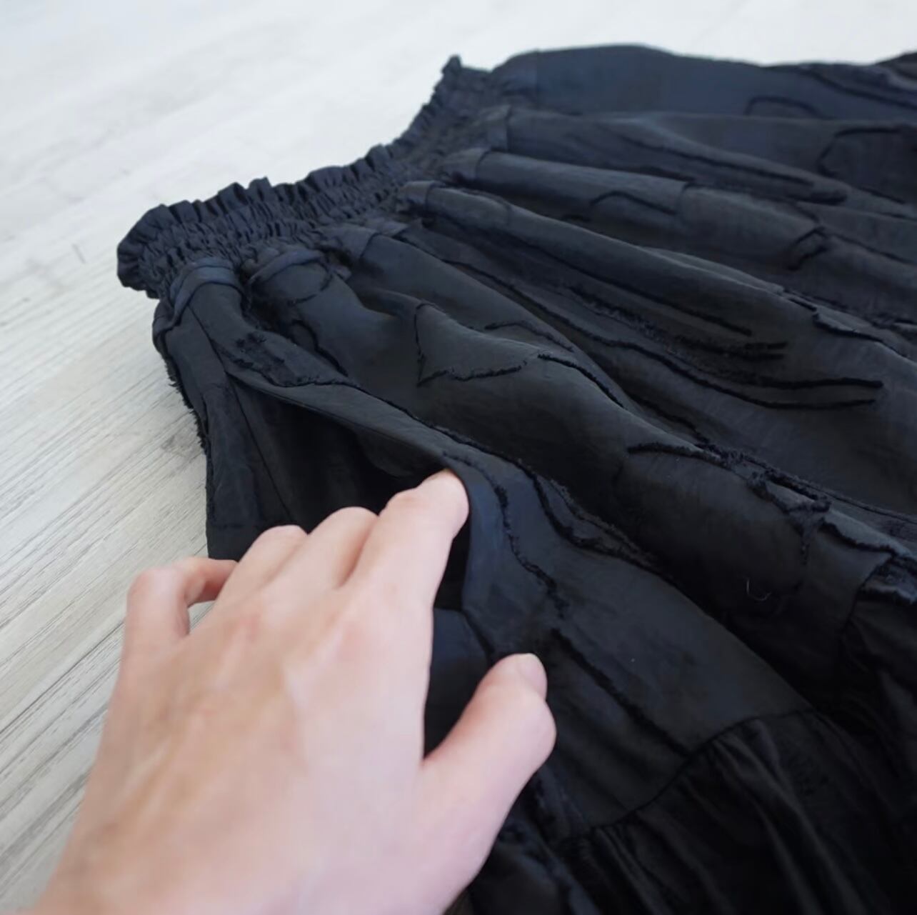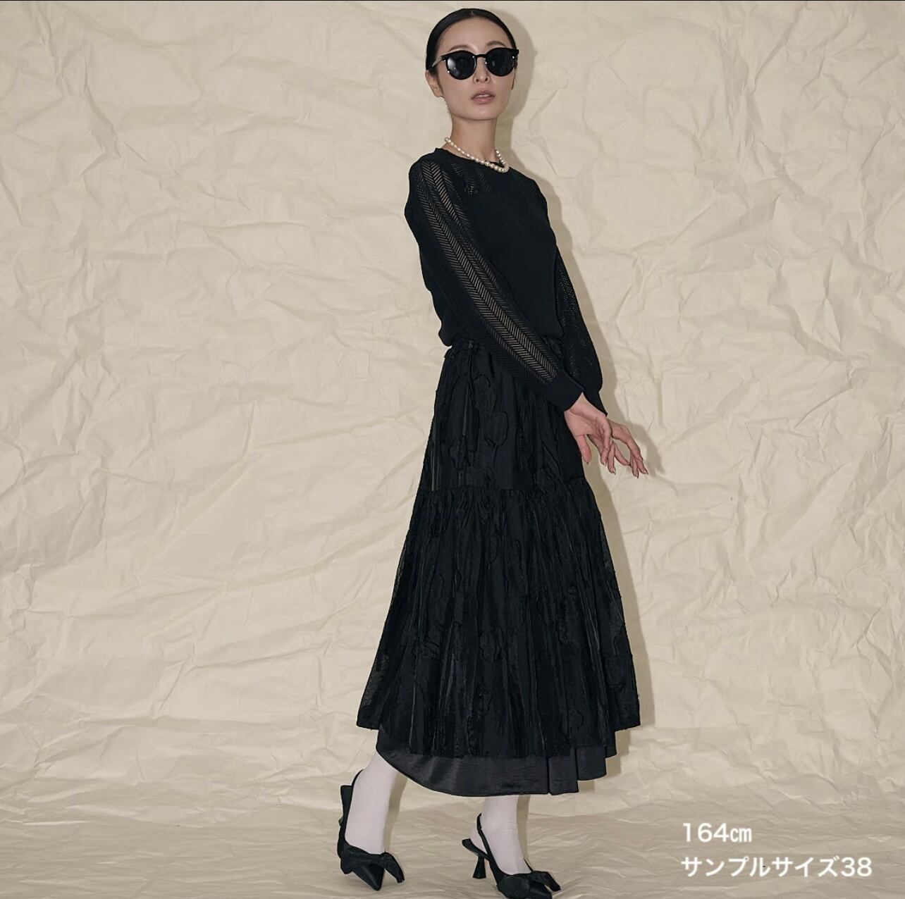 シアー感のある、美しい織りでリーフ柄になっているテキスタイルをピックアップしました。アンダースカートに光沢感のある素材を重ね、一枚で迫力のある広がりが特徴です。ウエスト部分はゴムでシャーリングをつけていてを見せて履くことも可能。ウエストは少なめのギャザーでスッキリとさせ、ヒップ下から一気にたっぷりとしたギャザーを寄せました。歩く度に、広がり、繊細な織りの凹凸ある素材の美しさが生きた一枚です。ブラックのスカートはあるととても便利で何にでも合わせることができ重宝するのではないかなと思います。私は最近はマキシタイプのスカートよりは足首が見えて靴を見せて履くのを好みます。革靴にソックスを見せて、大人かわいいスタイルができると思いました。ブラックは写真ではあまり映えていませんが、あると便利なスカートだと思いました。テキスタイル自体のお値段がするため、少し値段は張りますが、一目でラグジュアリーな雰囲気が感じ取れる素材なので、気分が上がるスカートになるのではないかな?と思っています。