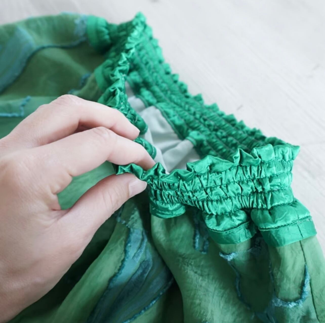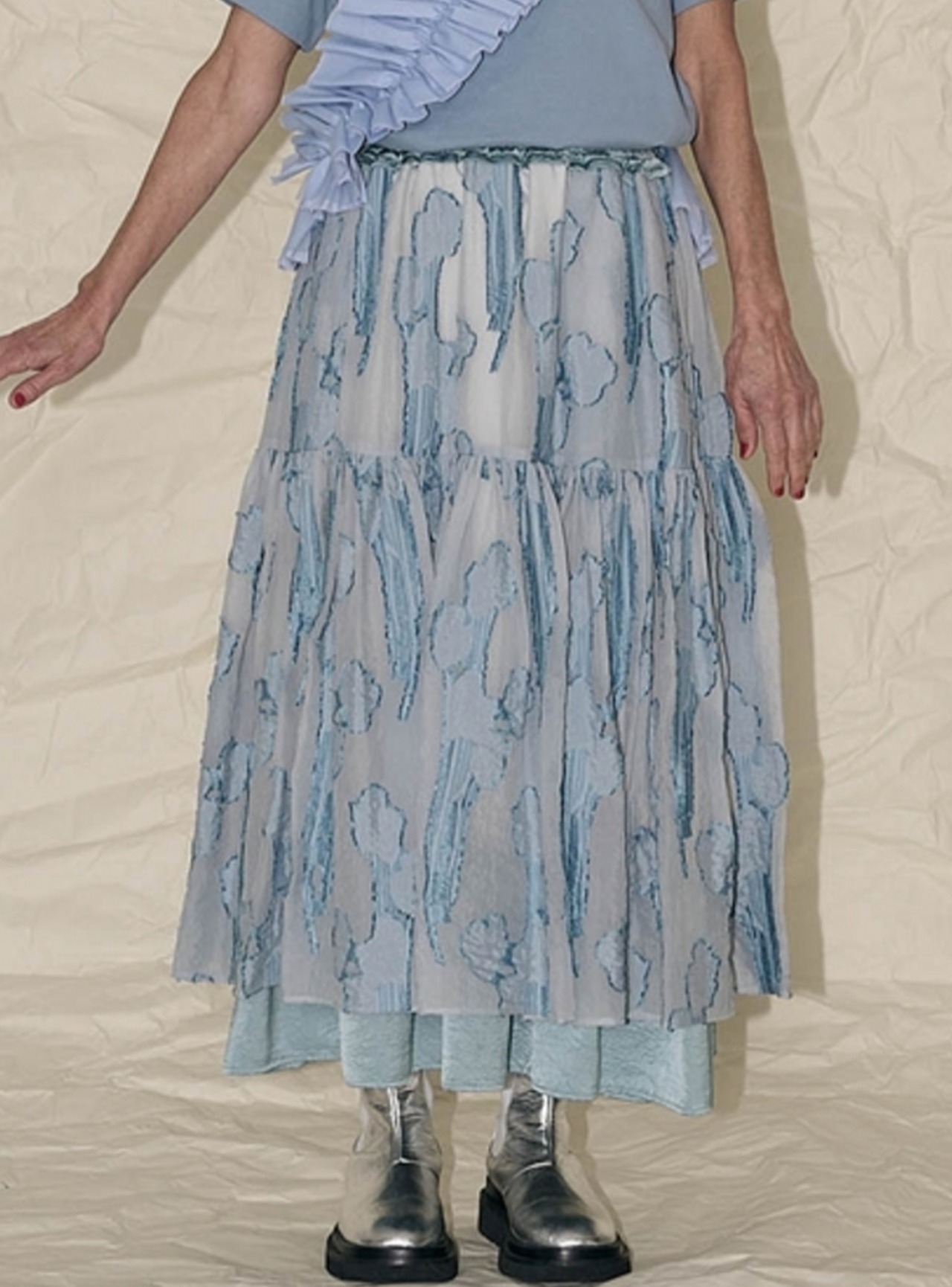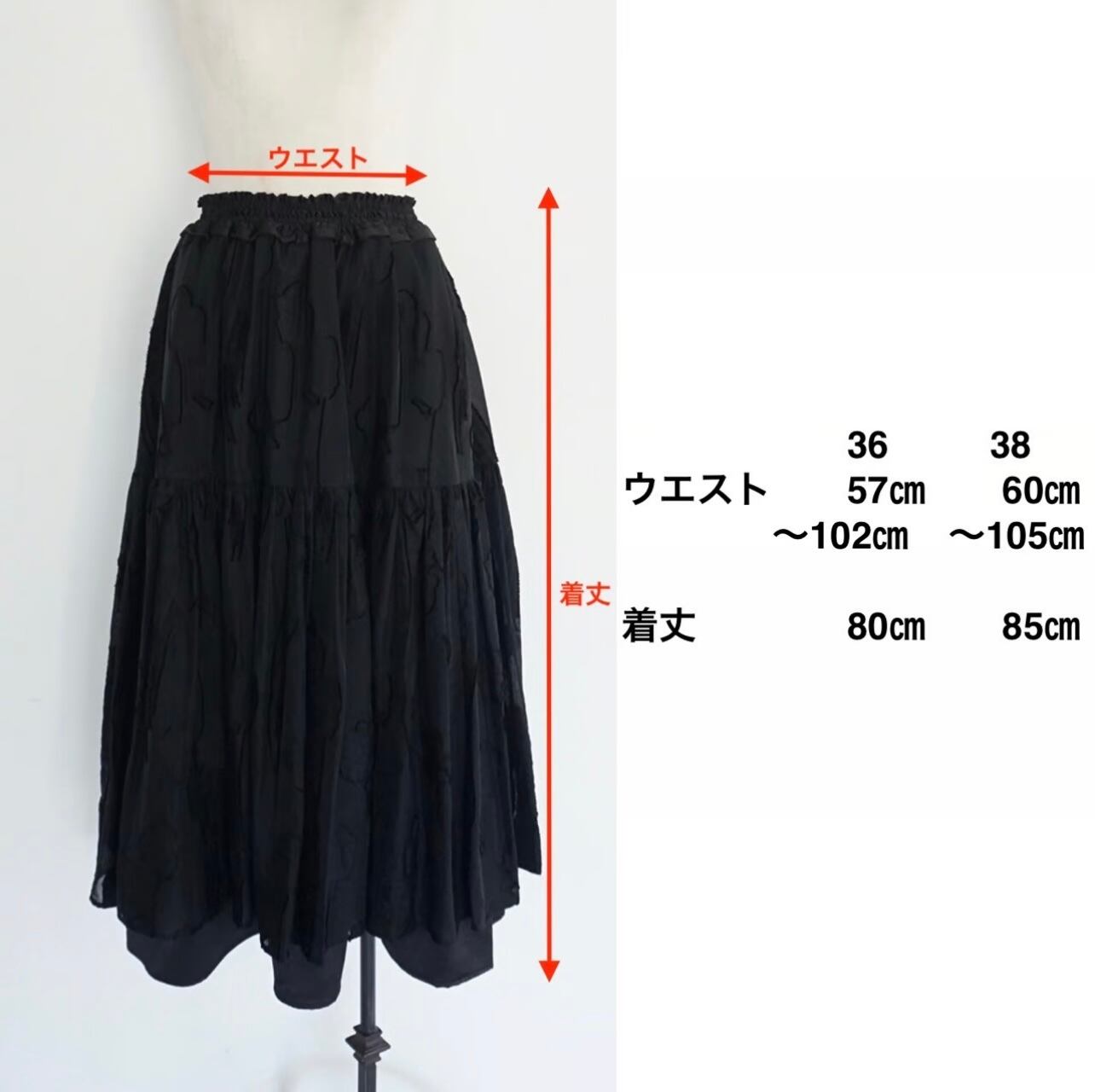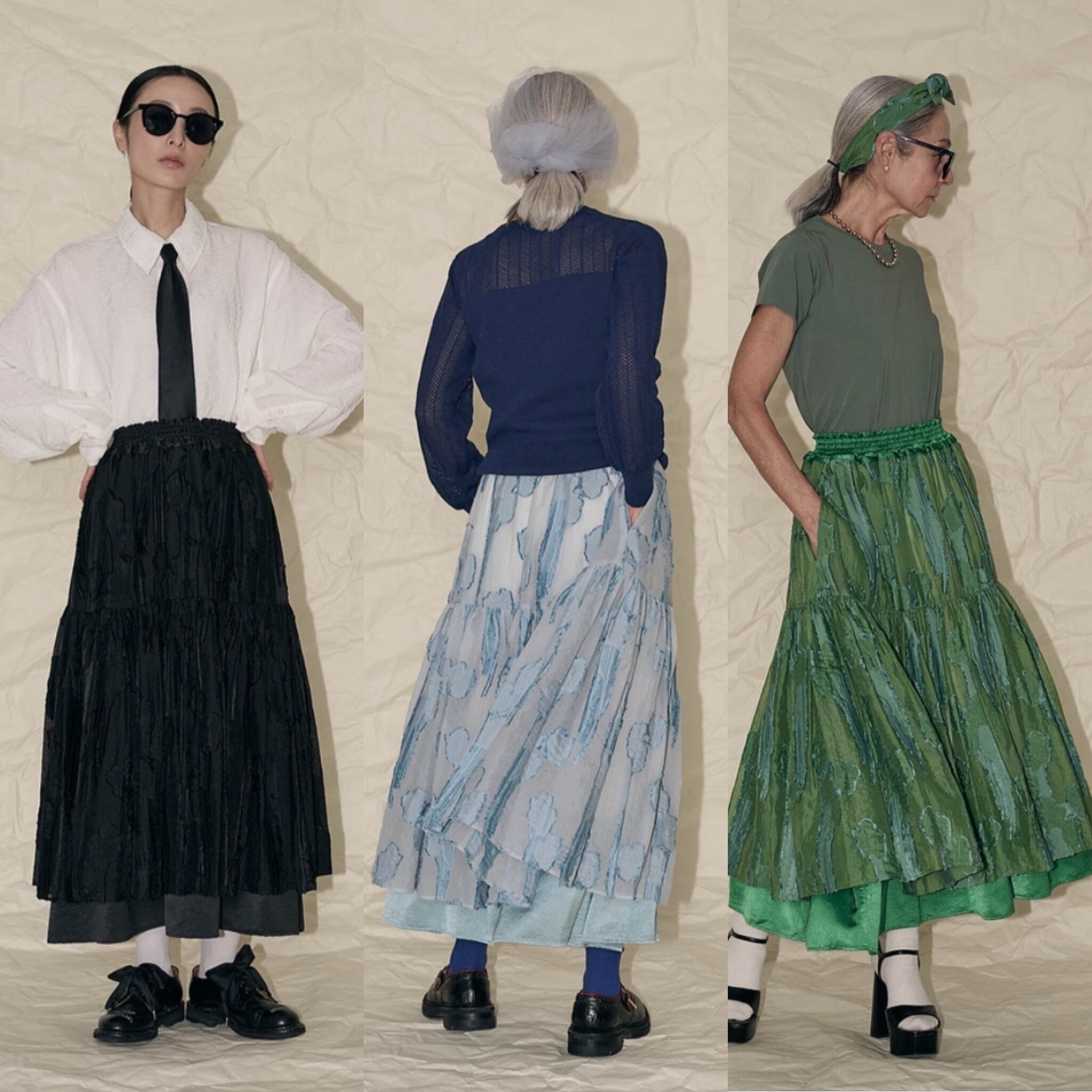 シアー感のある、美しい織りでリーフ柄になっているテキスタイルをピックアップしました。アンダースカートに光沢感のある素材を重ね、一枚で迫力のある広がりが特徴です。ウエスト部分はゴムでシャーリングをつけていてを見せて履くことも可能。ウエストは少なめのギャザーでスッキリとさせ、ヒップ下から一気にたっぷりとしたギャザーを寄せました。歩く度に、広がり、繊細な織りの凹凸ある素材の美しさが生きた一枚です。ブラックのスカートはあるととても便利で何にでも合わせることができ重宝するのではないかなと思います。私は最近はマキシタイプのスカートよりは足首が見えて靴を見せて履くのを好みます。革靴にソックスを見せて、大人かわいいスタイルができると思いました。ブラックは写真ではあまり映えていませんが、あると便利なスカートだと思いました。テキスタイル自体のお値段がするため、少し値段は張りますが、一目でラグジュアリーな雰囲気が感じ取れる素材なので、気分が上がるスカートになるのではないかな?と思っています。