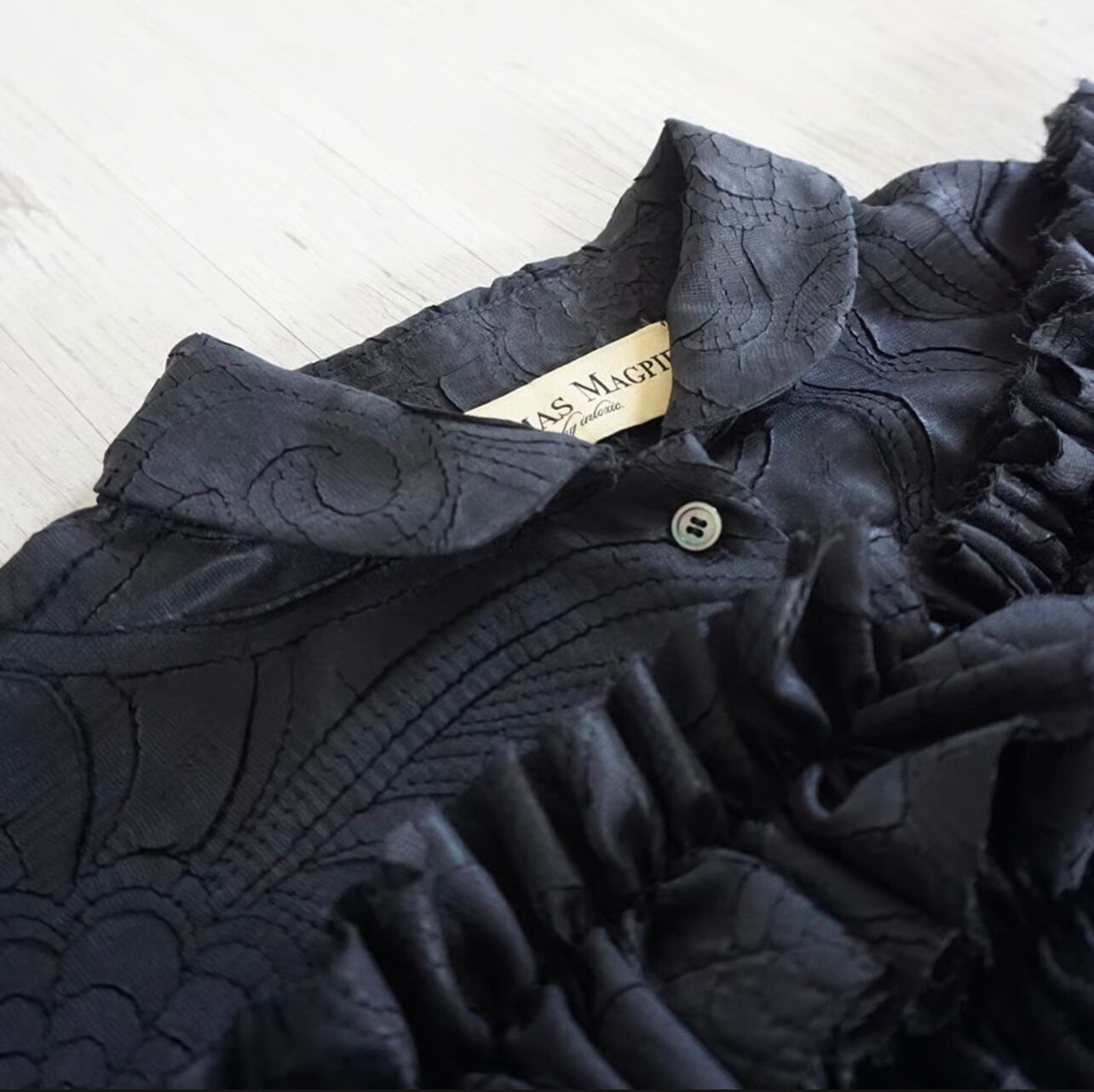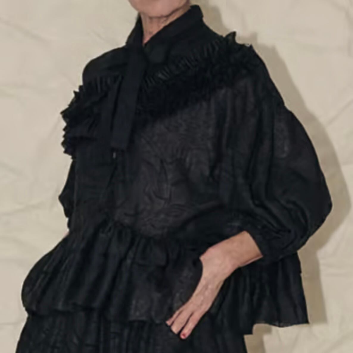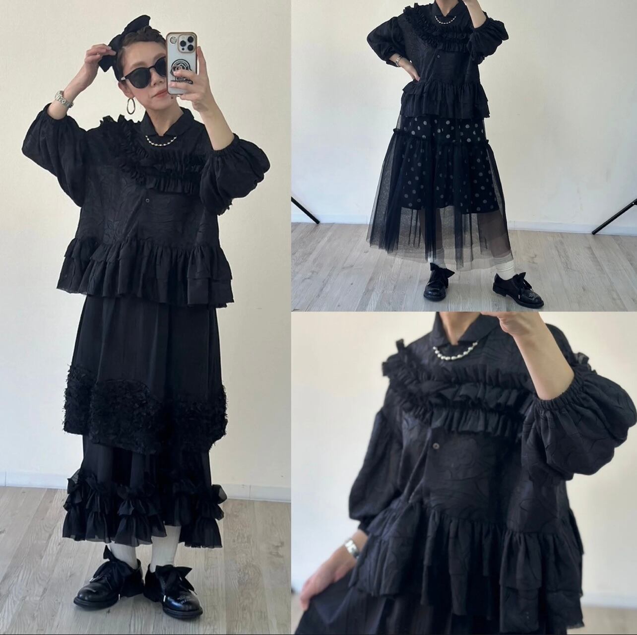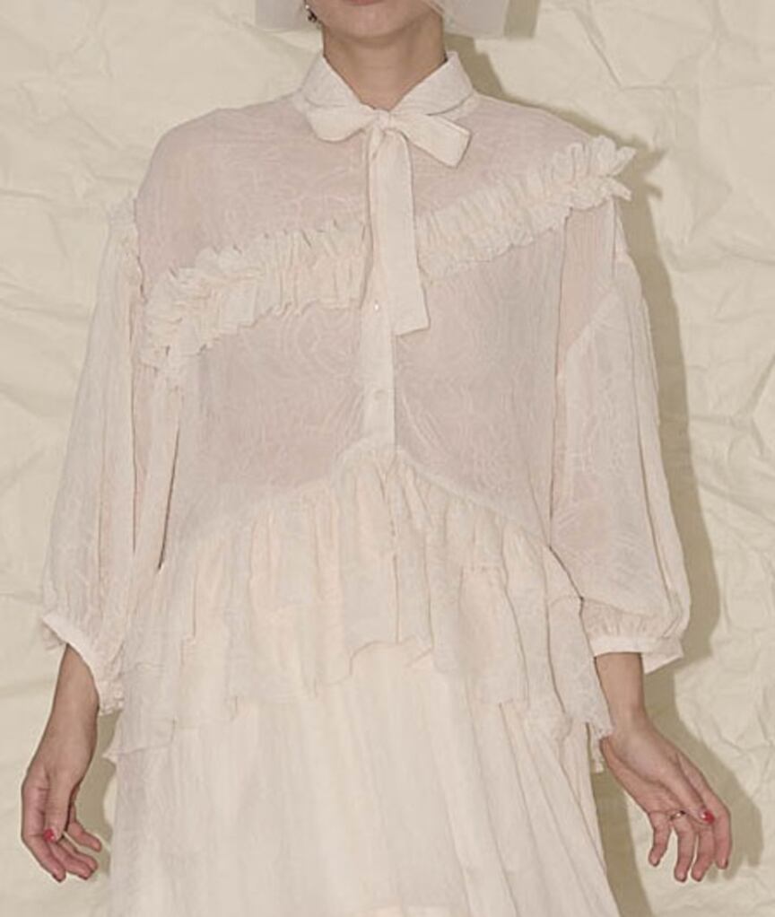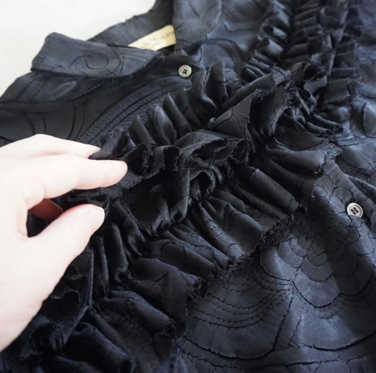 とても珍しいシアー素材。分かりにくいですが、ステッチを入れてエンボスに加工されている凹凸が美しい柄をおりなしている素材です。素材だけでもとても美しいですが、私の好きなフリルをアシンメトリーに入れてオーバーサイズのシャツを作りました。胸元に共布のリボンがつきます。これは頭に巻いてヘアバンドにしたり、他のシャツなどにリボンとして使えて、とても便利です。以前から、私がプライベートで頭につけているリボンが気になるとの声が多く、今回は髪に付けるにも便利な長さにしてみました。このリボン一つで色々と楽しめるのではないかなと思います。
