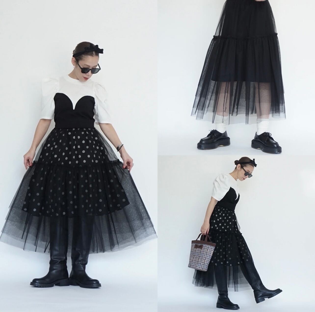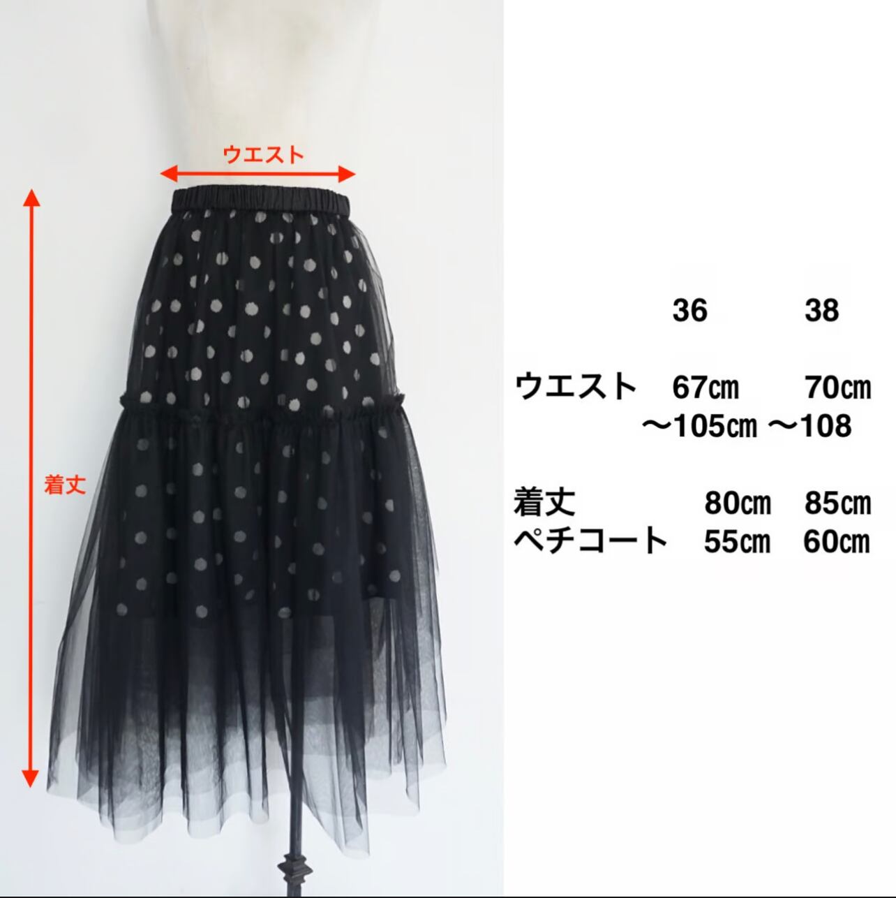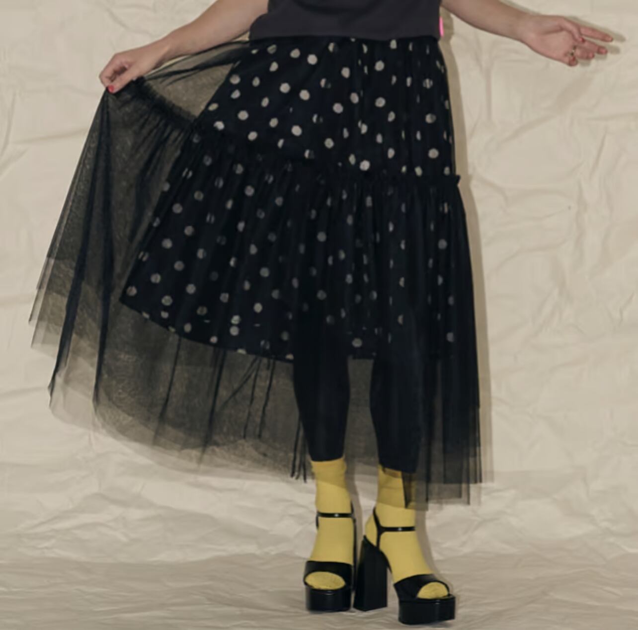 今回のチュールスカートは、セパレートの2枚重ねにしてみました。インナースカートはドットで重ね着用として短めに作っています。ただこちらの良いところは、別々にして、お手持ちのスカートと合わせられるところです。シンプルなブラックのタイトスカートを入れている画像があります。柄のスカートを入れて着るのも楽しいかと思います。チュールはいつもより少しハードめなハリのあるチュールを選びました。重なっている部分をランダムにカットしているので、透ける感じがふわふわと見えてチュールのグラデーションがとてもかわいいなと思いました。ウエスト部分は、どちらも軽くてかさばり感のない細めのゴムにしています。チュールはいつもよりややハードですが、Aラインに広がる感じが大きめでかわいかったです。意外と、いろいろなスカートと相性良く合わせる事ができる印象でした。重ね方次第で着る人の想いそれぞれに、楽しんで貰えるのではないかと思っています。重ね着の楽しみを感じてもらいたいスカートです。
