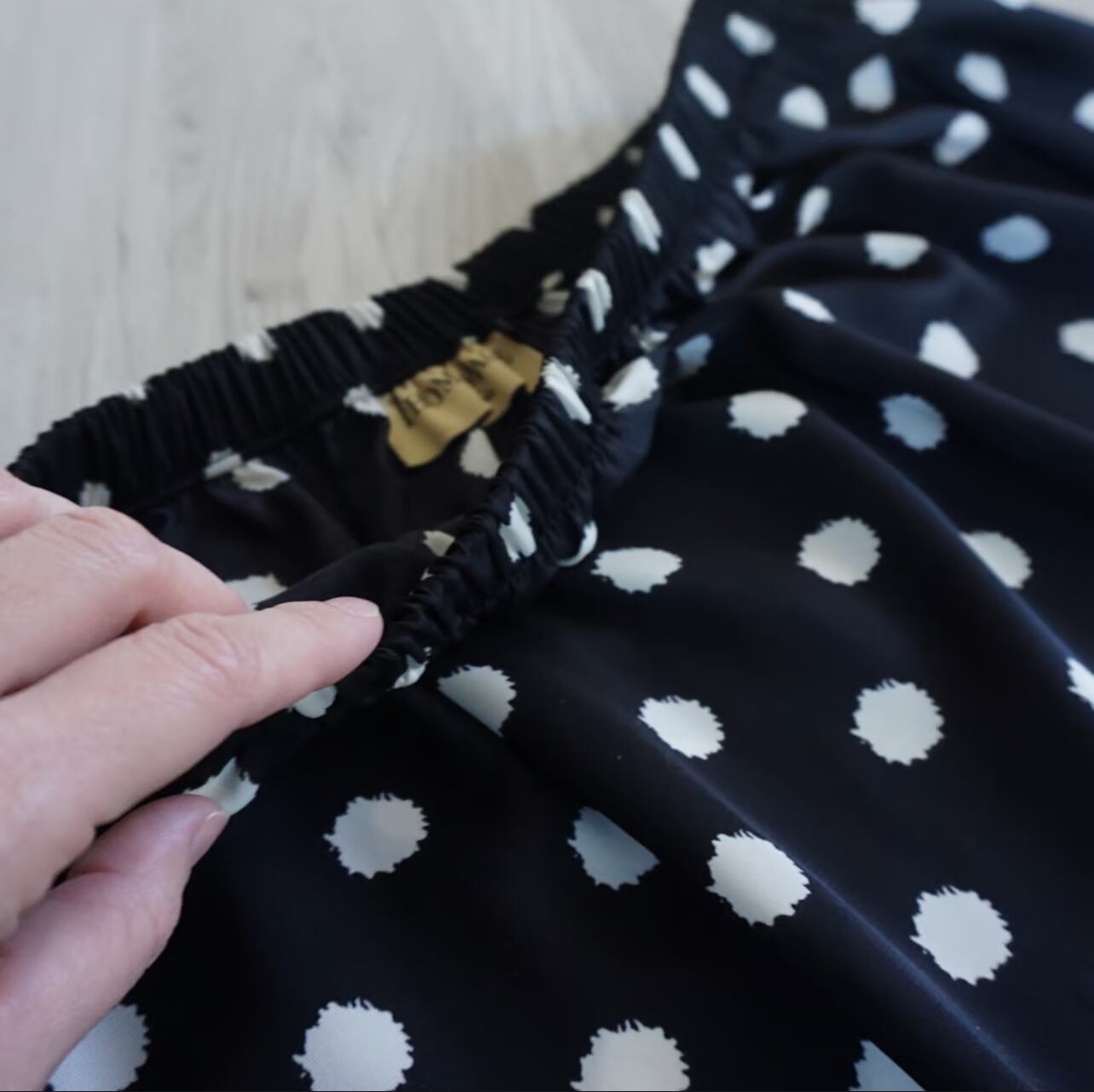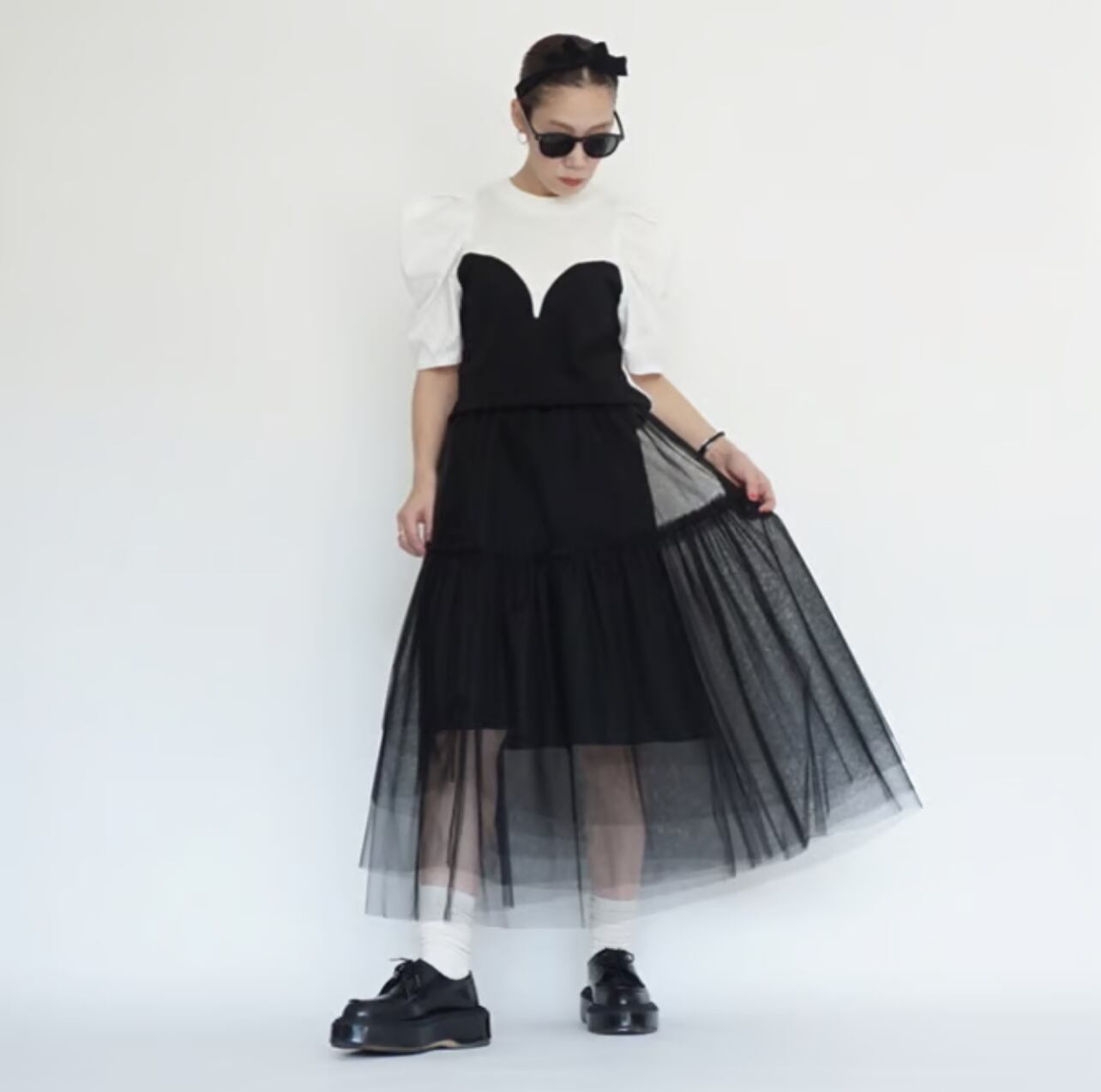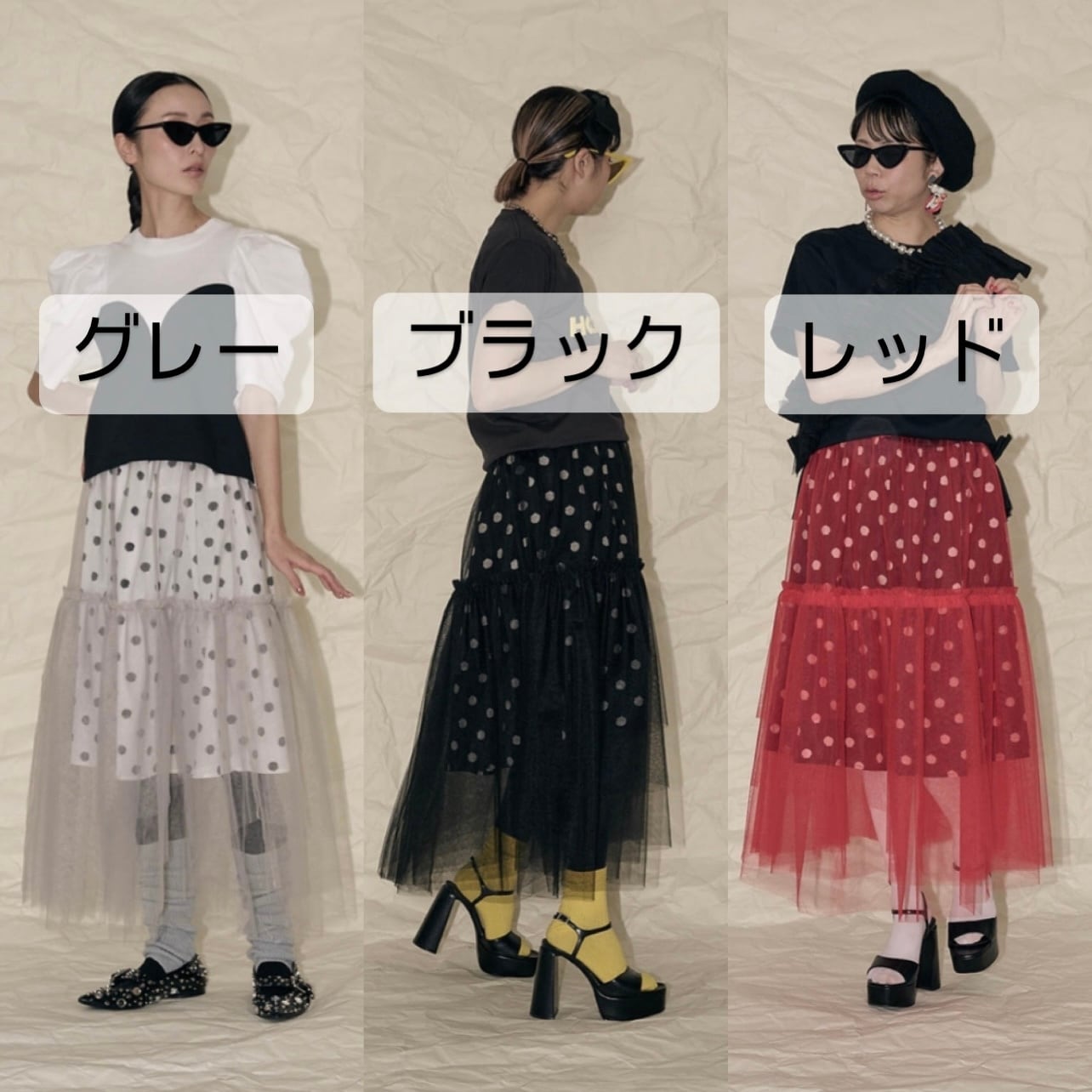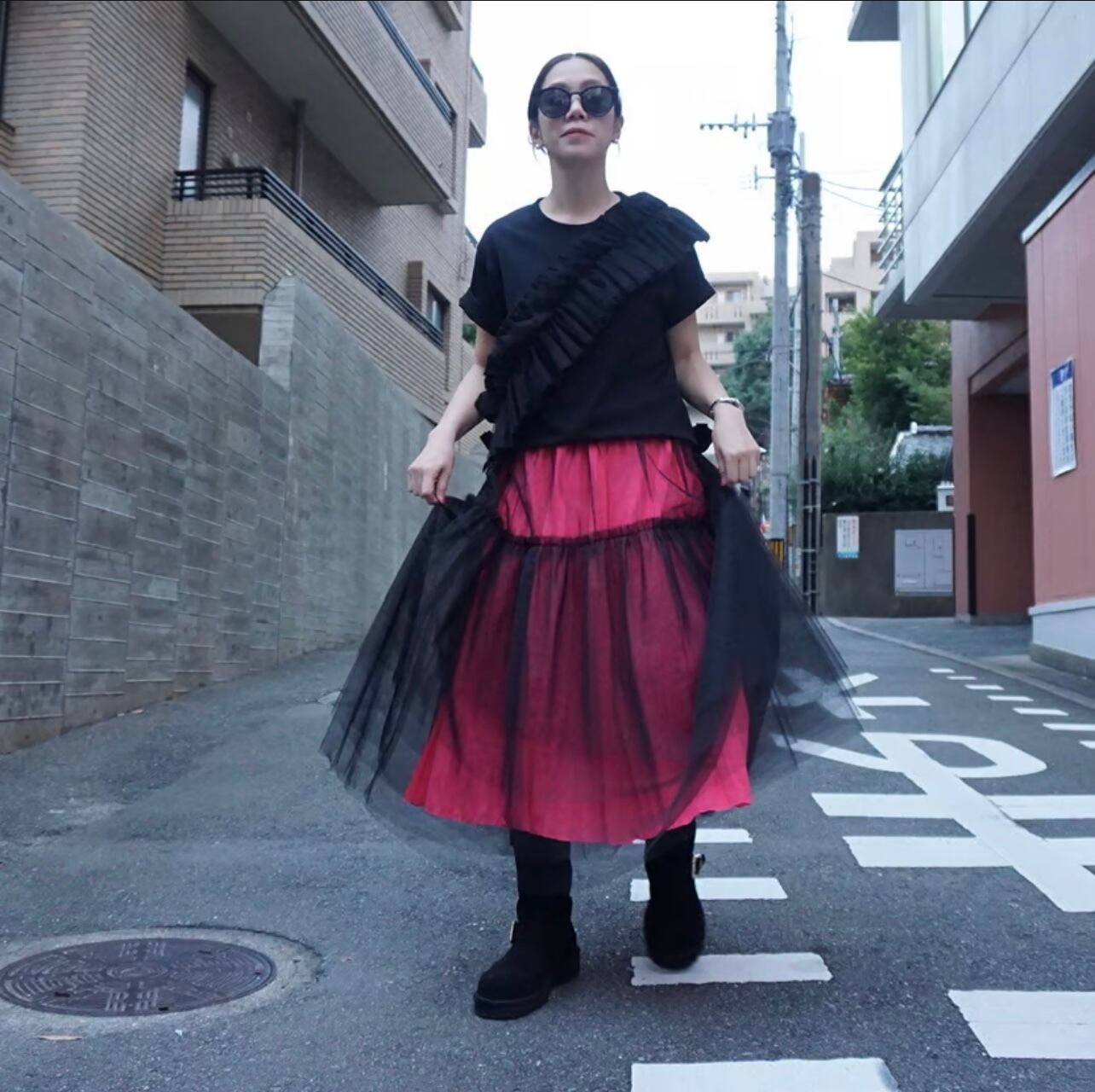 今回のチュールスカートは、セパレートの2枚重ねにしてみました。インナースカートはドットで重ね着用として短めに作っています。ただこちらの良いところは、別々にして、お手持ちのスカートと合わせられるところです。シンプルなブラックのタイトスカートを入れている画像があります。柄のスカートを入れて着るのも楽しいかと思います。チュールはいつもより少しハードめなハリのあるチュールを選びました。重なっている部分をランダムにカットしているので、透ける感じがふわふわと見えてチュールのグラデーションがとてもかわいいなと思いました。ウエスト部分は、どちらも軽くてかさばり感のない細めのゴムにしています。チュールはいつもよりややハードですが、Aラインに広がる感じが大きめでかわいかったです。意外と、いろいろなスカートと相性良く合わせる事ができる印象でした。重ね方次第で着る人の想いそれぞれに、楽しんで貰えるのではないかと思っています。重ね着の楽しみを感じてもらいたいスカートです。