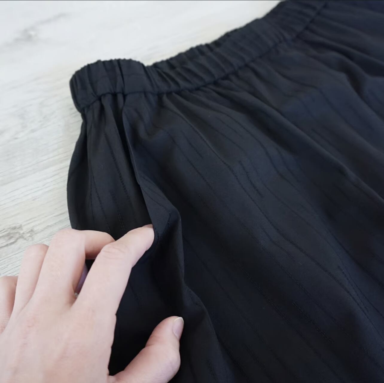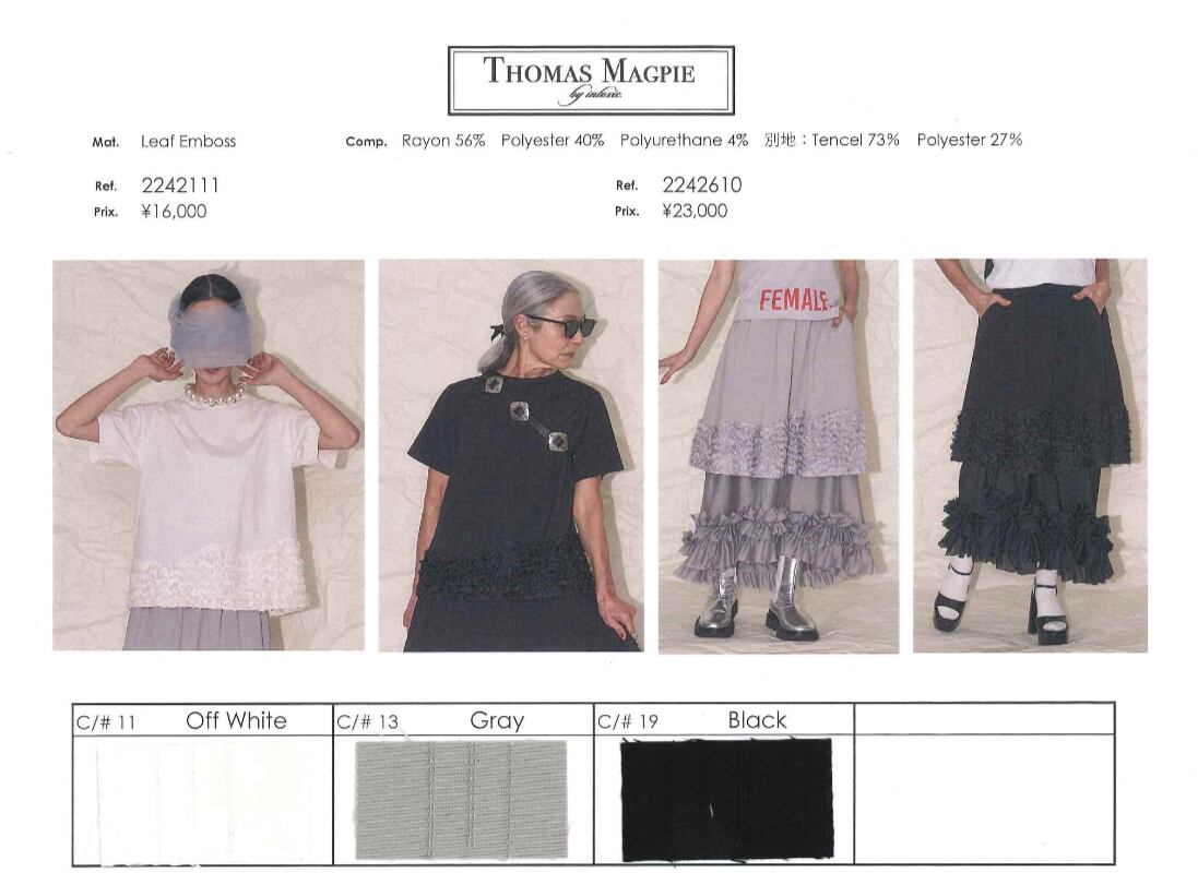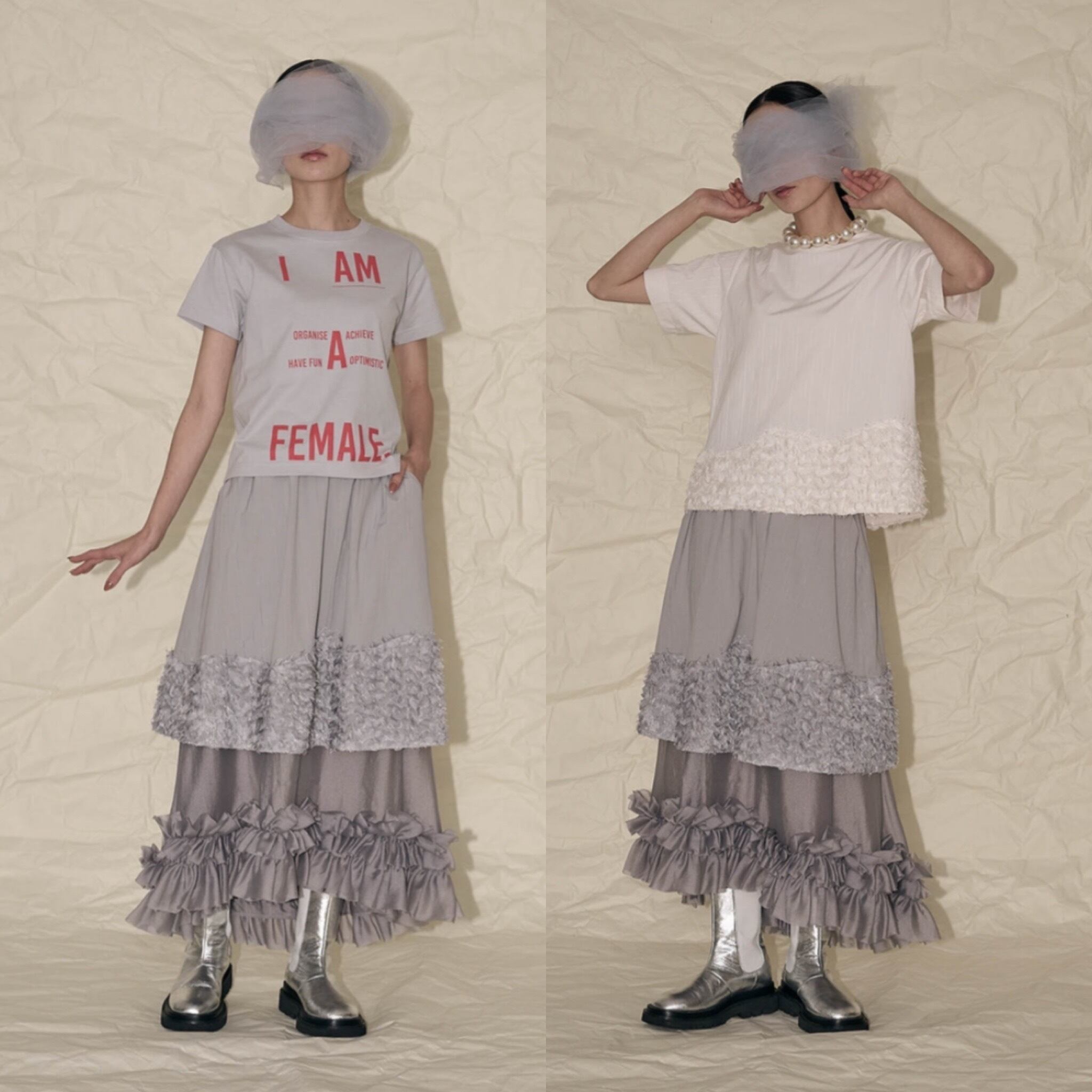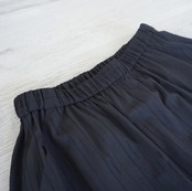 個人的に今回、一番に欲しいアイテムです。このスカートは、まだ私がパターンを勉強している15年くらい前に作ったデザインからの派生でリデザインしたものになります。自分が着たくて自分用に作ったスカートです。スカートが二重になっています。かなり個性的なデザインですが、上のスカートはややハリ感があり、下のスカートは柔らかな動きの出る軽い素材で光沢があります。大きめに下のスカートにはフリルをあしらい、後ろ下がりのデザインにしました。また、上のスカートにはフェザーのような立体感のある素材を裾回りにアシンメトリーにつけて、一風変わった雰囲気にしてみました。トップスはシンプルでもちょっと変わった雰囲気が出来上がります。パンツにスカートを重ねるスタイルが流行していますが、ダブルのランダムな裾のスカートも楽しいのではないかなと?と思いデザインしています。セパレートにはならず、ウエストは軽めのゴムで履きやすい作りにしました。両サイドポケット付き。例えばオーバーサイズのTシャツなどでもカジュアルに着用できると思います。普段着としてたくさん着てもらいたい、ちょっと変わったスカートです。私は一番にこのスカートを購入したいと思っています。いろいろな着回しが楽しめると思います。