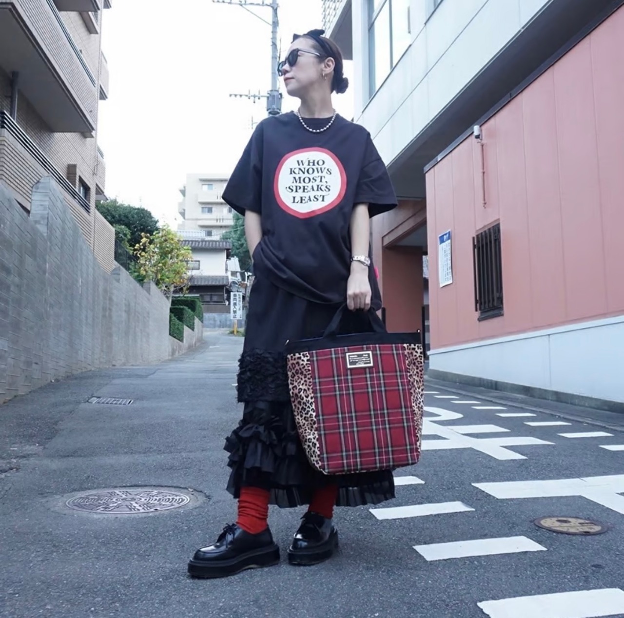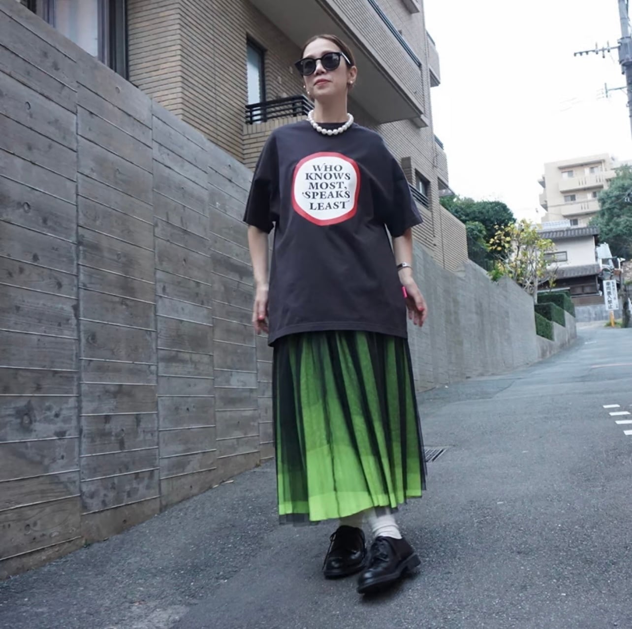 Tシャツはいつもより更に少しオーバーサイズにしました。ヒップがすっぽり隠れるサイズ感。最近気に入っているTシャツのサイズはメンズのLサイズ。かなり身頃も広めになっています。ミニボトムとも好相性。また、パンツやスカートにも便利なサイズ。体型を選ばす、男性でも180cmくらいの方にも良いサイズになっています。