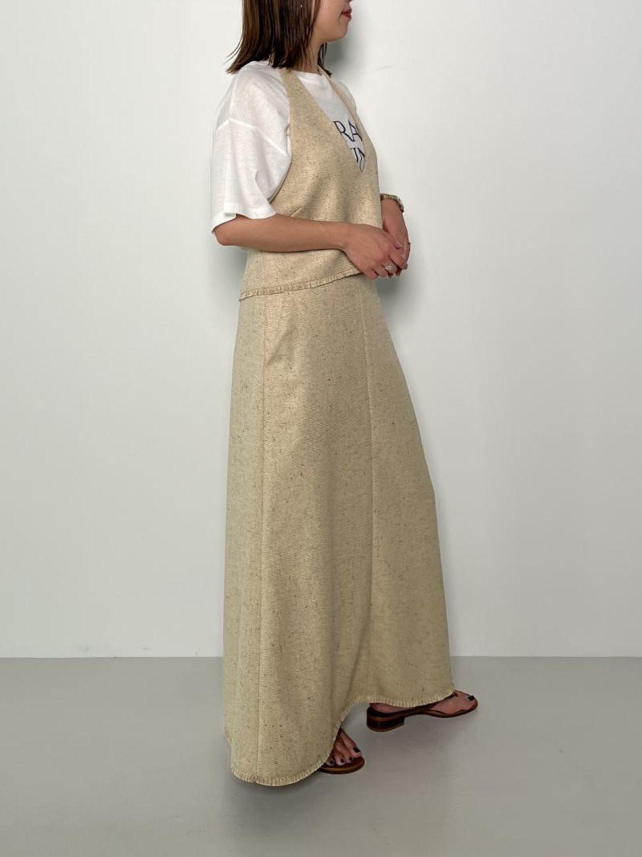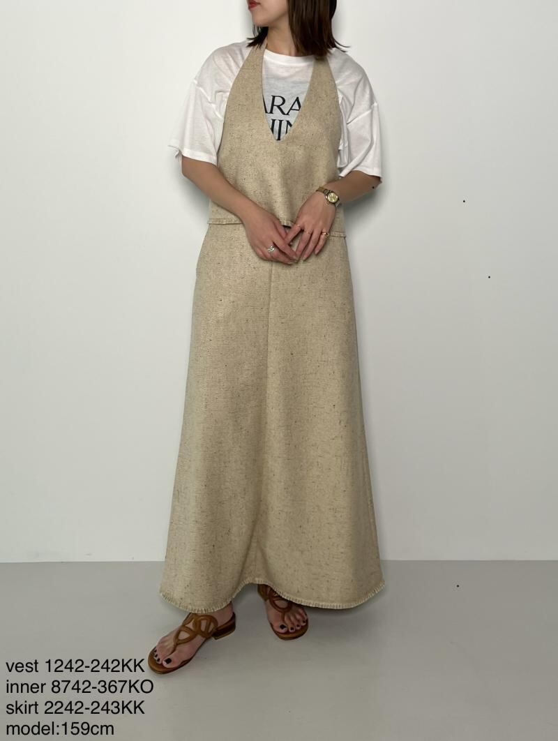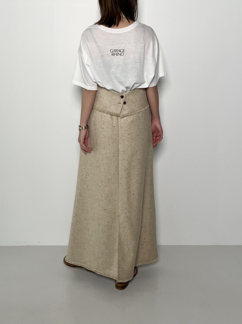 女性らしいシルエットを演出しながらも、後ろウエストはゴムでリラックスな着心地を設計しました。ヘムにフリンジ使いを施し、カジュアル感とラフさを演出しました。