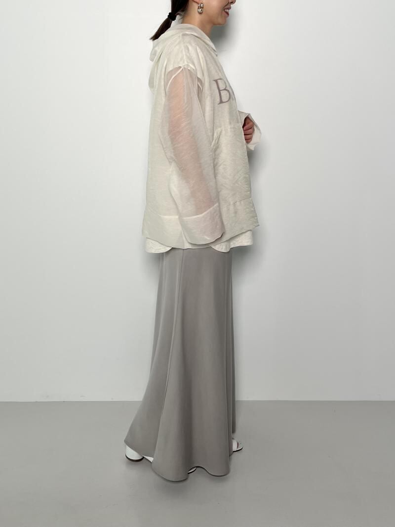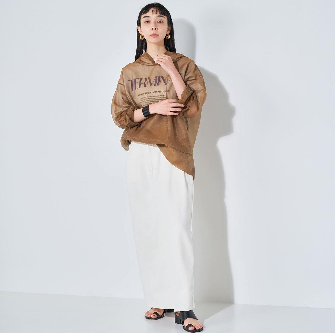 カジュアルアイテムに女性らしい素材を落とし込むことで鮮烈に仕上げました。