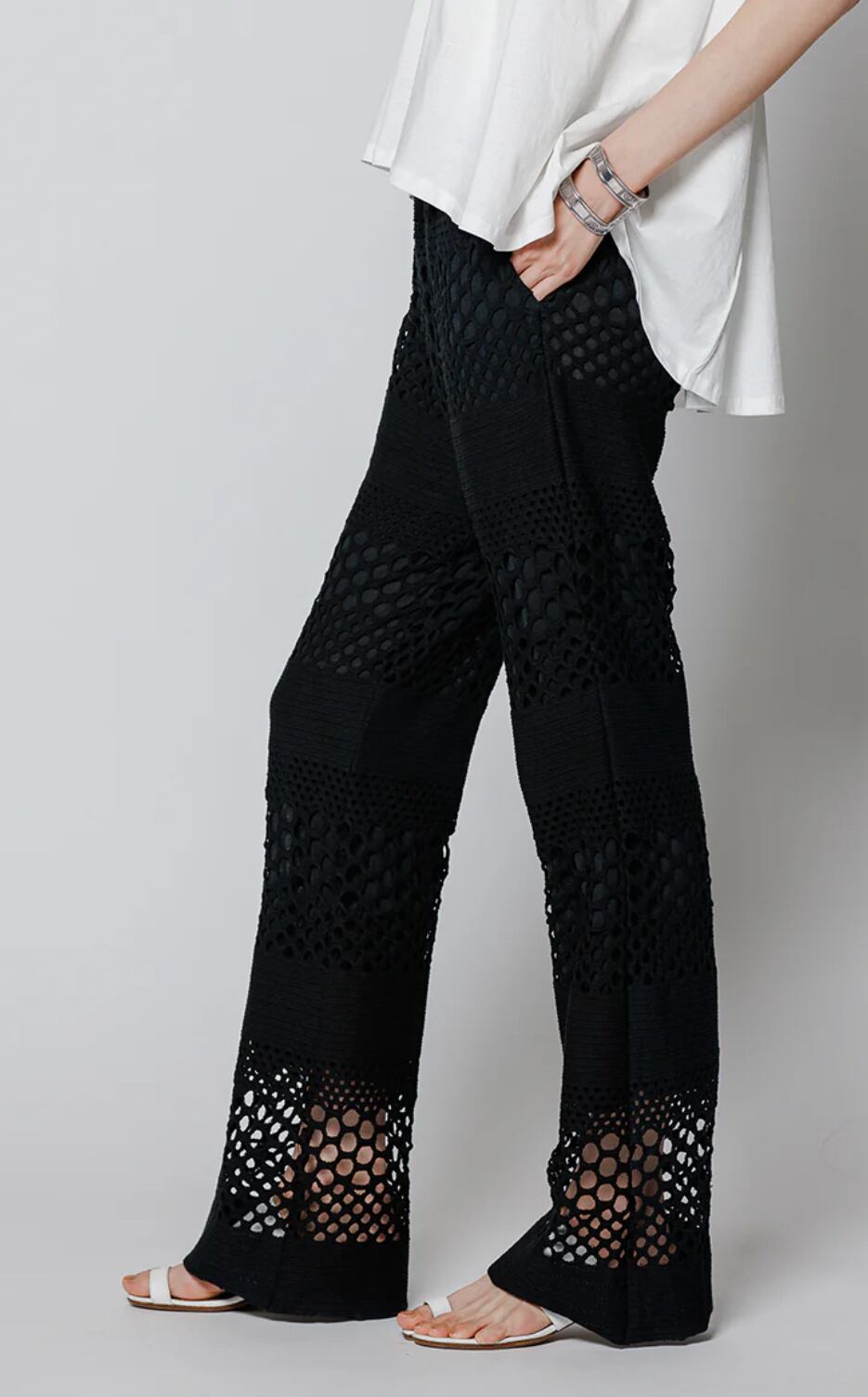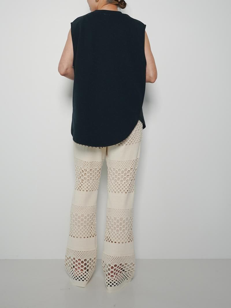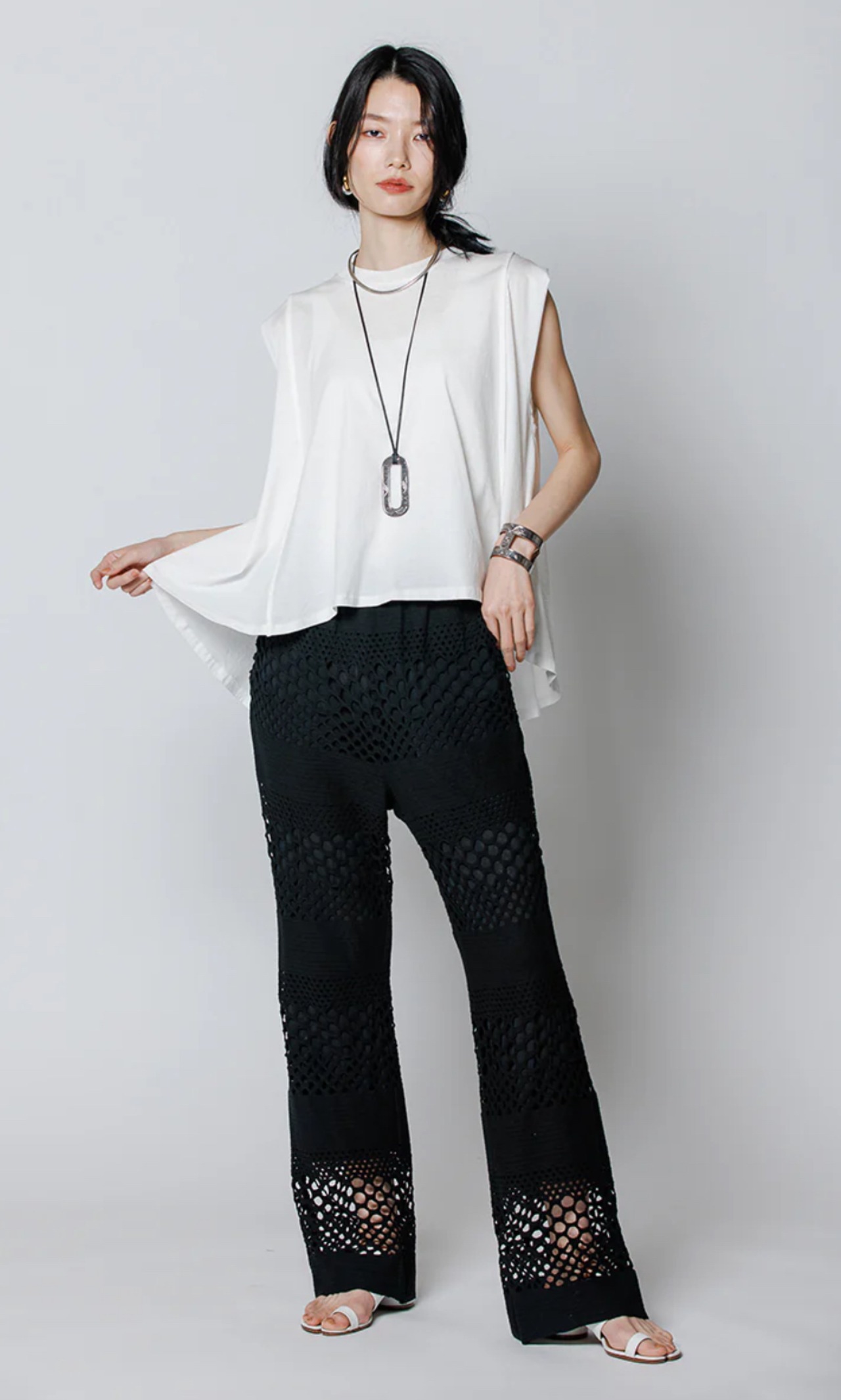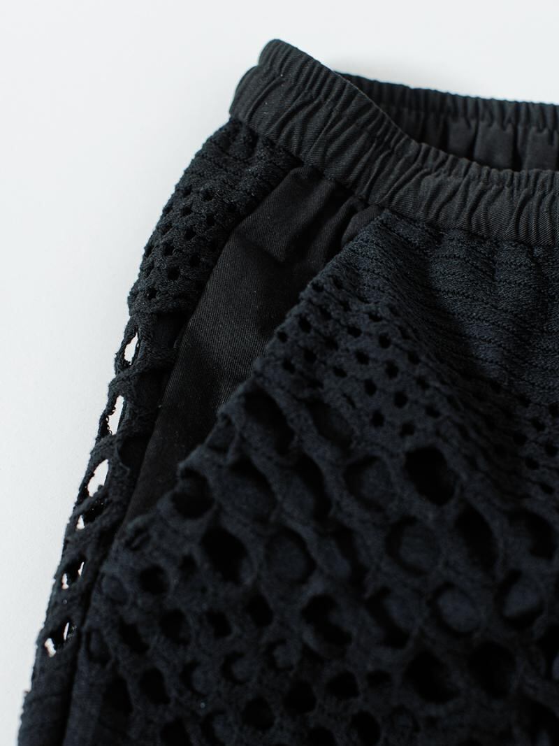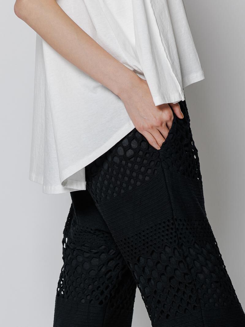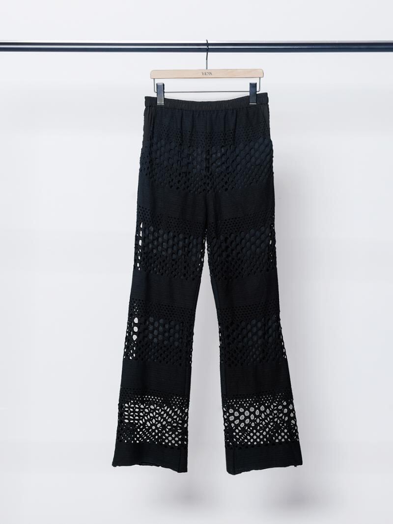さまざまなサイズのメッシュ編みを組み合わせたボーダー調のニットレース生地を使用したパンツです。