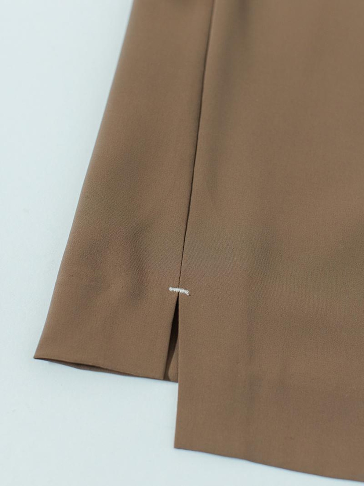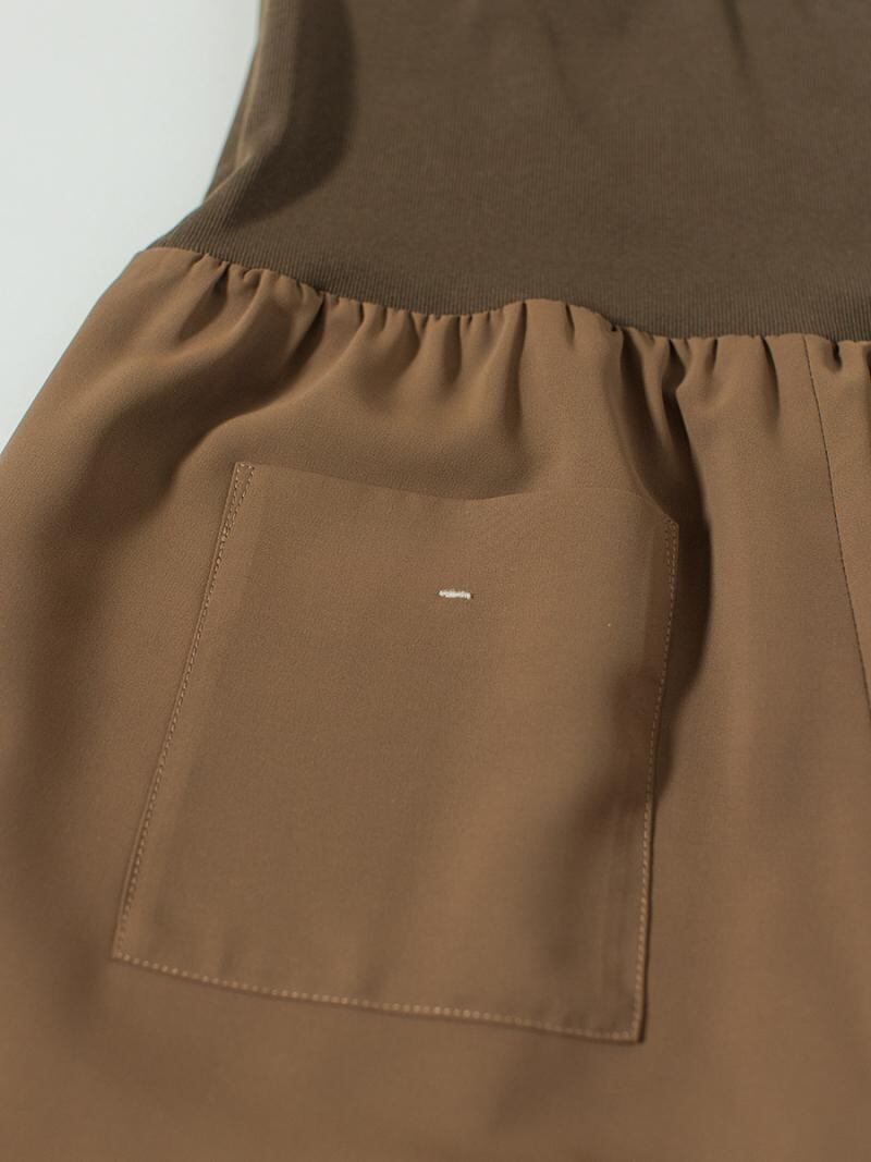 使用している生地は裏地無しでぎりぎり透けないくらいの薄さのものを選定、暑い夏場でも涼しく着用いただけます。ポリエステル100%なので、シワになりにくいイージーケアなのもうれしいポイントです。裾は前が長く後が短い段違いデザインを採用、足長効果を生み出します。 幅広のリブベルトは胸下まで伸ばしたり、折り返したり、さまざまな着こなしが楽しめます。 トップスをインするとコルセットのようなデザインになります。 トレンドの短丈トップスとの合わせもおすすめです。