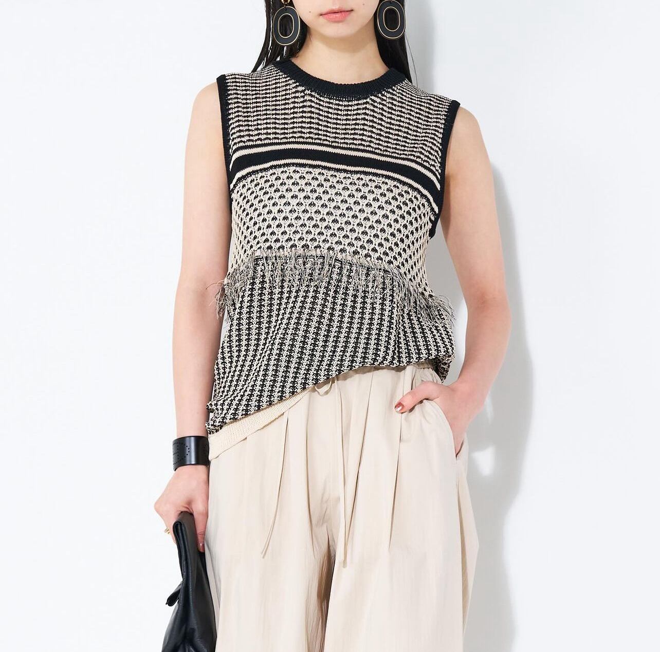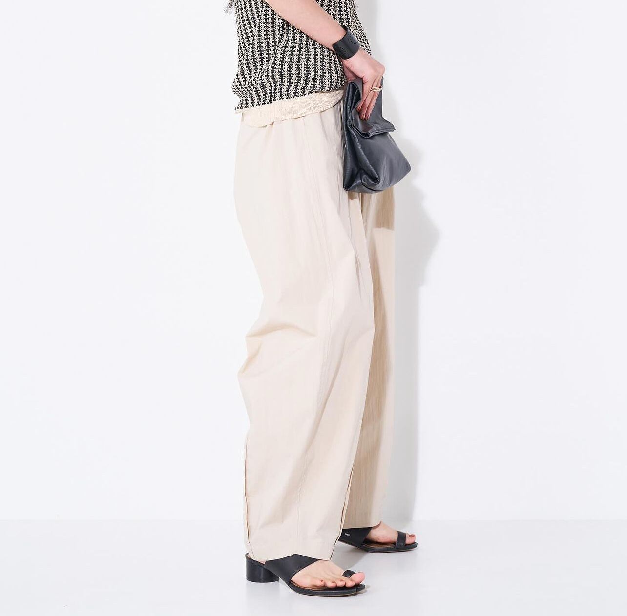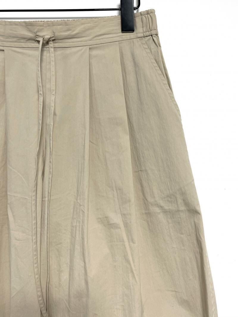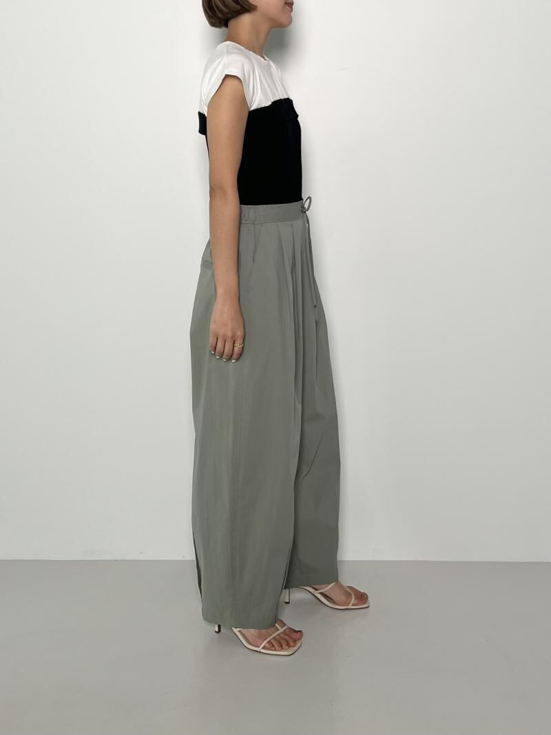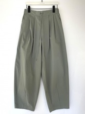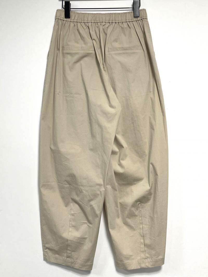 丸いシルエットが鮮烈な印象のワイドパンツ。フロントに施したタックや脇線でボリュームを出しながら、裾周りはダーツをとることですっきりとさせました。メリハリの利いた女性らしいシルエットを設計しています。ウエスト部分はゴム仕様にすることでリラックスな着心地に。フロントの共布テープでサイズの調節も可能なところもポイントです。