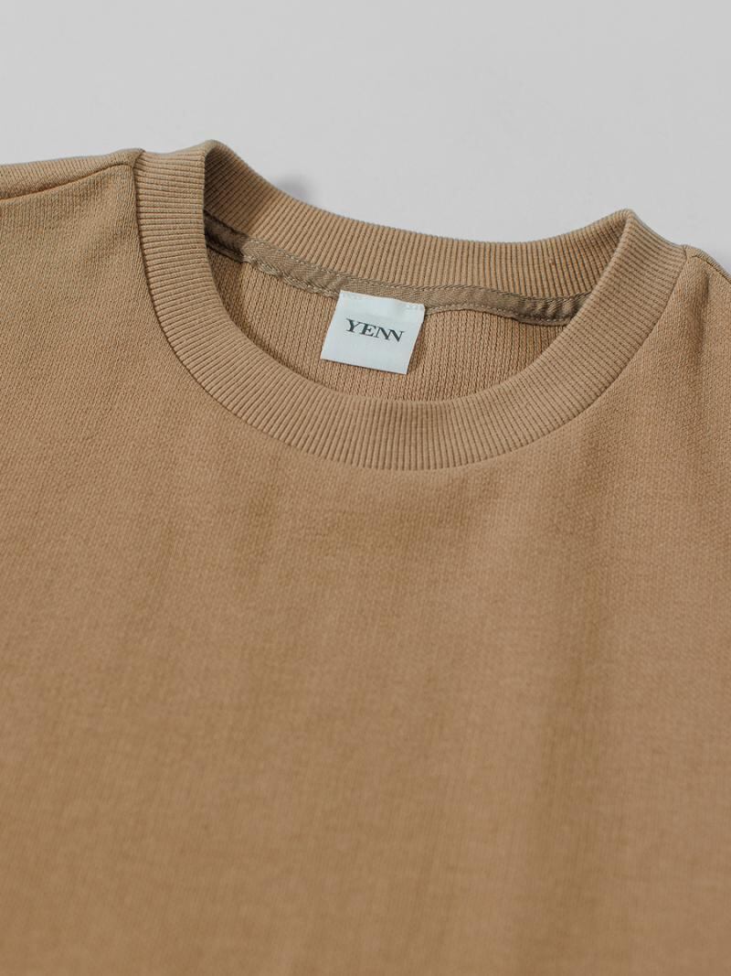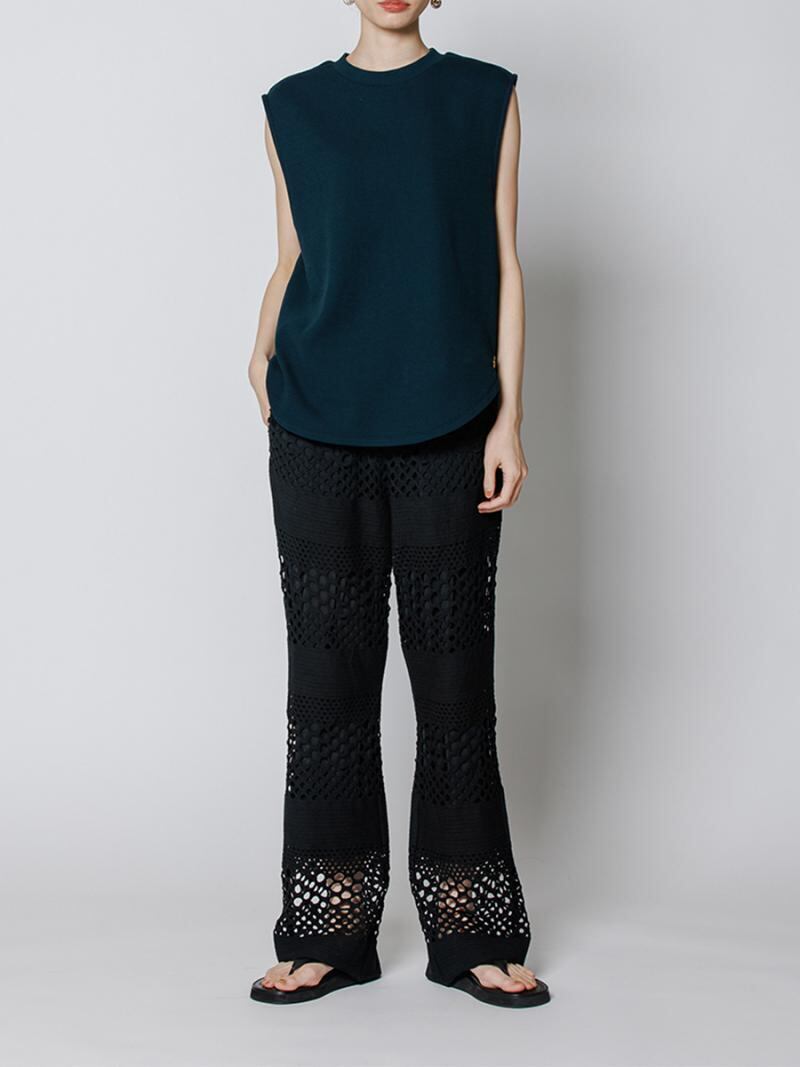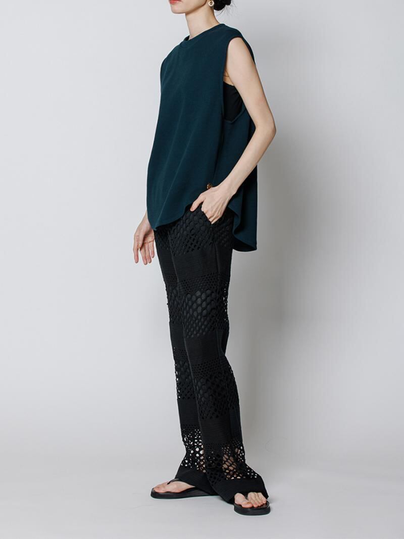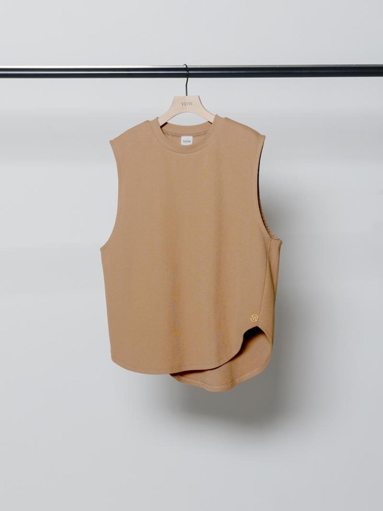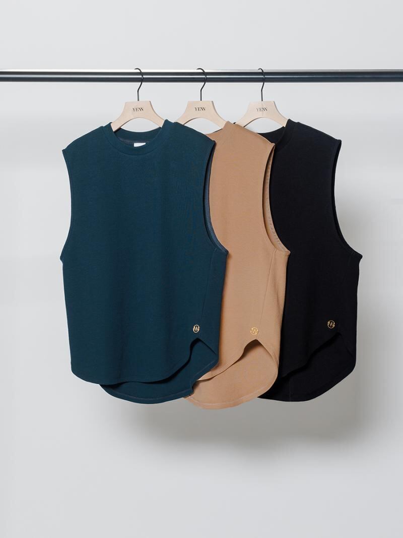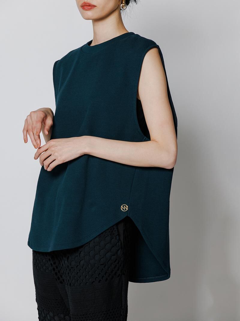 異なる編み方で、表面は天竺、裏面はニットのようなざっくりとした表情の、ダブルフェイスジャージーで作るベスト型プルオーバーです。ほどよい厚みがあり、一見ウラケのように見えますが裏側が毛羽立っていないのでスムースな肌触りがポイントです。 バイオ加工されているので、柔らかさと加工感がプラスされています。 形はアームホールが大きく開いたシンプルなプルオーバーですが、裾のツイストさせたヘムラインと、前側に振った裾のカーブに付けたオリジナルロゴチャームもポイントです。