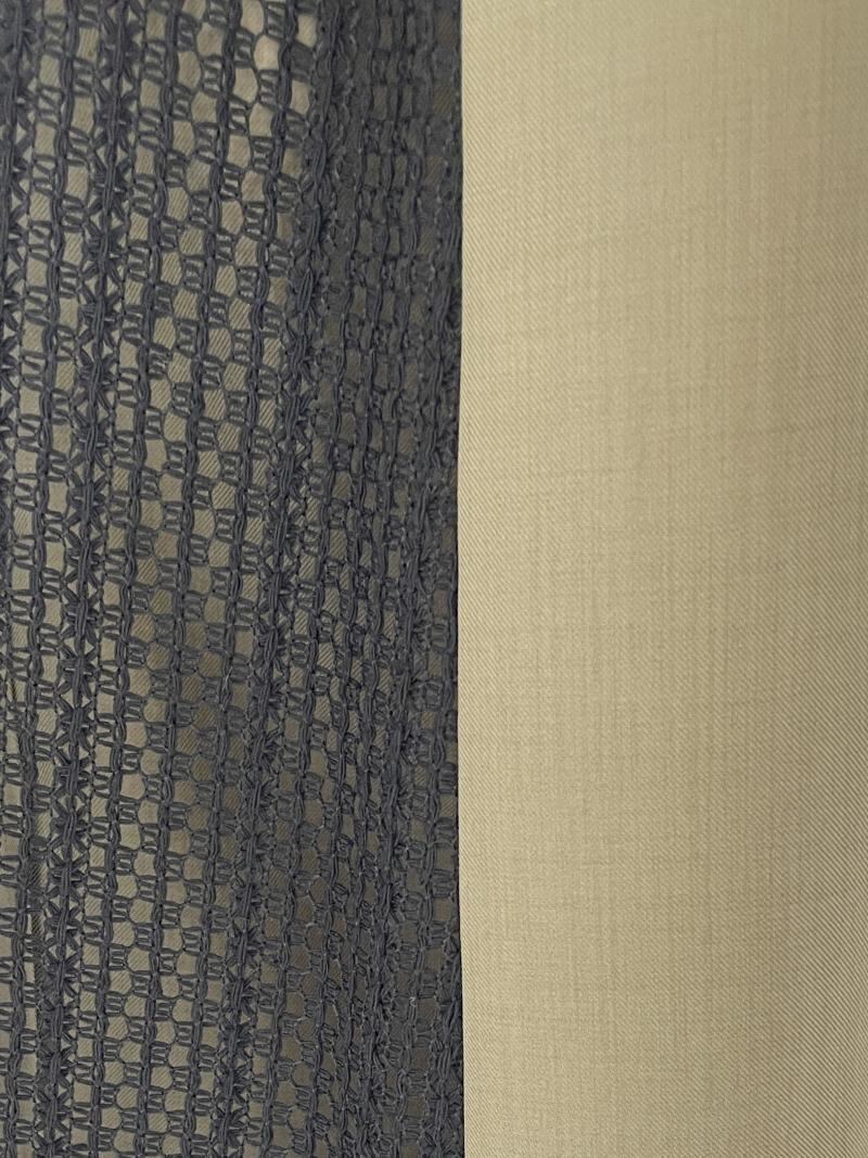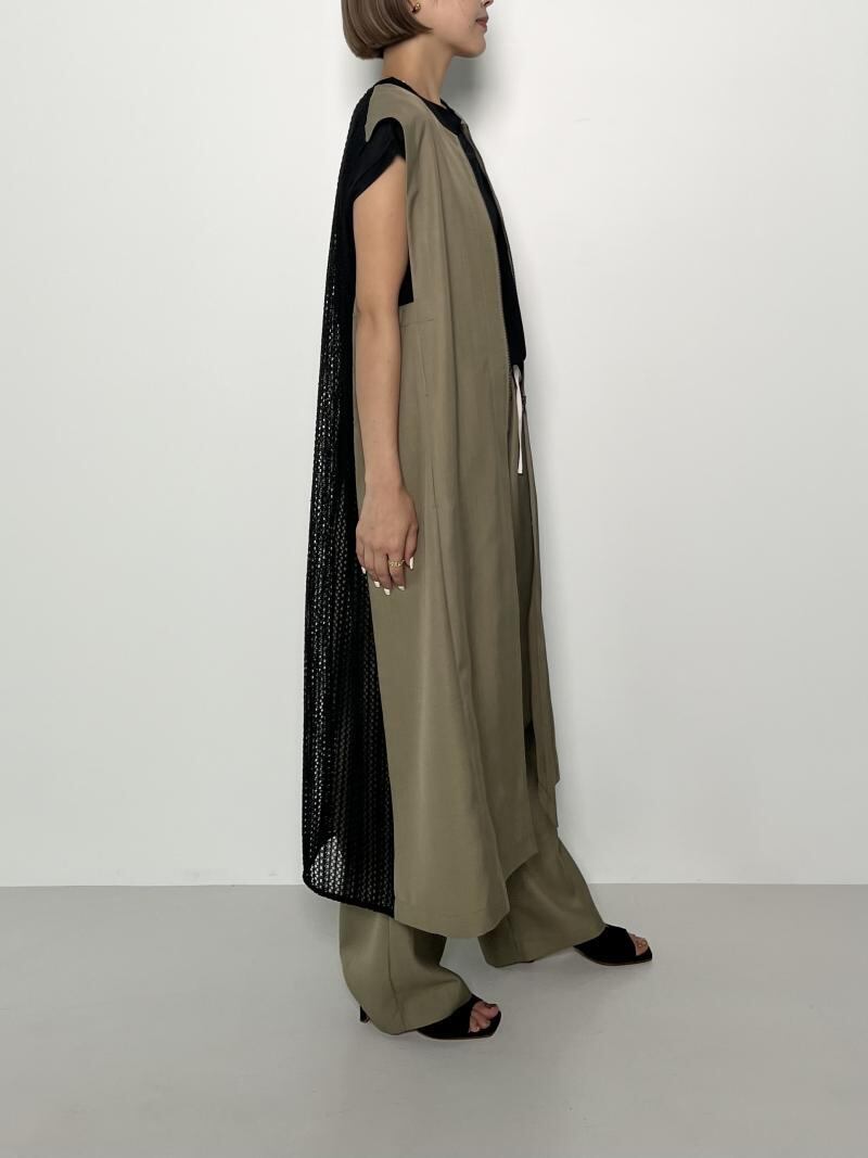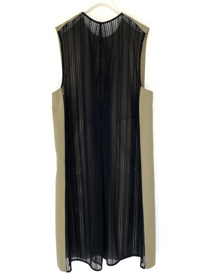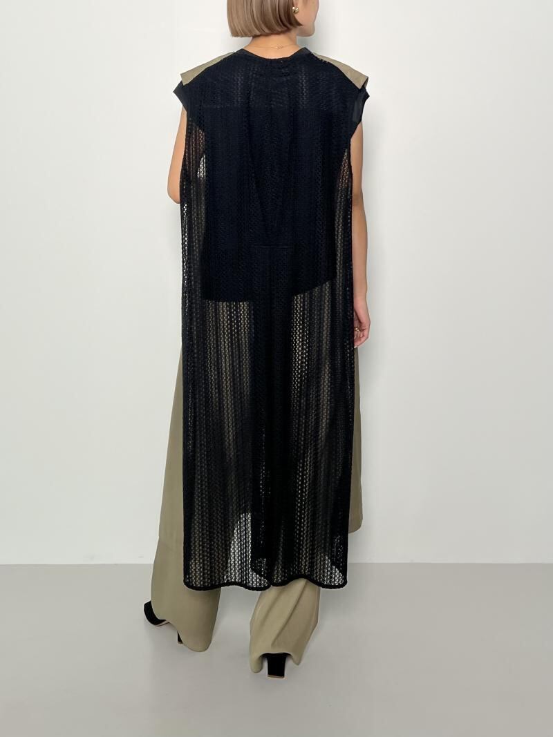 交織のリネン調合繊とクラフト感のあるレース生地をドッキングさせたロングジレになります。