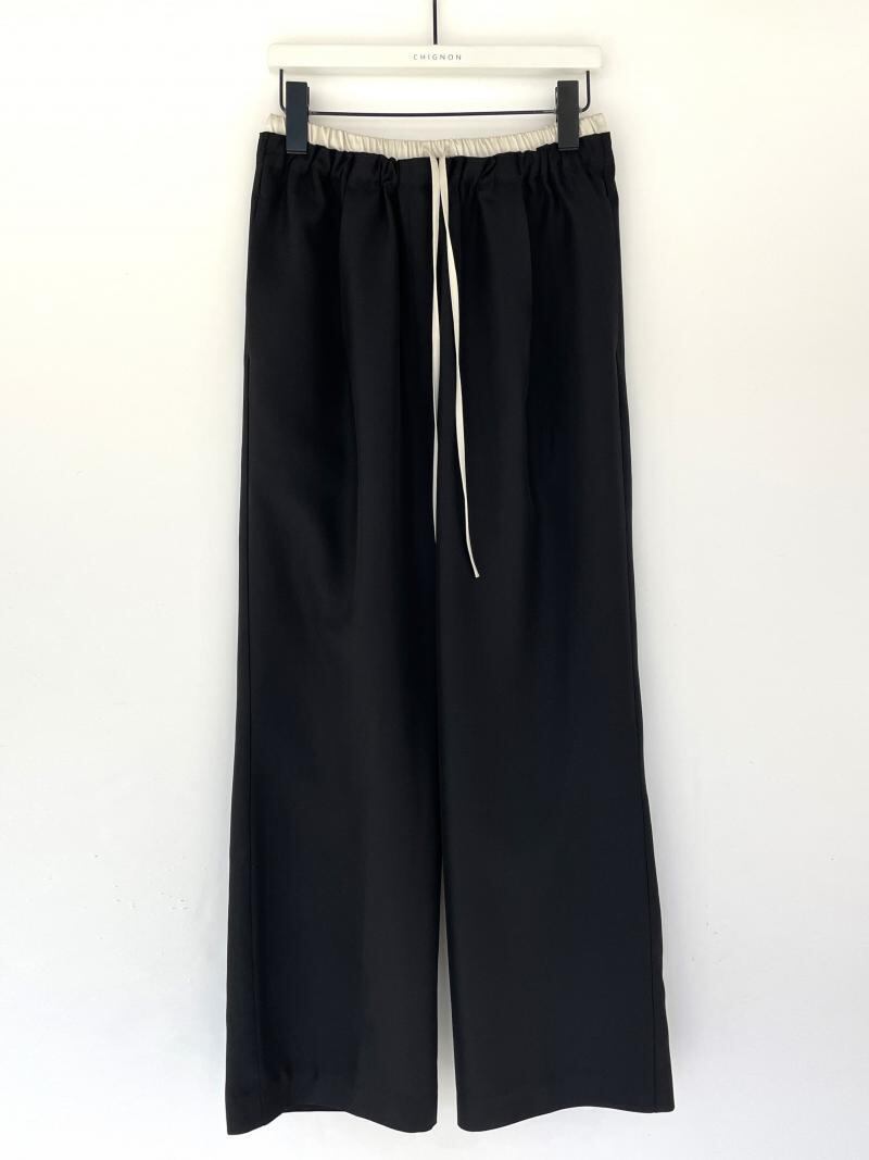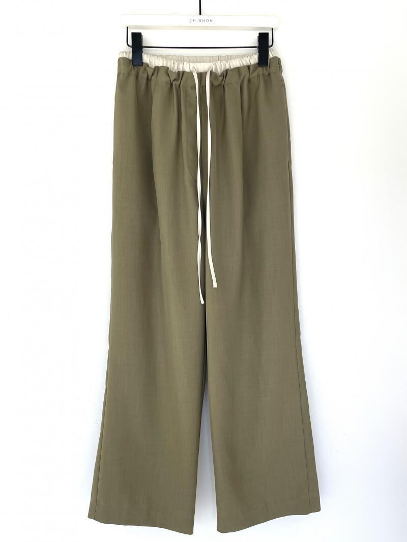 シワになりにくくサラッとしたタッチの交織のリネン調合繊とウエスト周りをサテン地のドッキングさせたイージーなパンツになります。