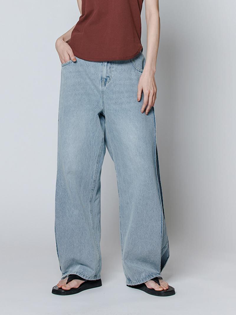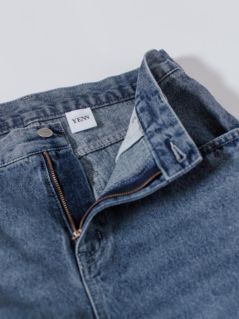 前から見るとすっきりとしたストレートシルエットで、足の動きによって開くプリーツがシルエットの変化を生み出すのがポイントです。裾にかけて萎むデザインになっていて、裾でたるませて履くとカーブデニムのようなシルエットになります。 足回りにボリュームがある分ウエスト周りはすっきりと仕上げていて、野暮ったくならないようバランスを計算して設計しています。 スタリングの主役になるデザインデニムパンツです。