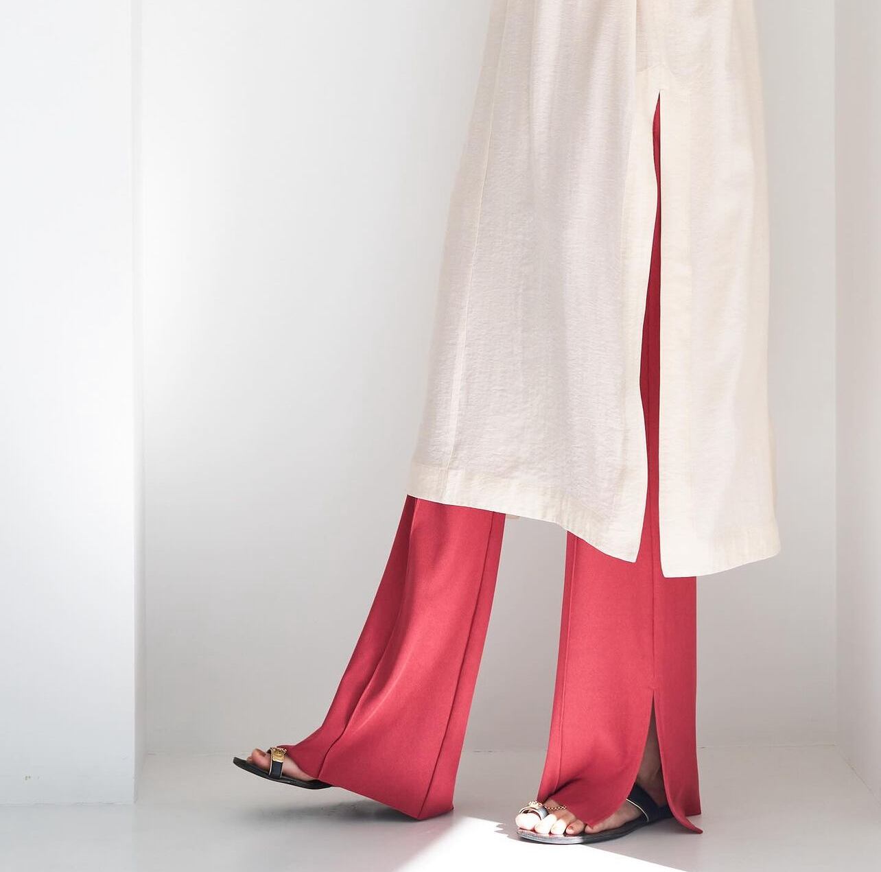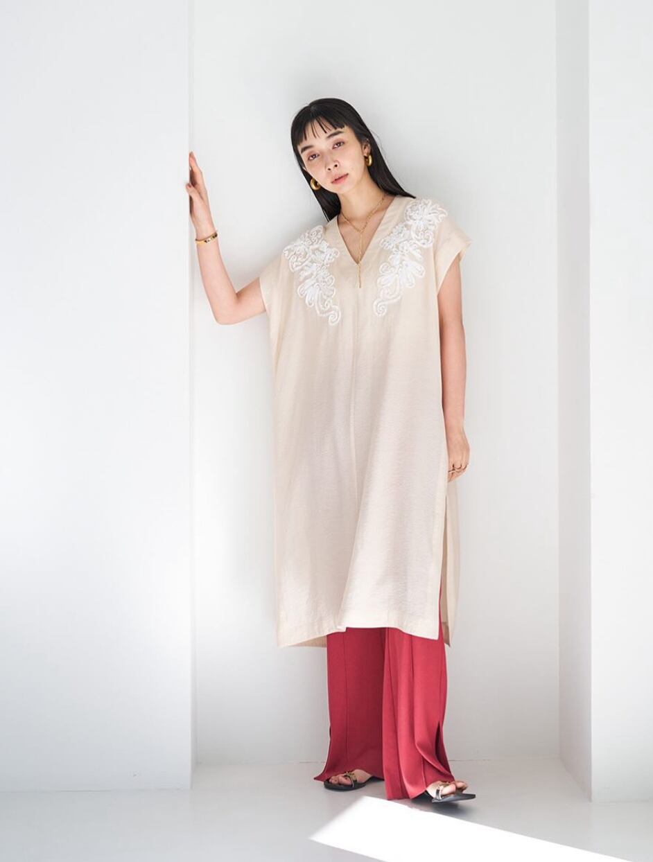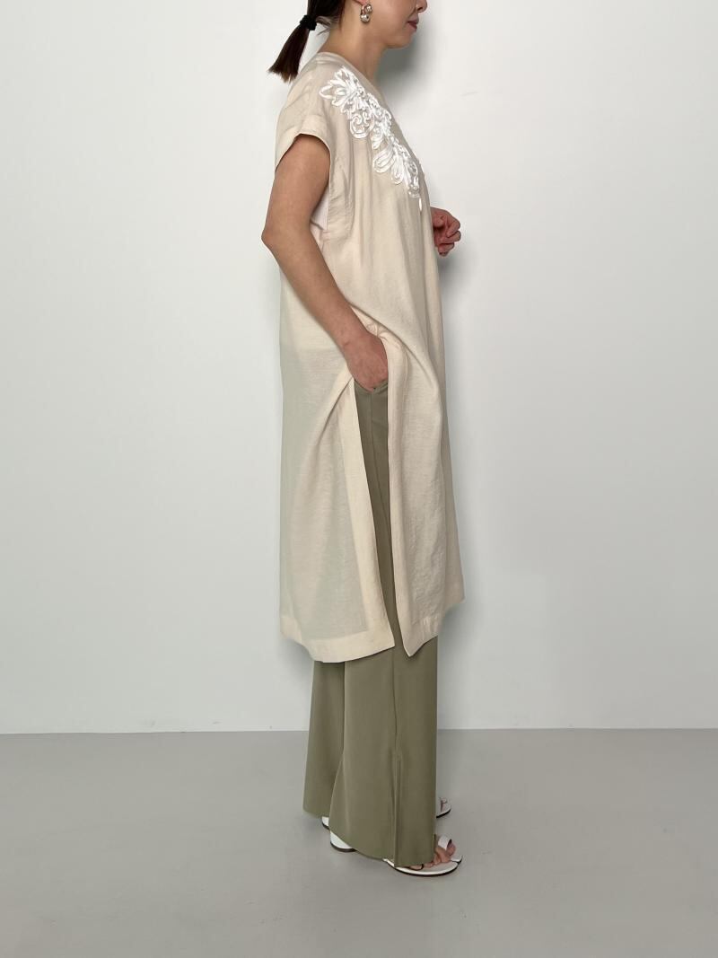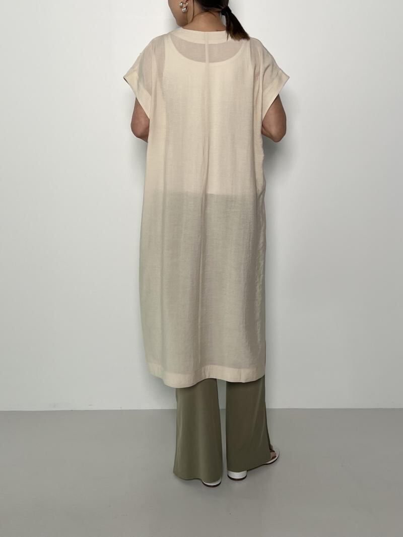 ワイドシルエットのロング丈に設計し、リラックスな着心地を設計。襟ぐりの開きや両サイドのロングスリットで軽さも演出しています。