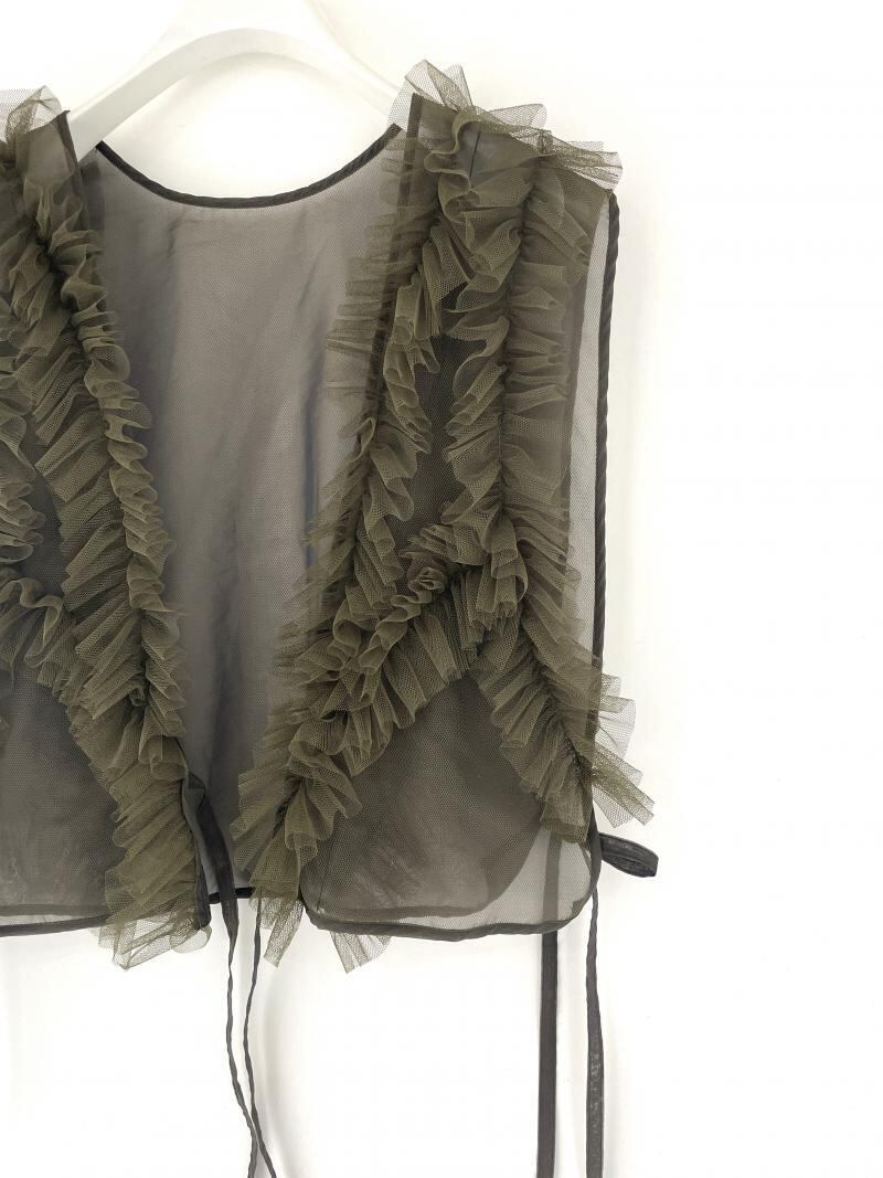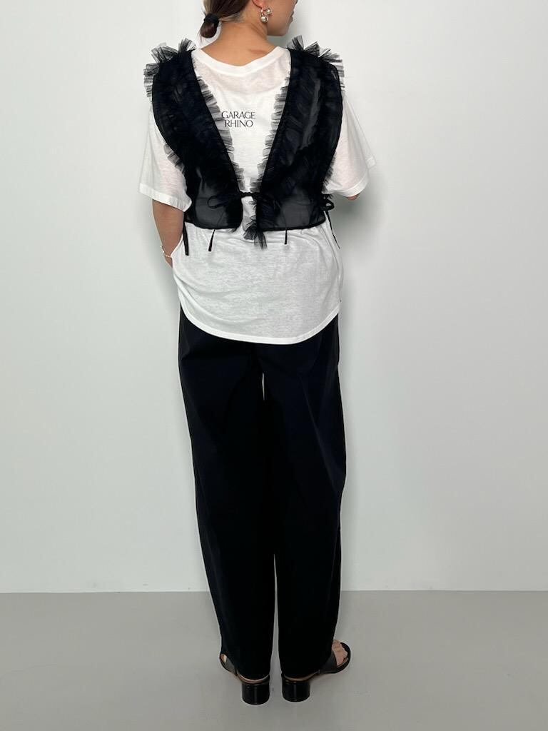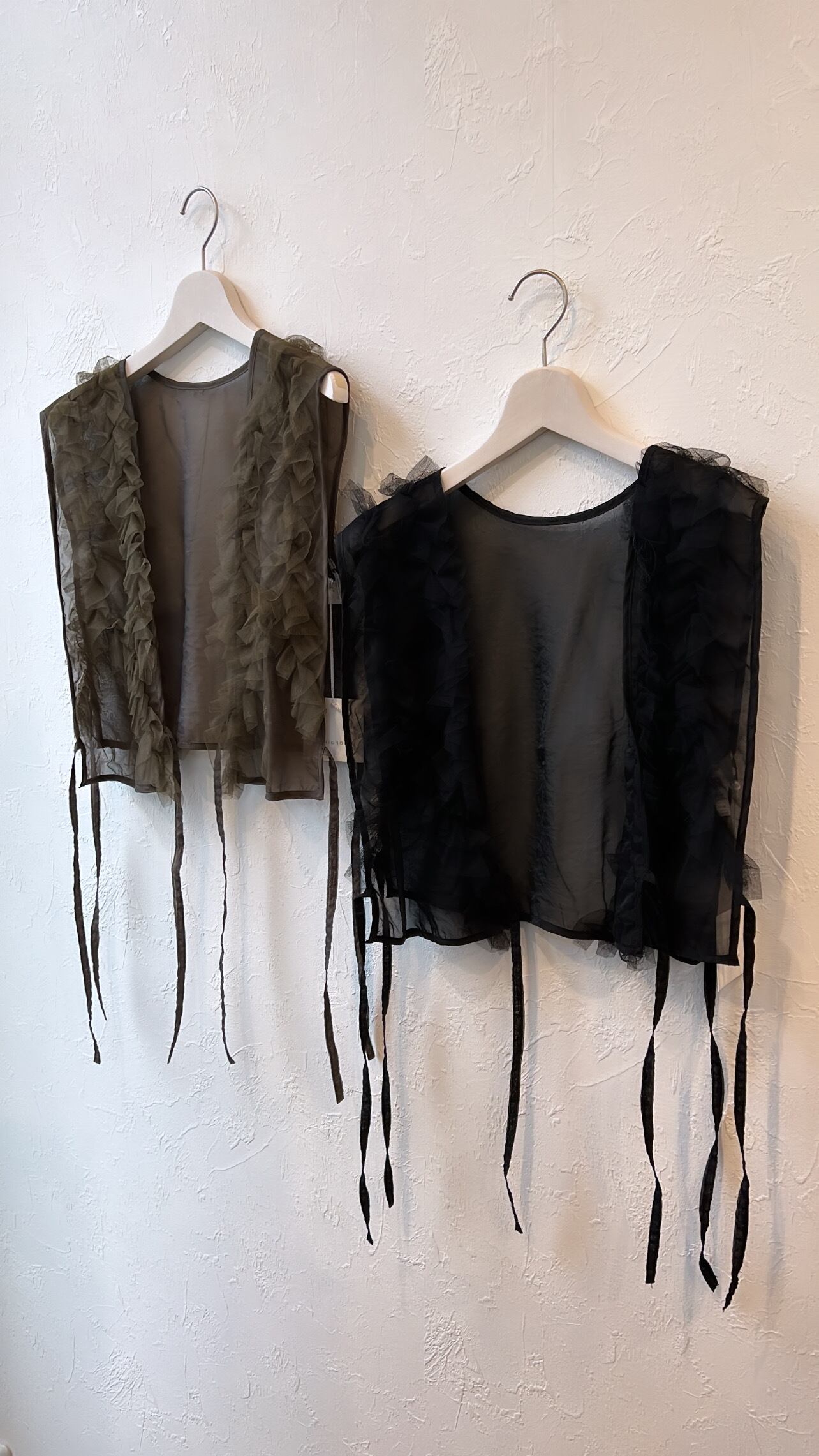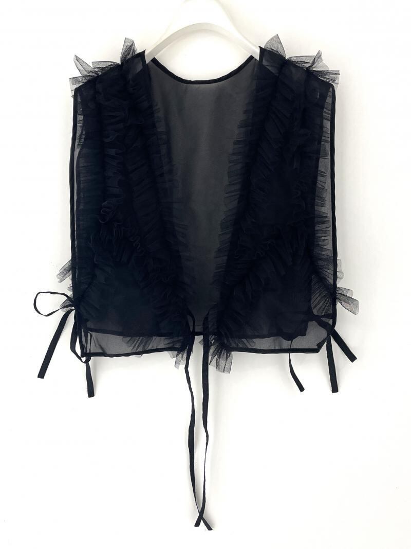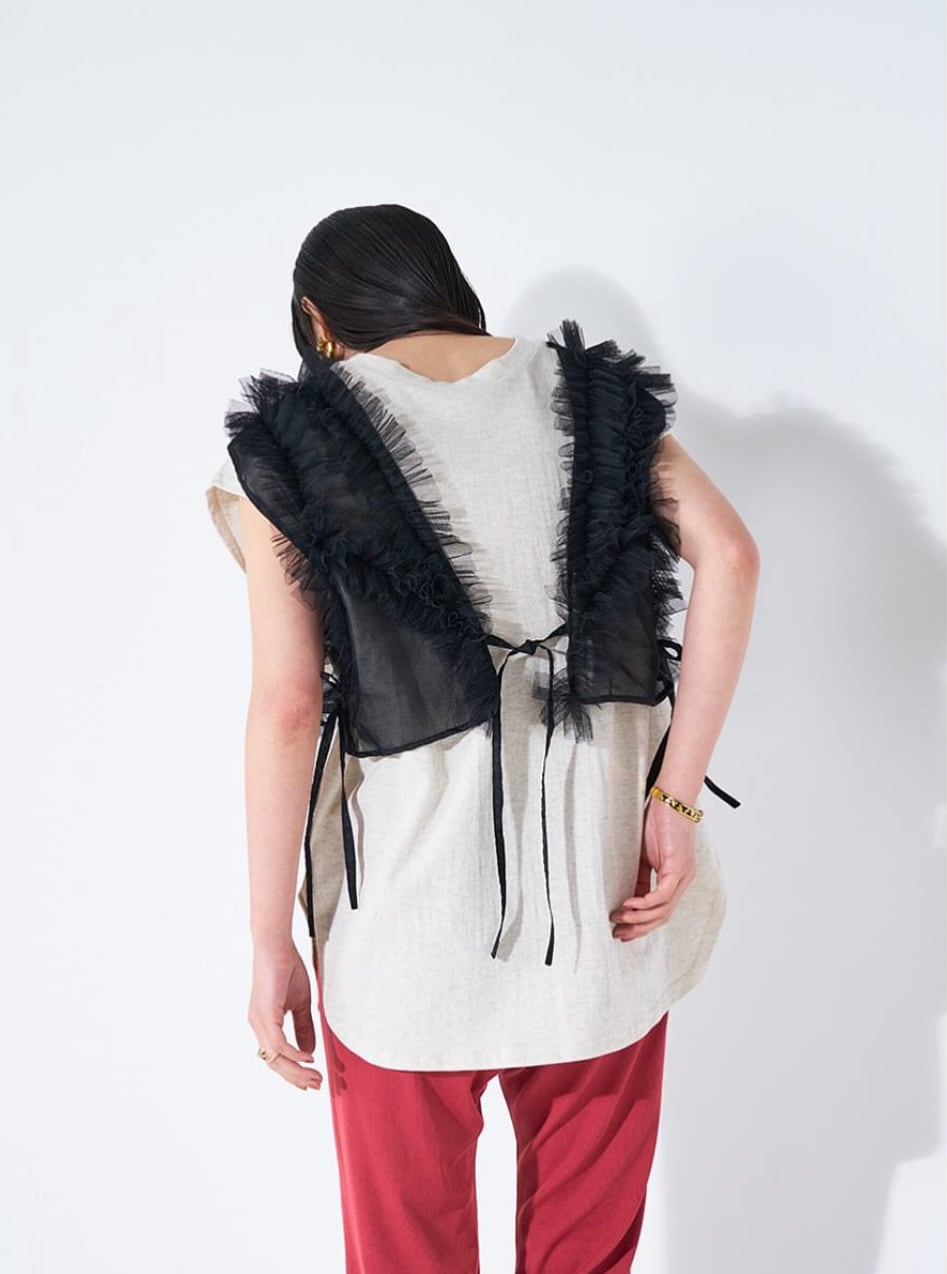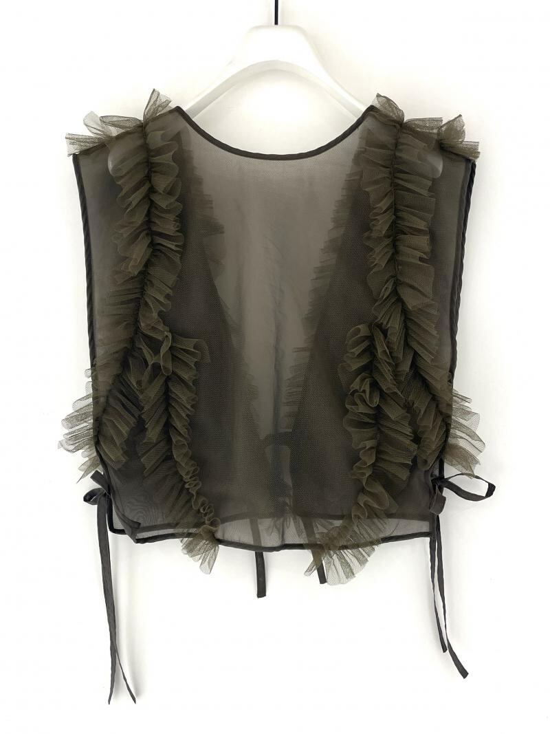 柔らかいチュール素材のフリルを施したベスト。甘くなりすぎない様に柄を組んでいるので子供っぽくならずに、Tシャツレイヤードを楽しんで頂けます。