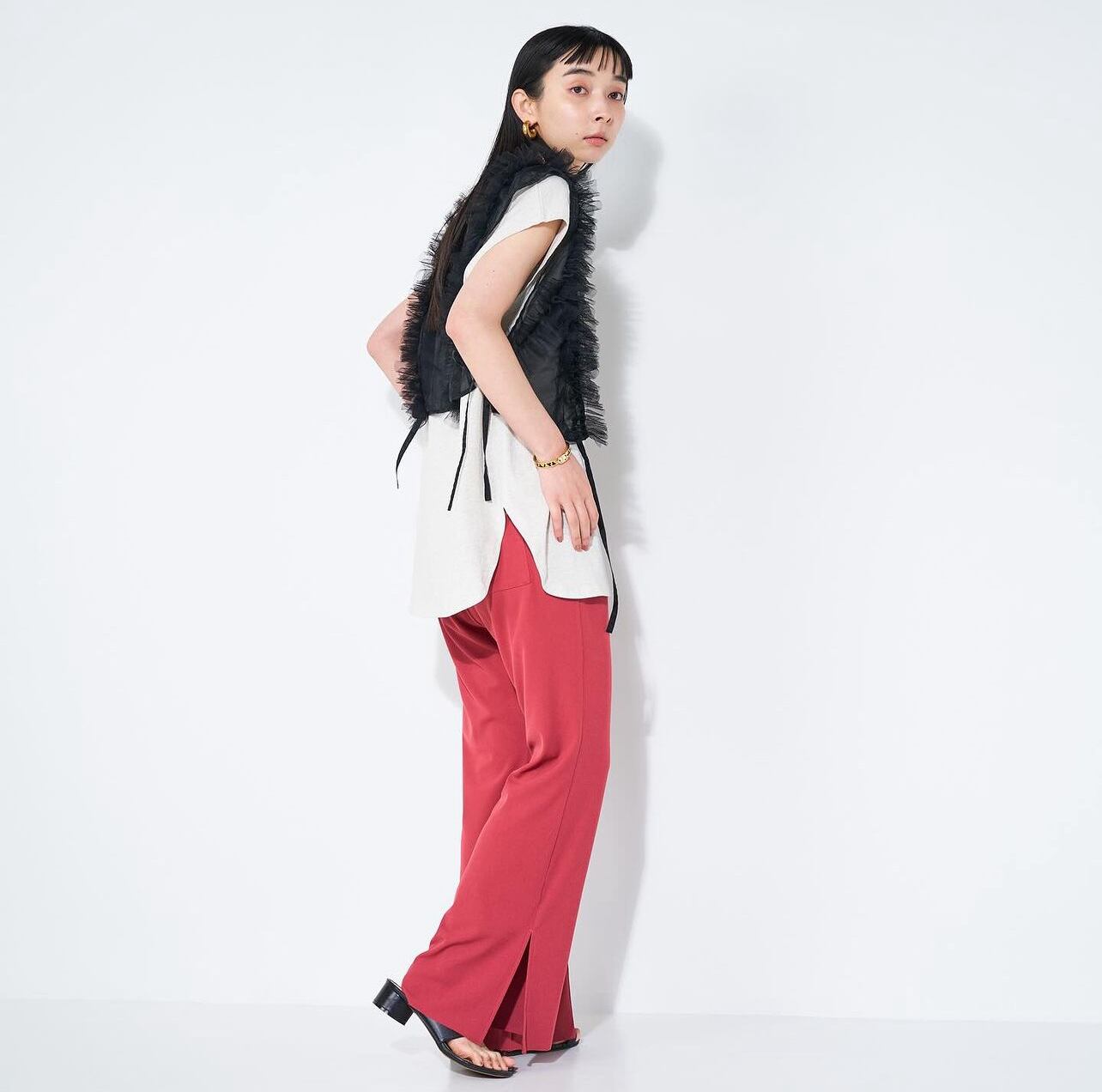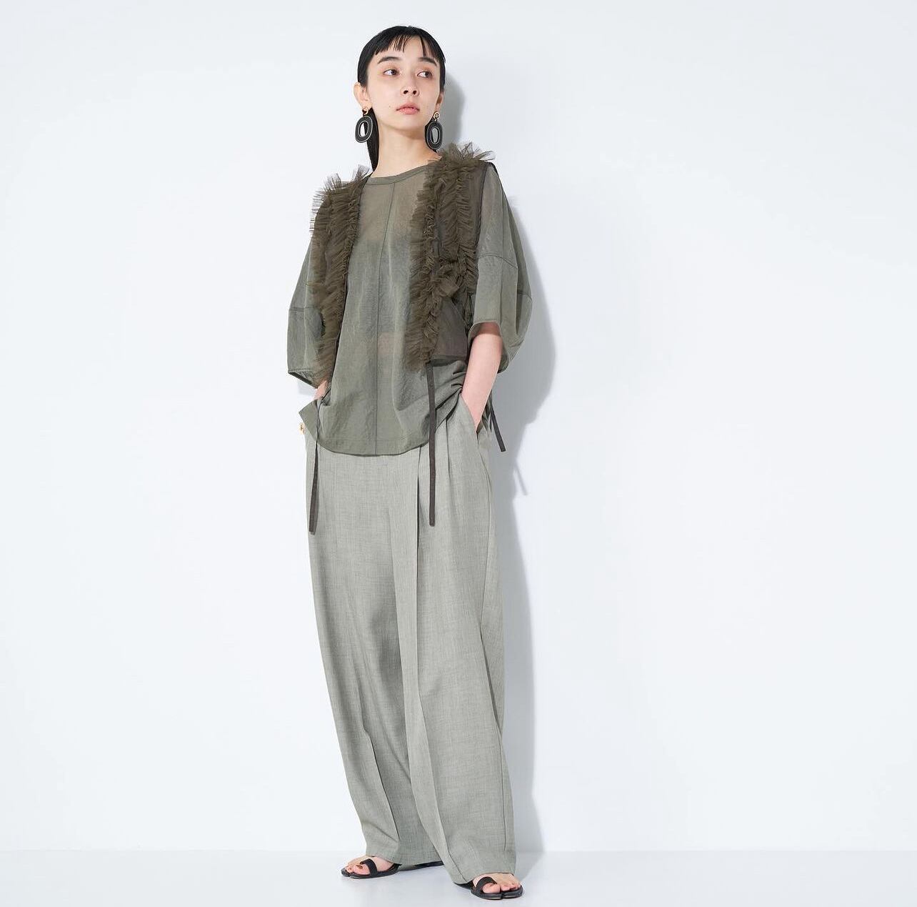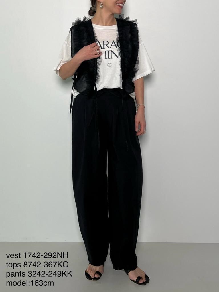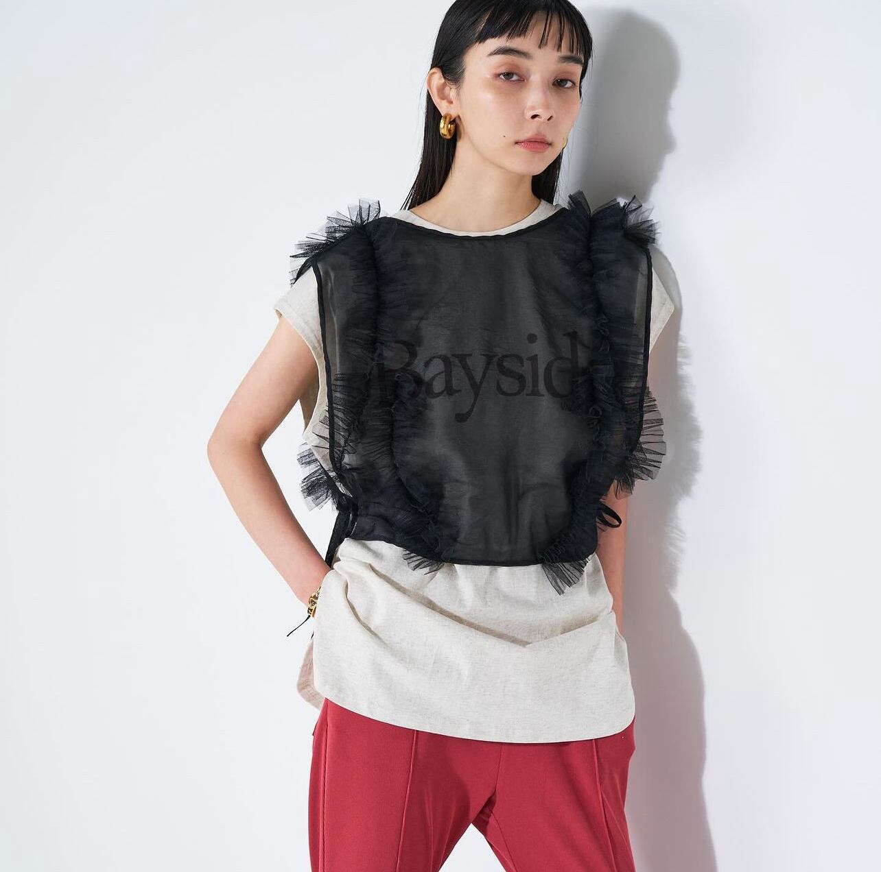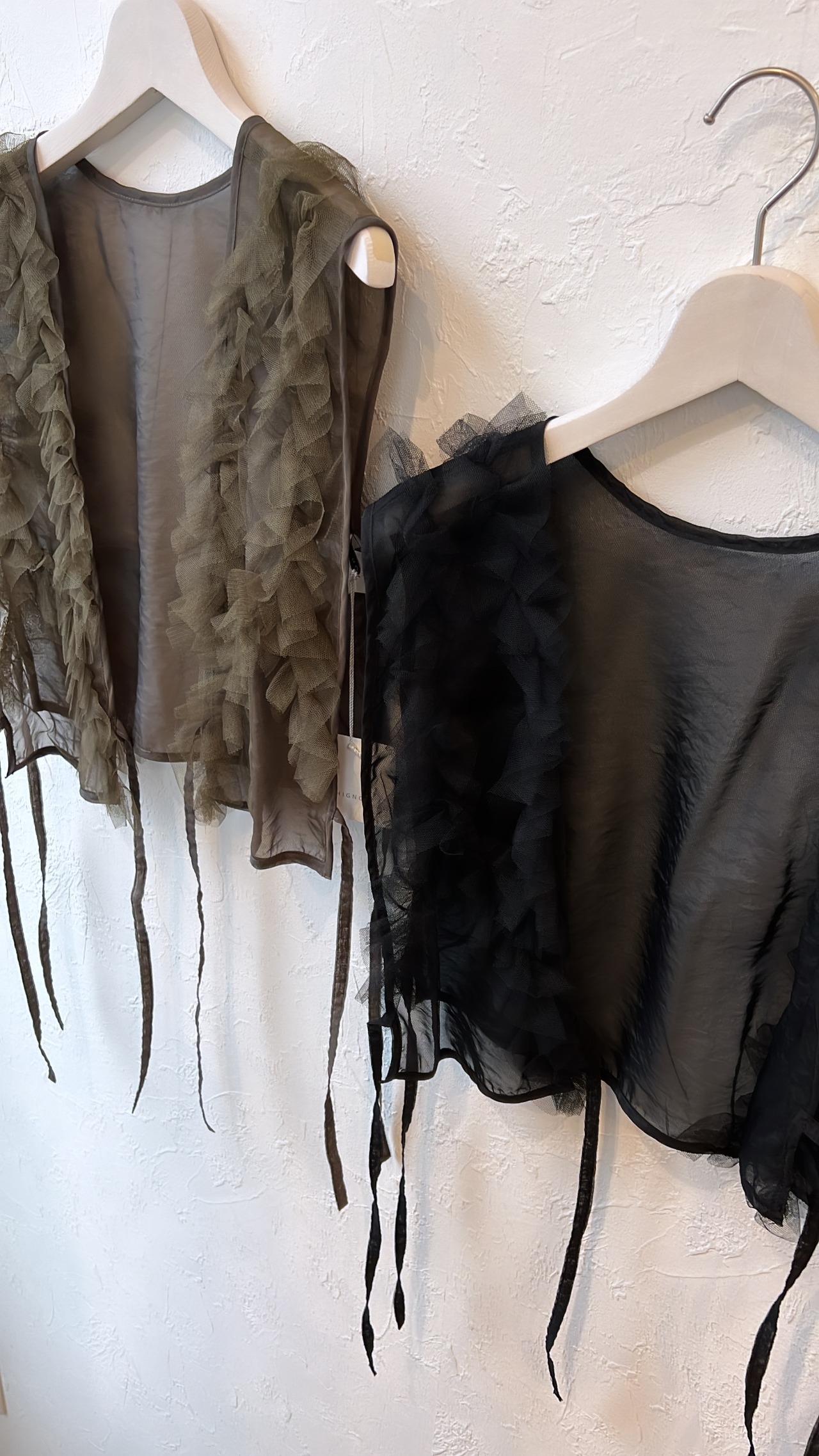 柔らかいチュール素材のフリルを施したベスト。甘くなりすぎない様に柄を組んでいるので子供っぽくならずに、Tシャツレイヤードを楽しんで頂けます。