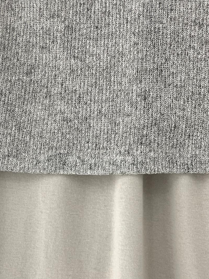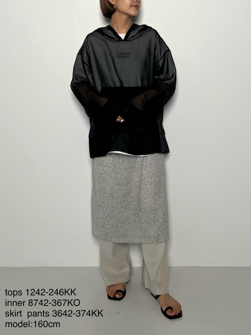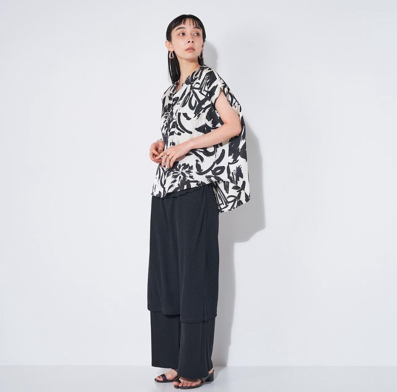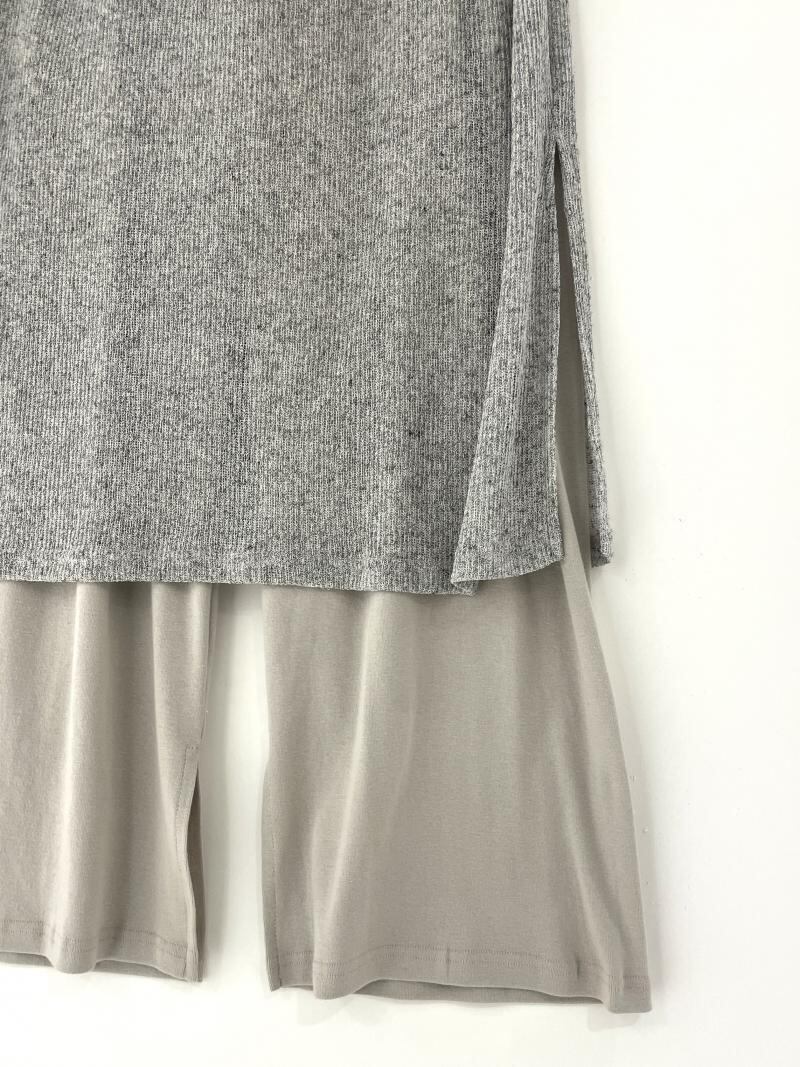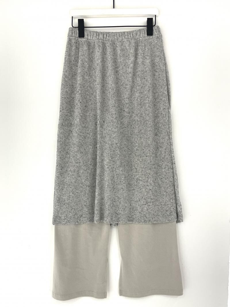 フライスカットソー素材のパンツをウエストでドッキングした、スカートパンツです。