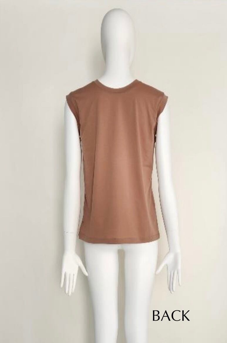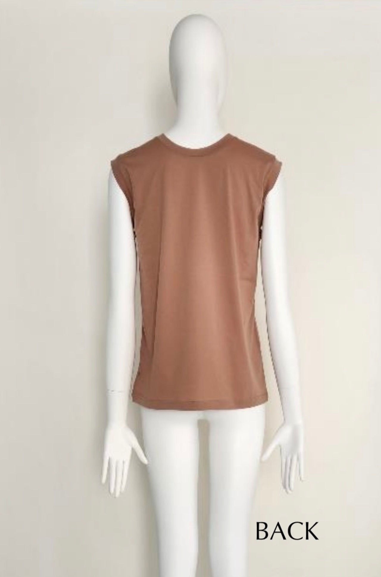 さらっとした肌触りのシアー素材を使用した清涼感のあるノースリーブTシャツ。