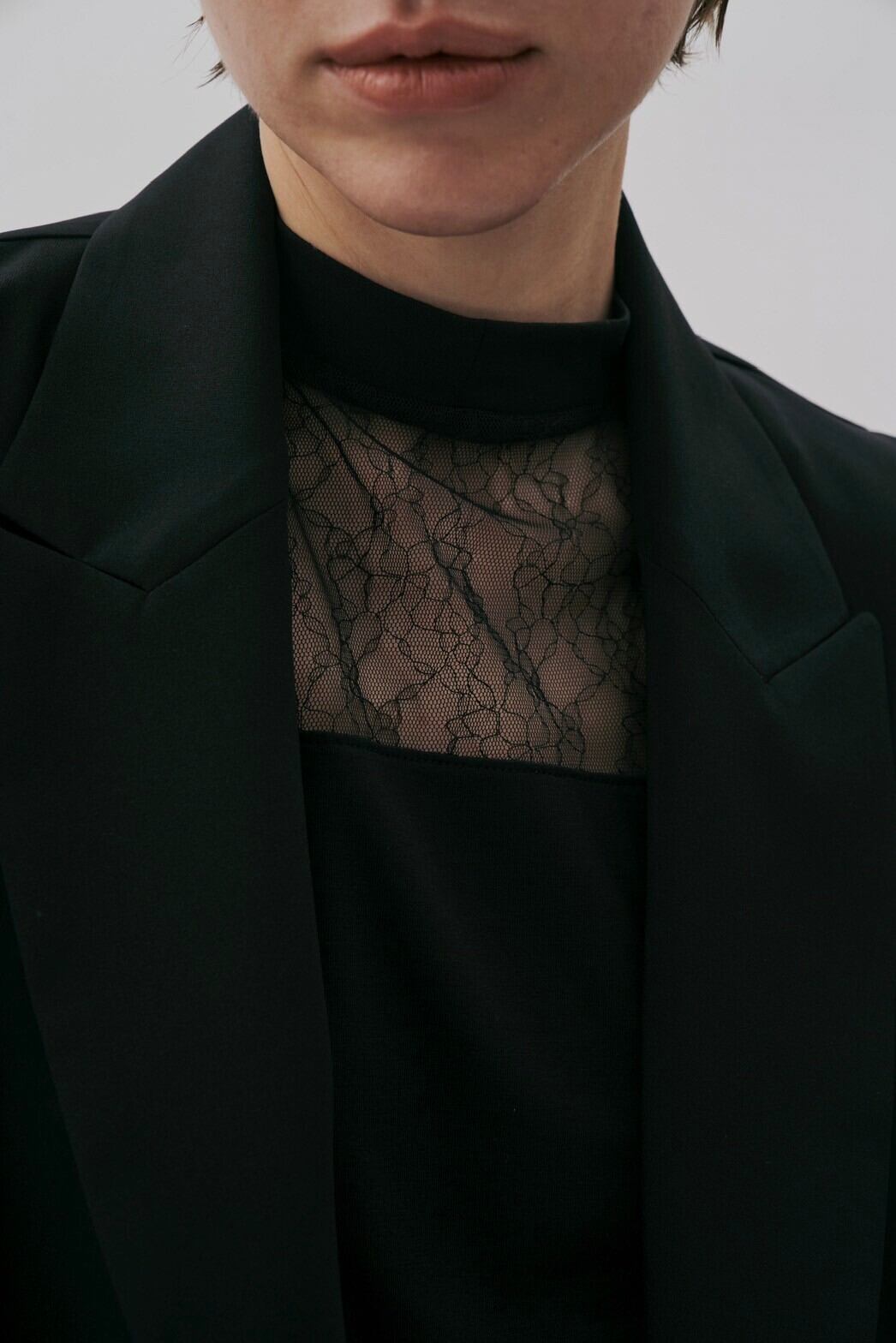 ムです。レースの透け感が美しく、さりげなくデコルテをカバー。過度な肌見せを避けたエレガントな印象に。