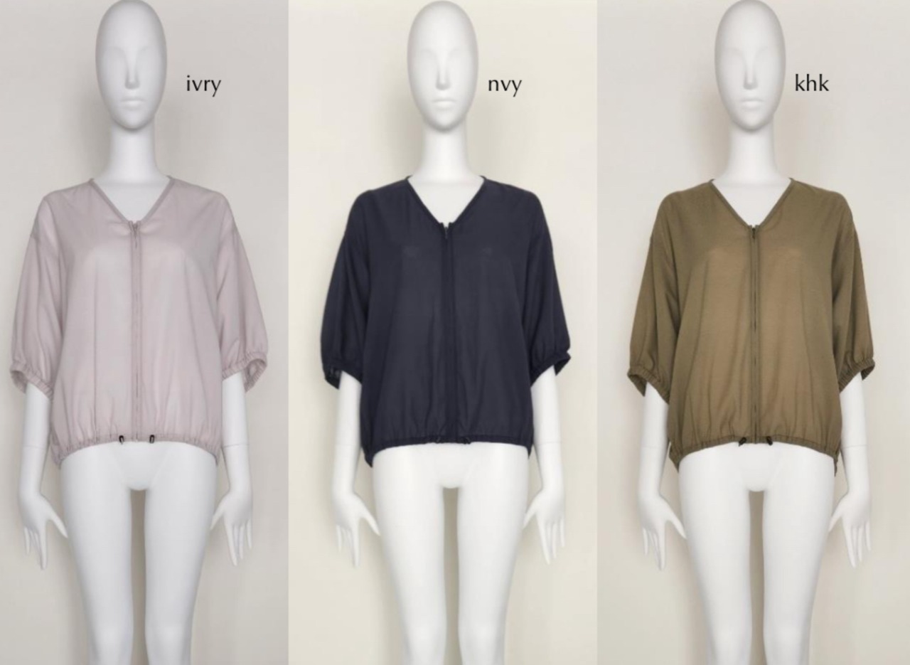 カーディガン感覚で羽織れ、真夏の冷房対策にもオススメ。フロントジップ開き。裾を絞って