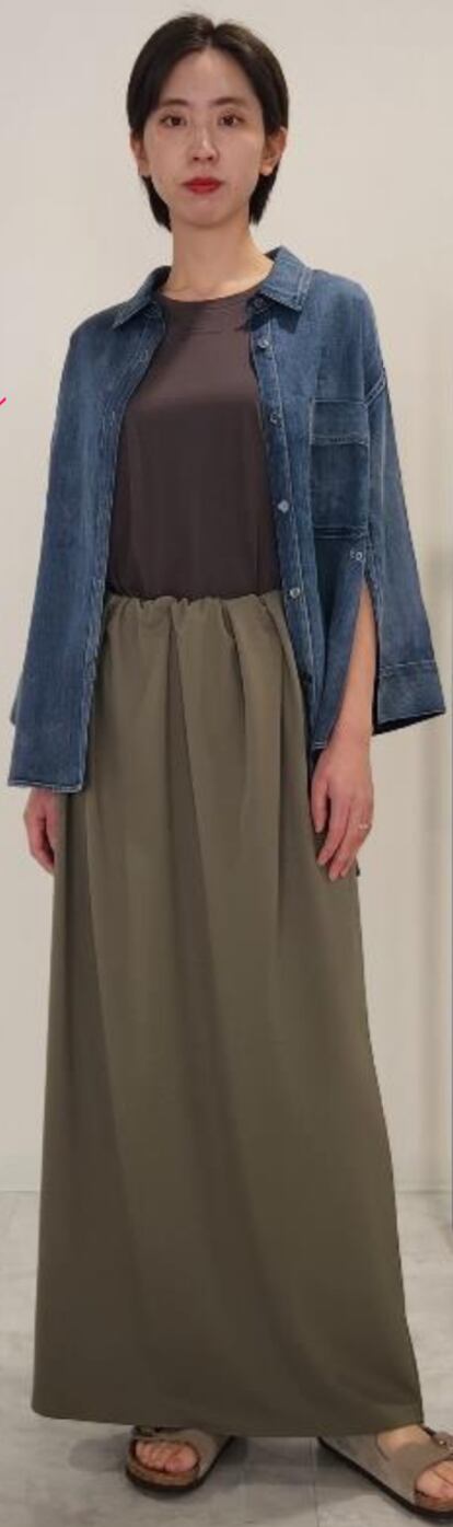 く、肩も少し落ちたデザイン、前後差のある着丈でこなれ感と抜け感をプラス。真夏の冷房対