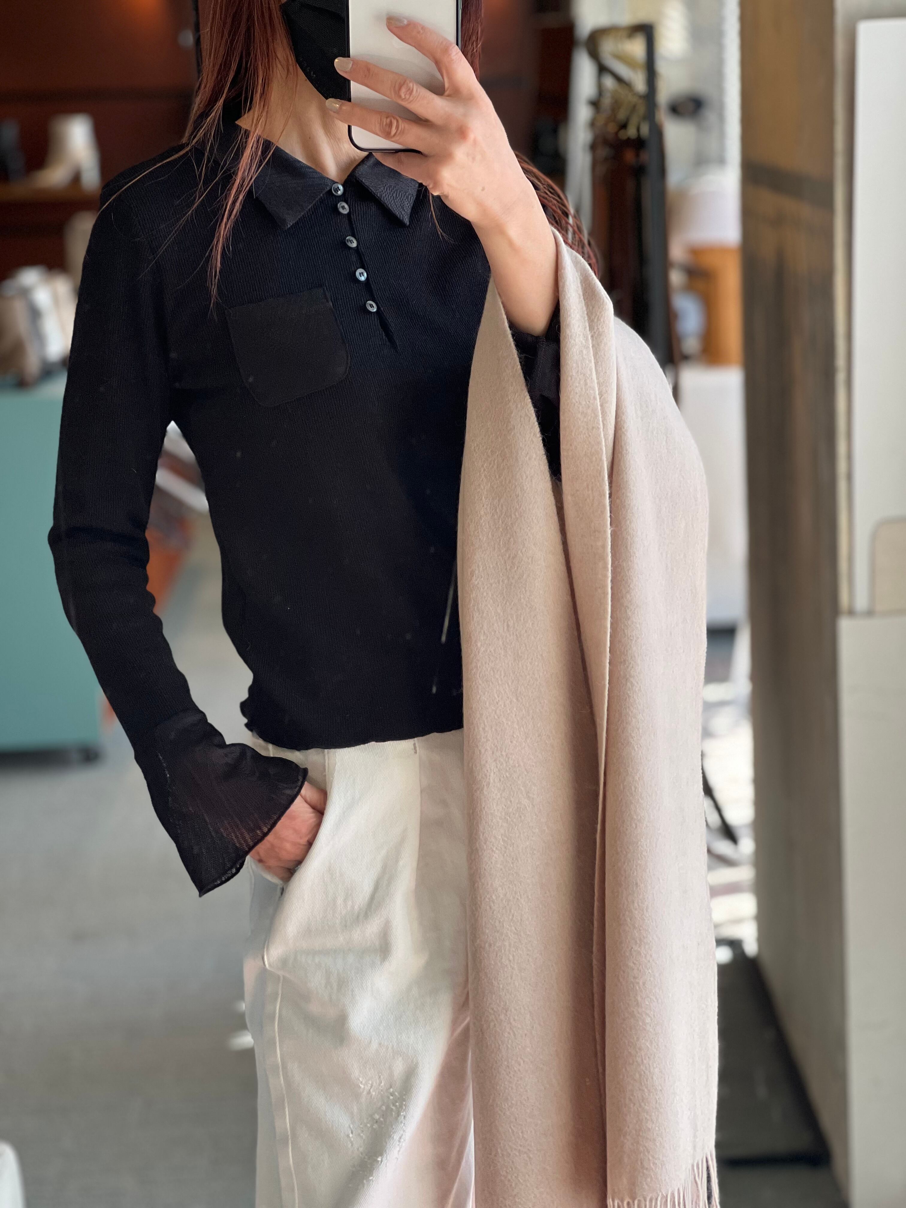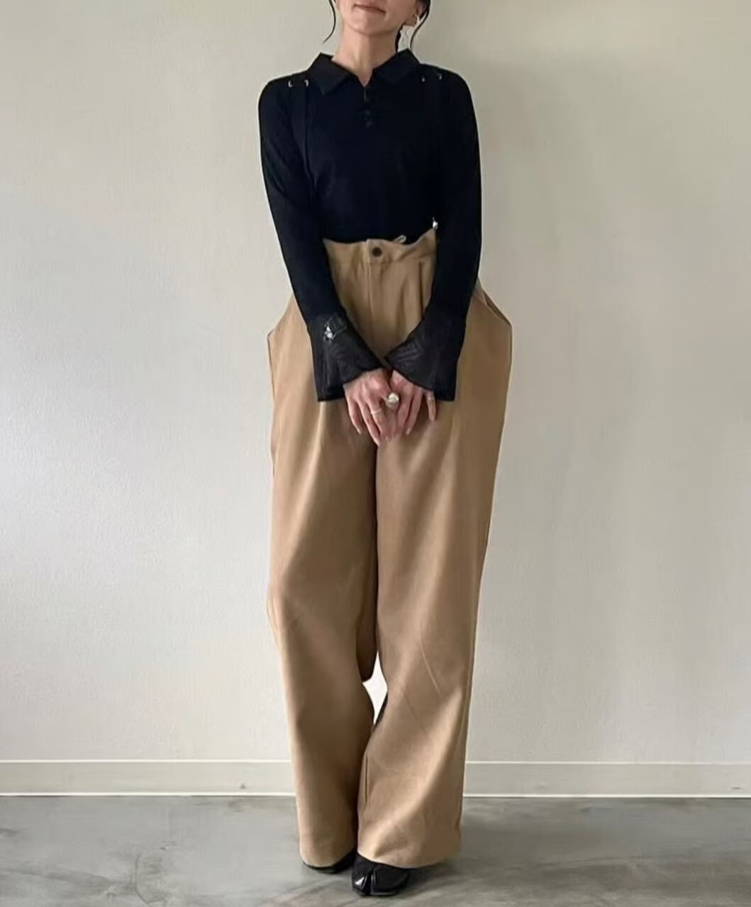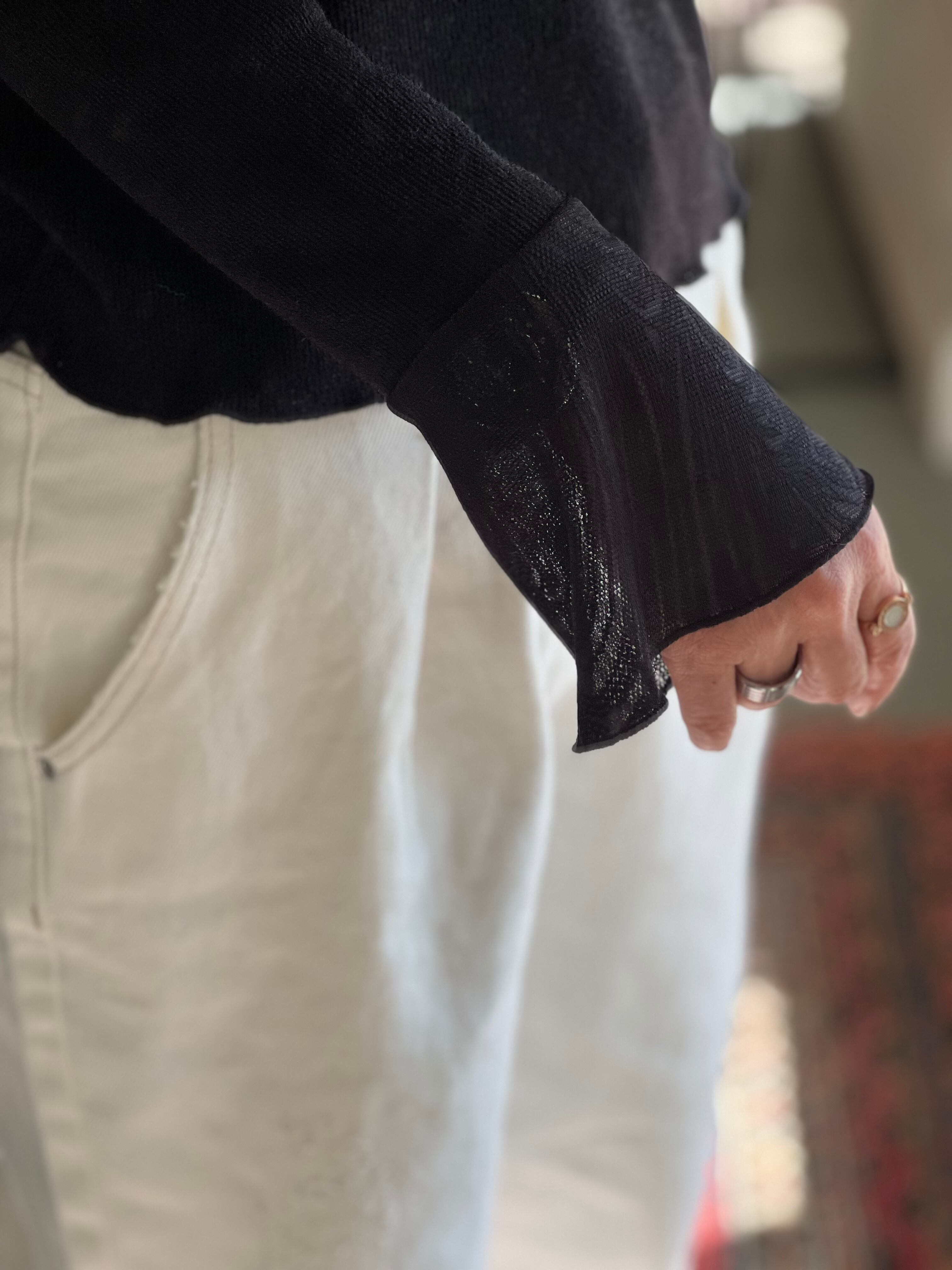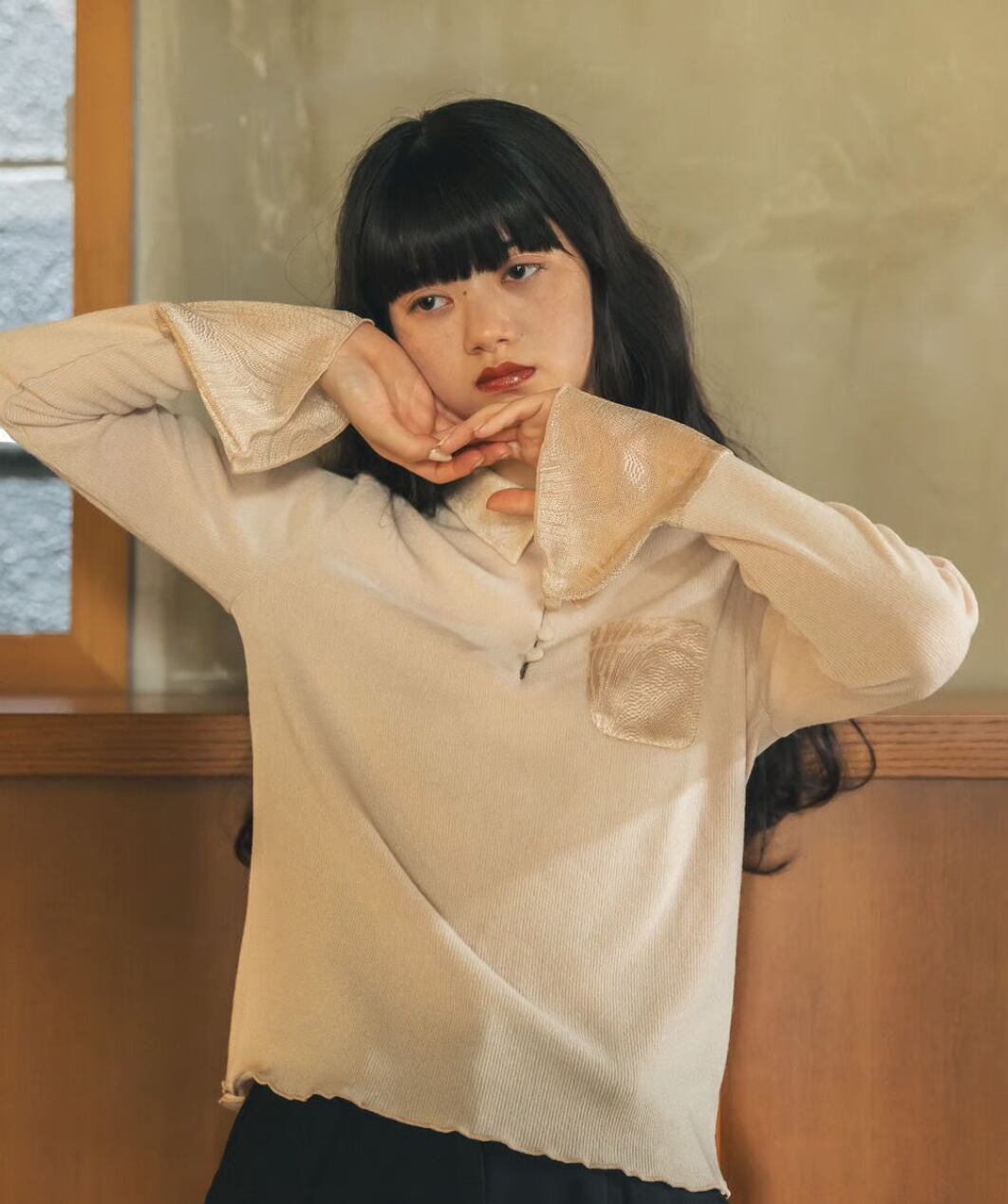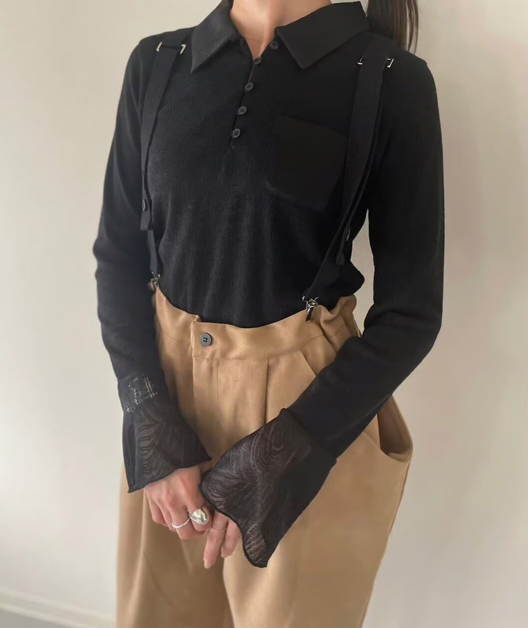 1枚ではもちろん、ジャケットなどのアウターの下に重ね、袖口からシアー部分をのぞかせたスタイルもおすすめです。