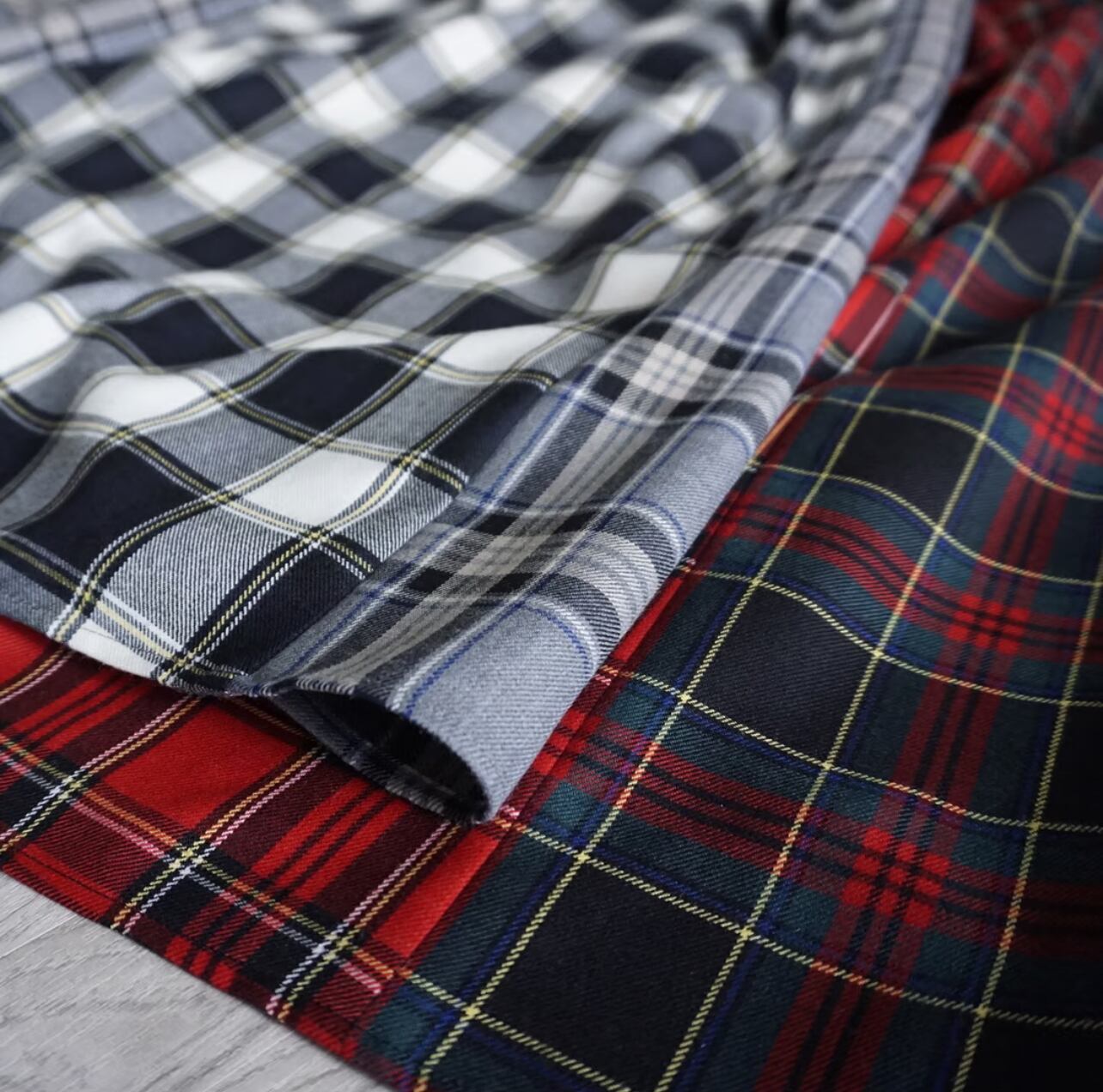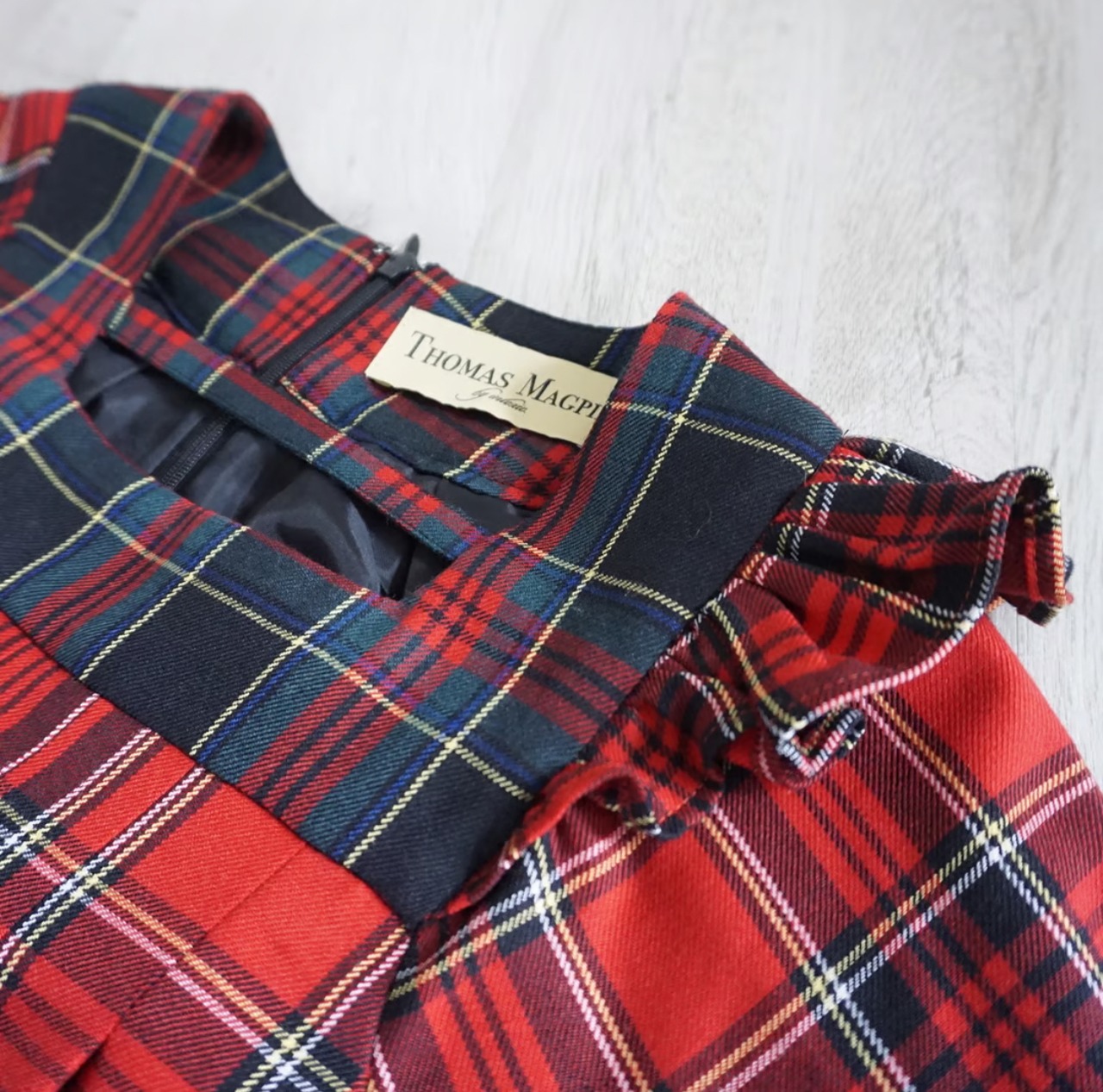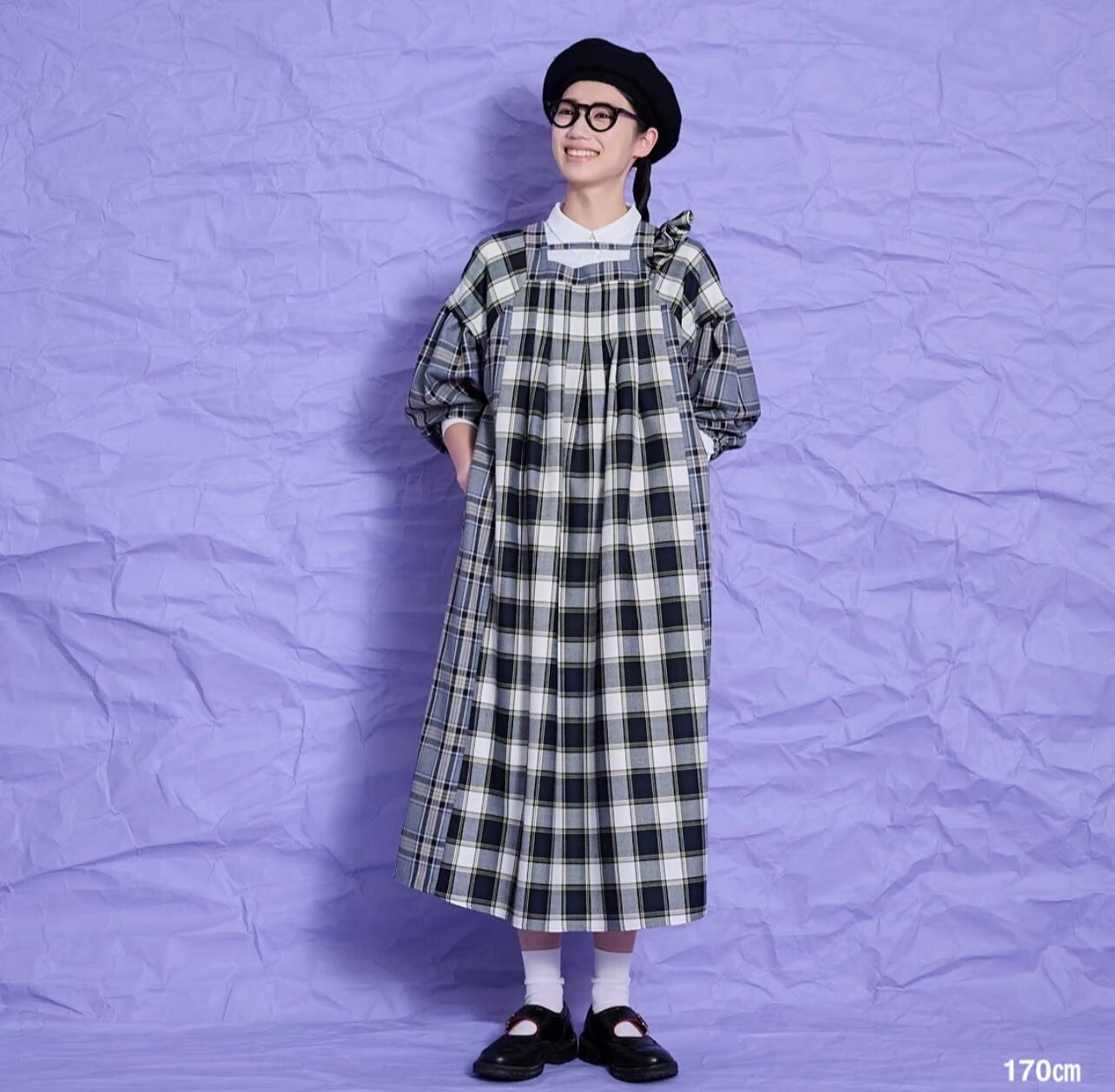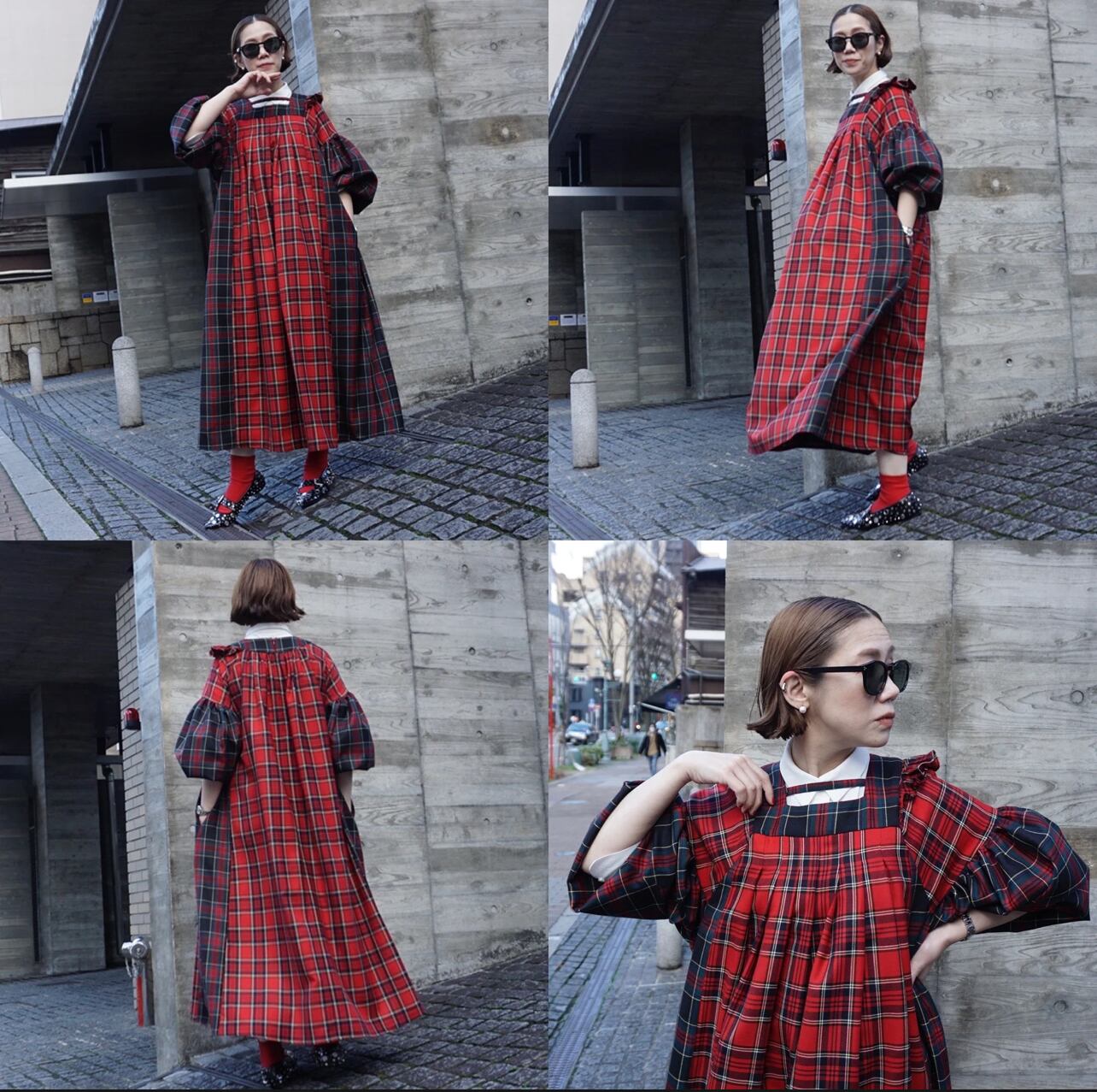 身頃はオーバーサイズでどなたでも着やすいサイズ感です。上に、同時に販売しているテーラードジャケット(ヘリンボーン、金ボタン)も合わせて着る事ができます。特にレッドに紺色の金ボタンのテーラードジャケットが好相性。またレザーライダースを合わせても良いかなと思いました。今回のサブのビジュアルとして使っていて、とても気に入っています。タータンチェックは割と派手な印象があるので、お好みを問うかと思いますが、私はロイヤルスチュアート(レッド)のドレスがどうしても欲しくて、長年作りたいと思っていたドレス。日本製の良い生地のため、広がりあるデザインで用尺たっぷりになってしまい、少しお値段が高くなってしまいましたが、非常に気に入っています。流行とは関係なく、ずっと欲しかったチェックのワンピースです。やっと作ることができました。少し派手なカラーではあるので、全ての方がお好きだとは思いませんが、とてもよくできています。お好みの方にはおすすめしたいと思っています。