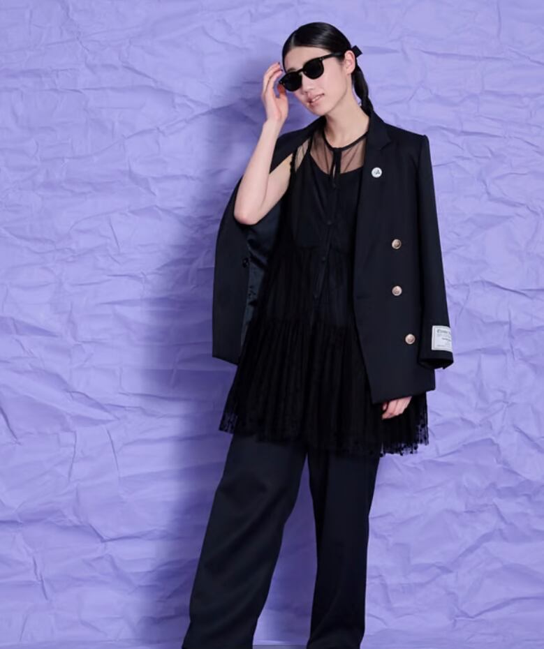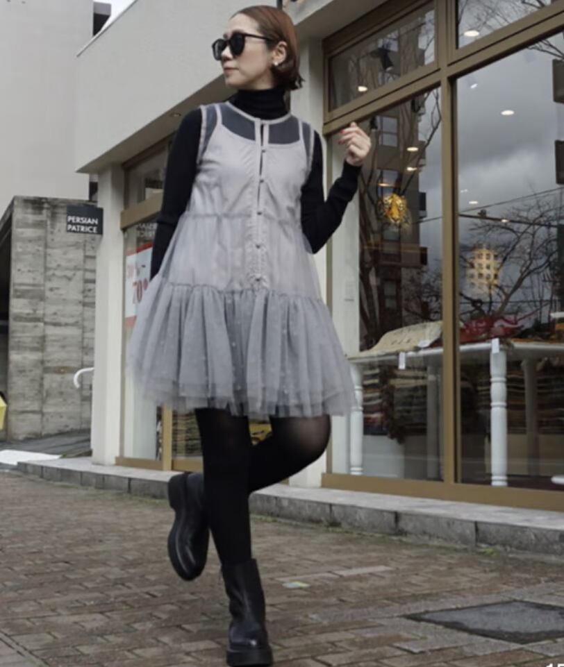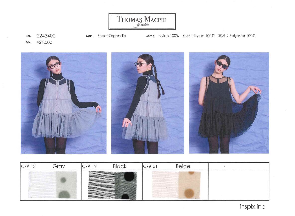 9月頃の入荷でシアードレスを作りました。ジャケットなどのインナーに着たらボリュームあるチュールが下から出るようなトップスがいいなと思いデザインしました。トップにインナーを重ねているように見えるシアーなショート丈のミニドレスです。これはかなり着丈が短いのでボトムにパンツやスカートを入れて重ね着が楽しめる様にしています。身頃は下に下がる程にギャザーを寄せています。一番下のチュールは3枚重ねにしていて、そのうち1枚だけドットのチュールにしています。段差をつけて透け感が下にいくほどにでるようにしています。その重なりも絶妙にしていて、とても可愛く仕上がっています。重なったボリュームのあるチュールがボワボワとしていて特徴的なドレスです。今回のメインビジュアルにもなっています。