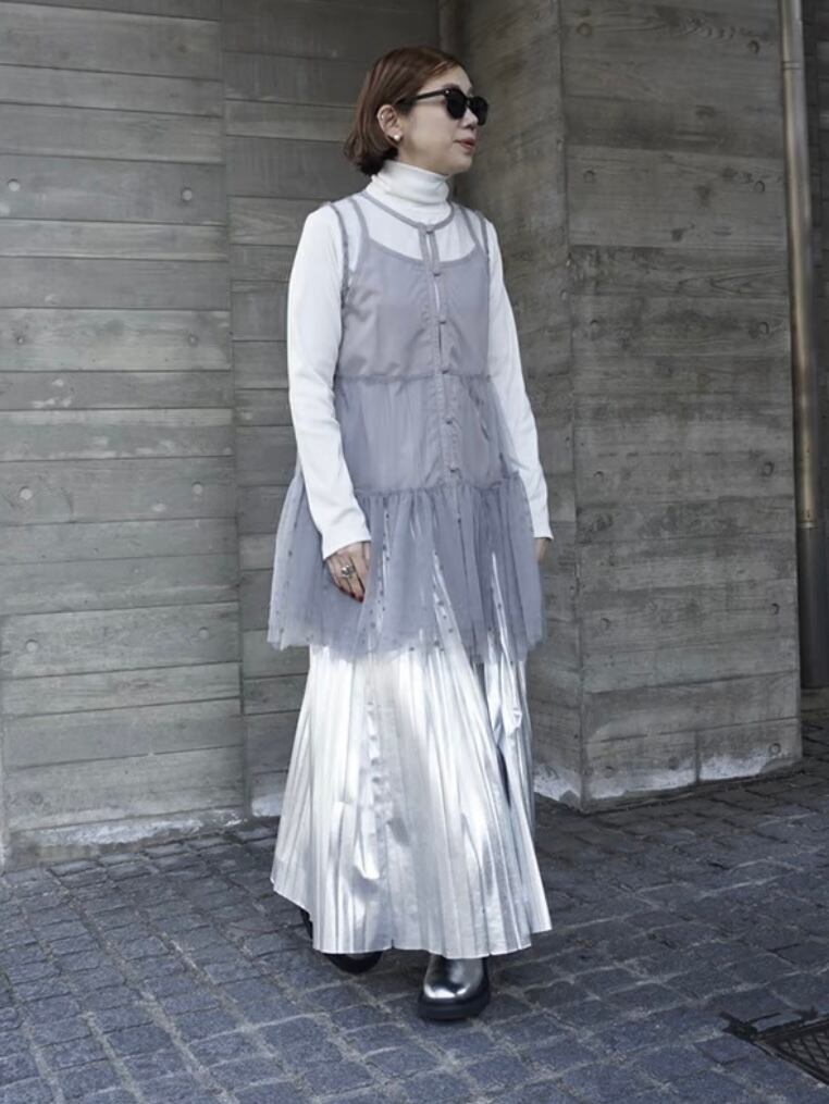 同カラーでグレーのドットチュールのシアースカートを作りました。セットで着用も可愛いと思います。透け感が気になる方は中にスカートやパンツ、タイツなどを合わせて着てみてもらいたいと思います。